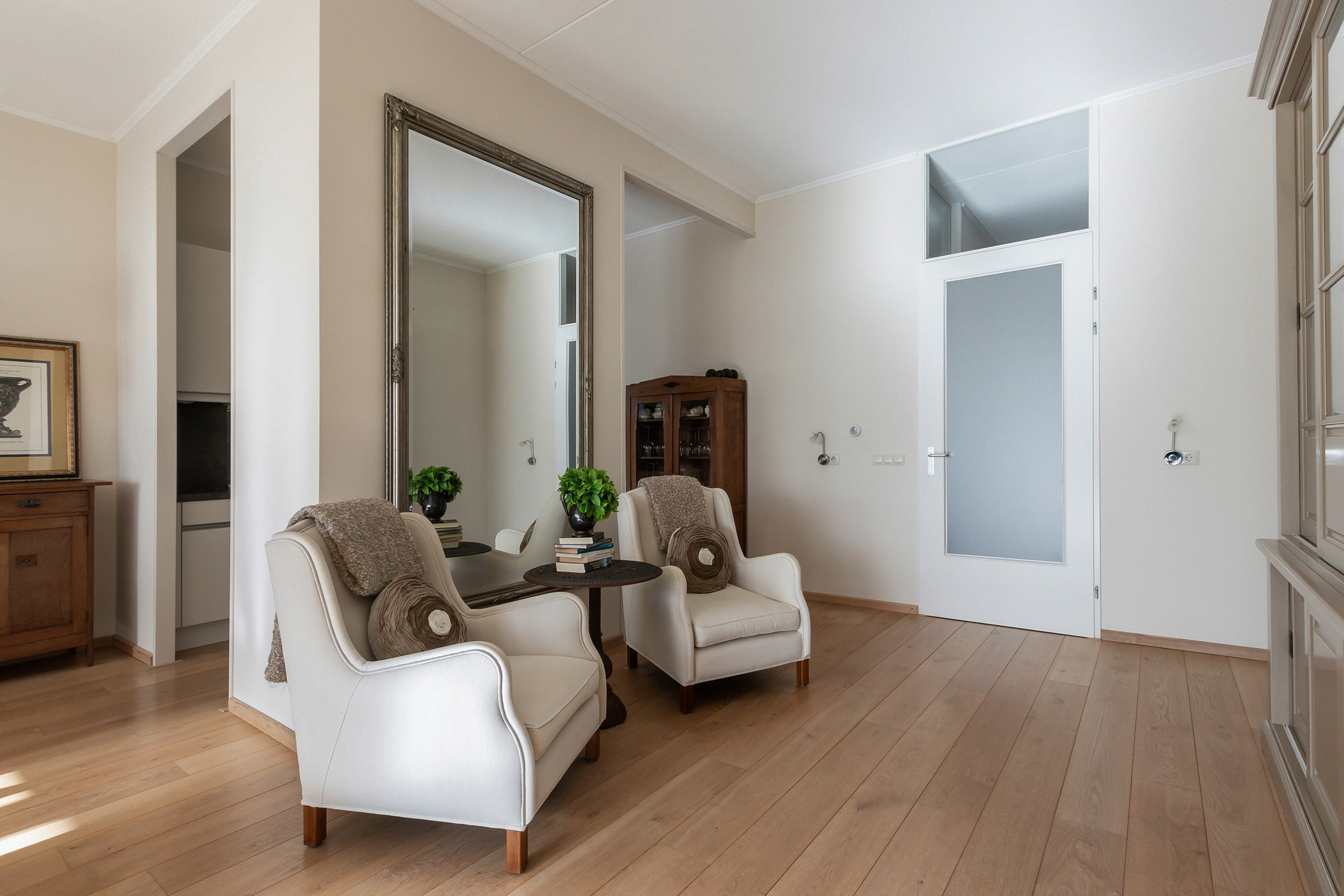 - Glad gestucte wanden. Spachtelputz plafondafwerking en houten vloerdelen.