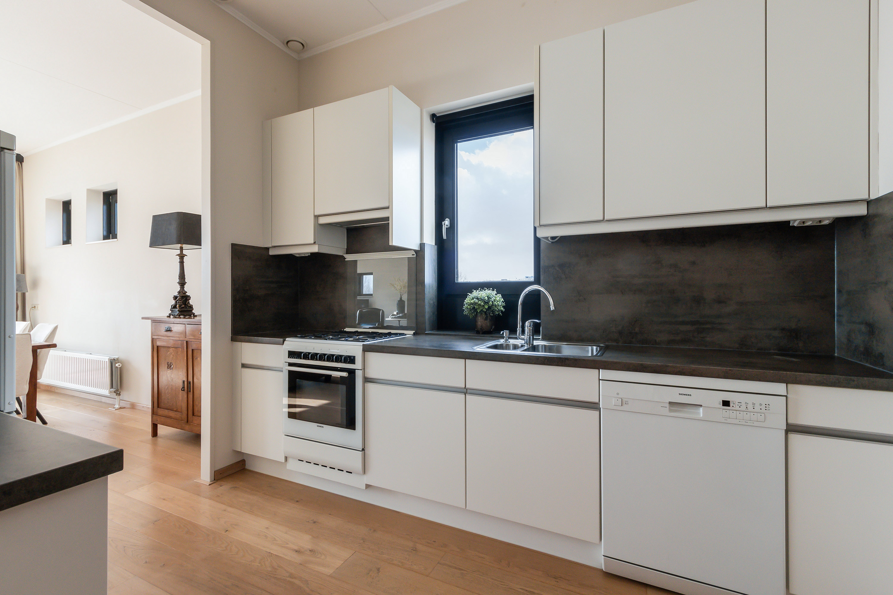 - Halfopen keuken voorzien van Siemens apparatuur met 4-pits gaskookplaat en afzuiging. Losstaande vaatwasser en koelvriescombinatie.