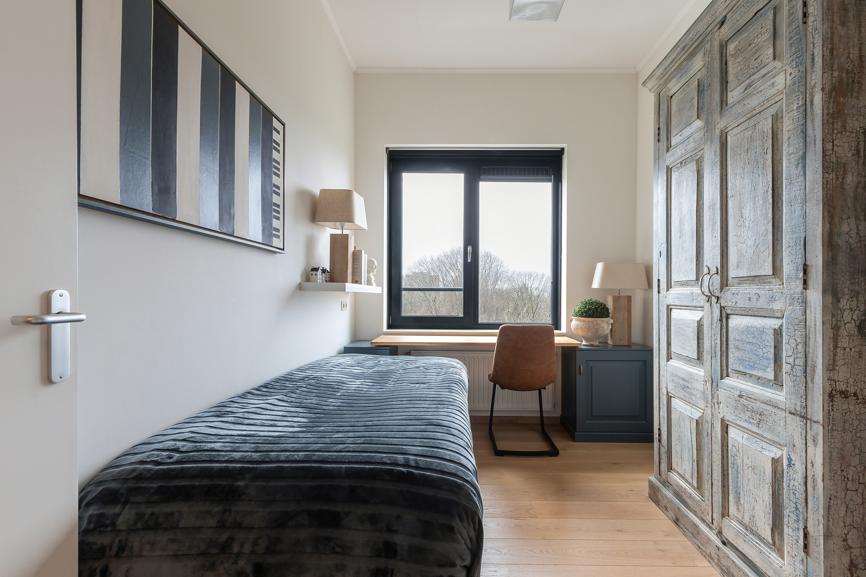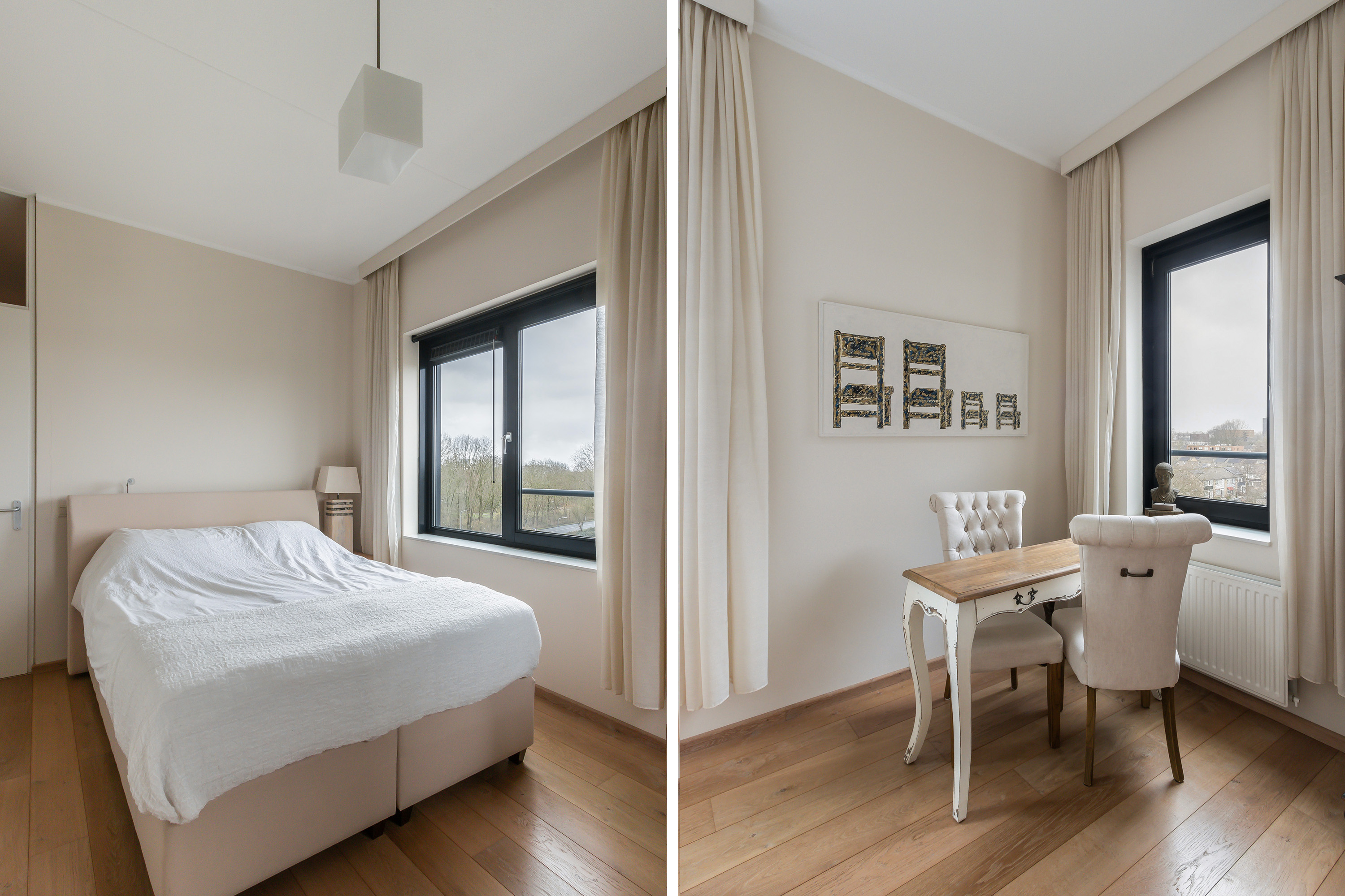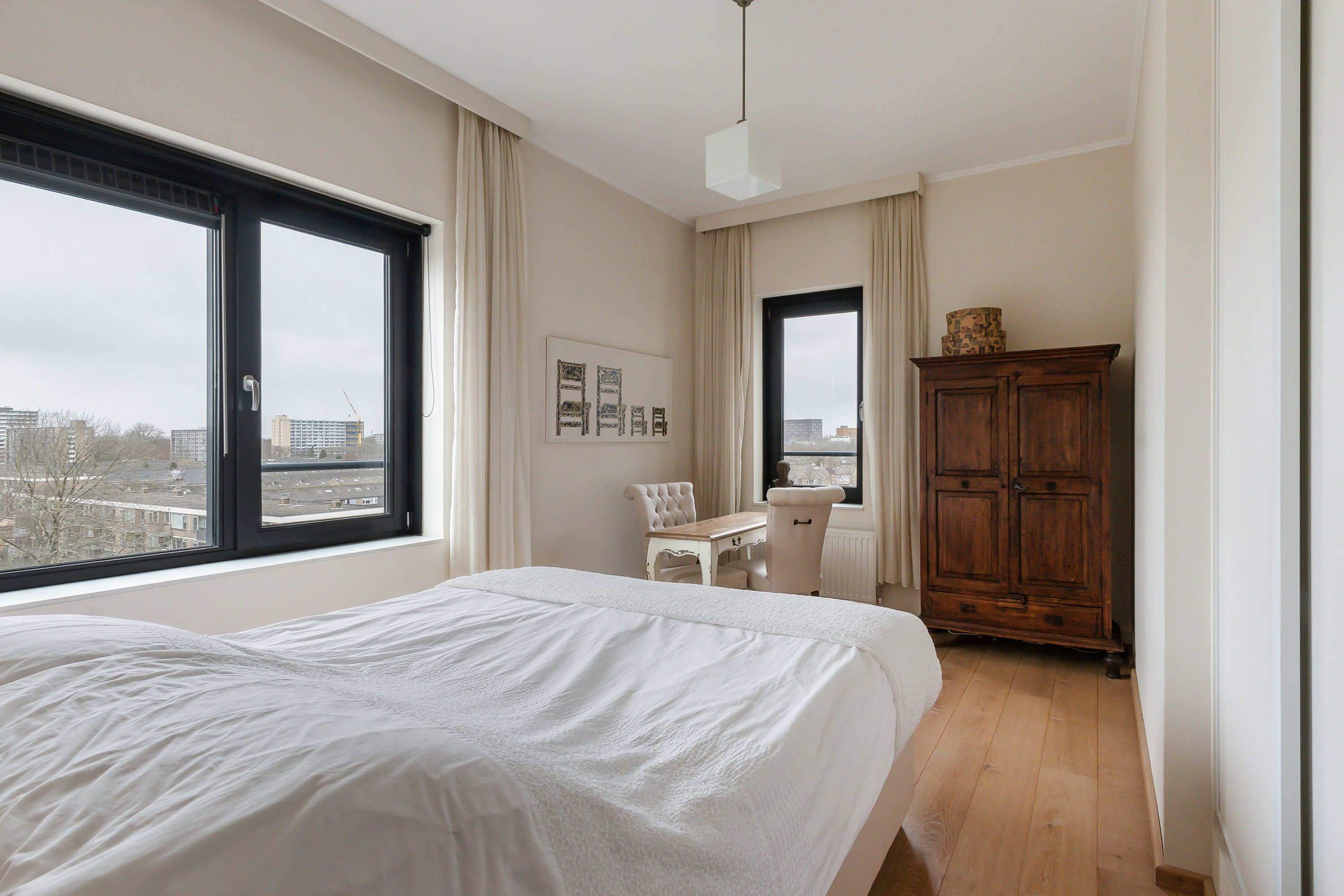 - Slaapkamer 1, gelegen op de hoek met vrij uitzicht aan twee kanten. Ca. 14 m²).