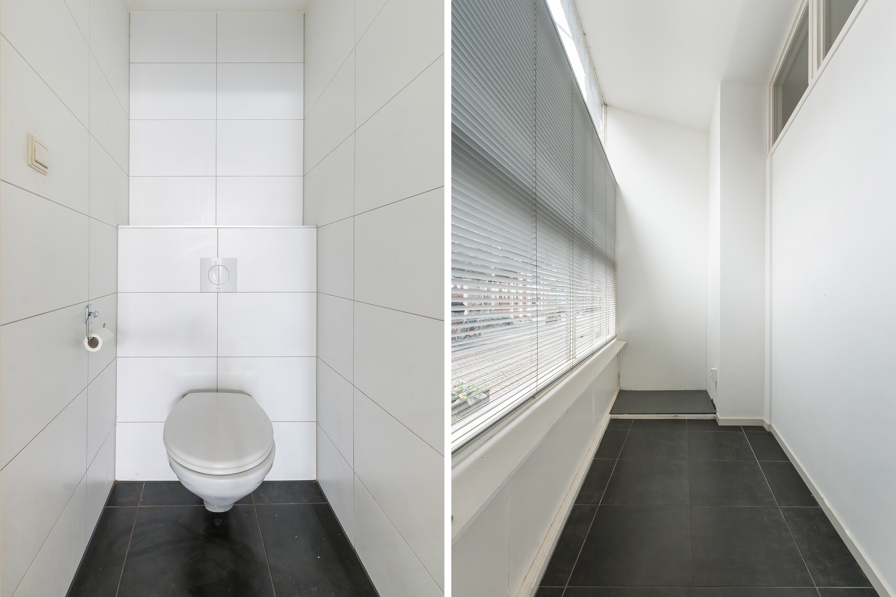 - Modern toilet met geheel betegelde wanden, wit sanitair, hangcloset;
