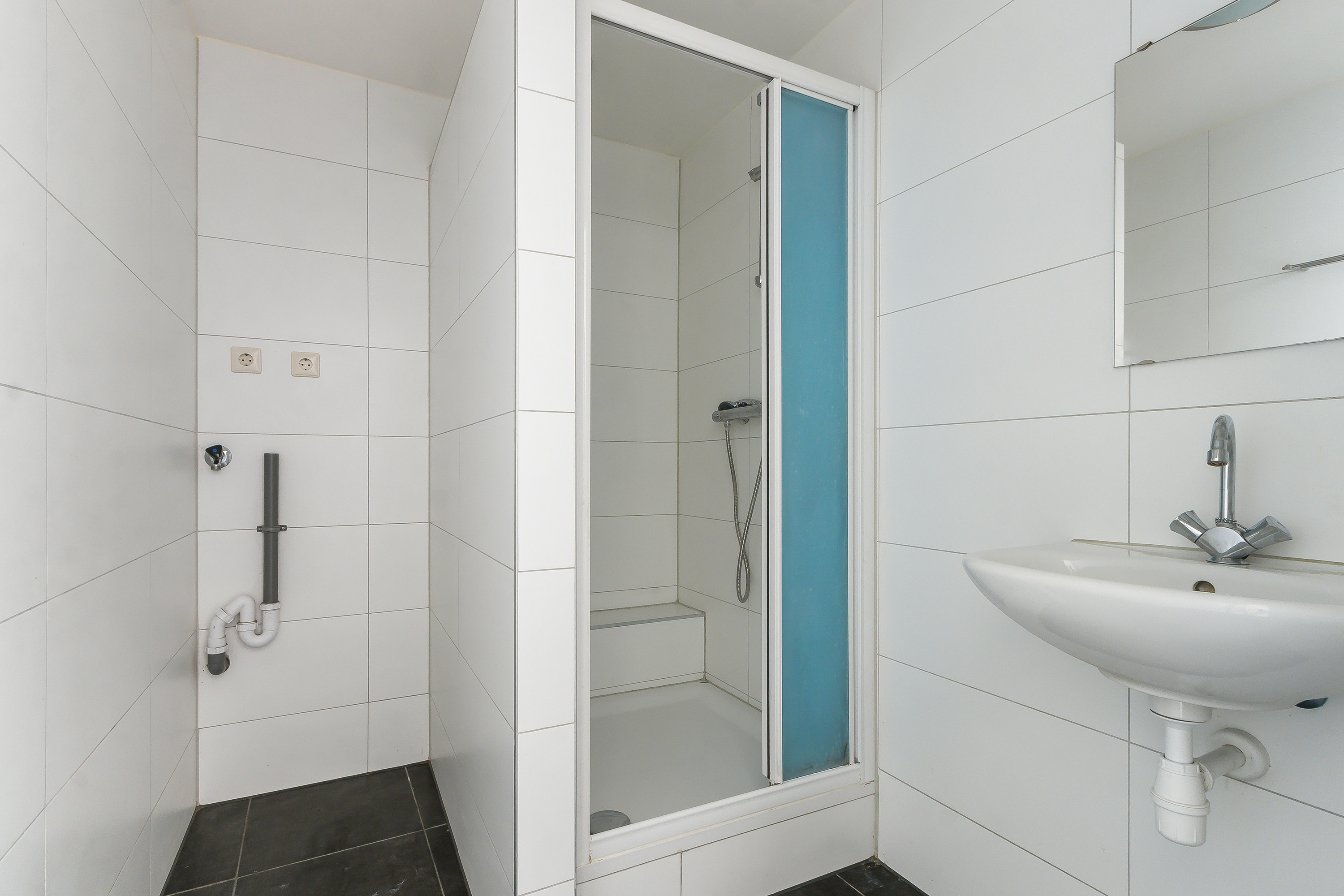 - Moderne badkamer met geheel betegelde wanden, wit sanitair, wastafel, douchecabine met thermostaatkraan en een nis t.b.v. de opstelplaats wasmachine;