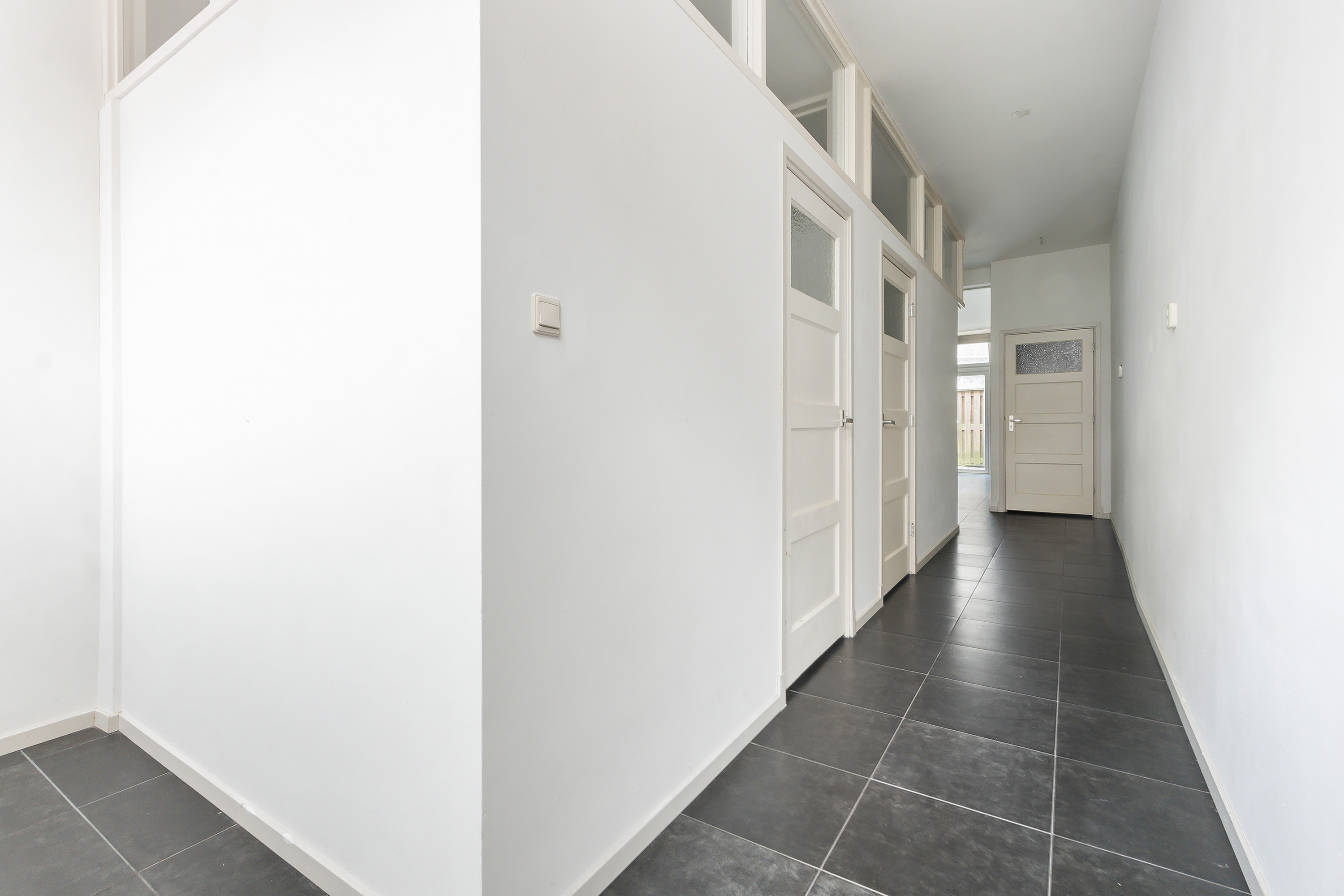 - Entree, L-vorm gang met glaspui straatzijde, meterkast, toilet, deur naar besloten (slaap-/ hobby)kamer, deur naar slaapkamer, deur naar badkamer en deur naar woonkamer;
