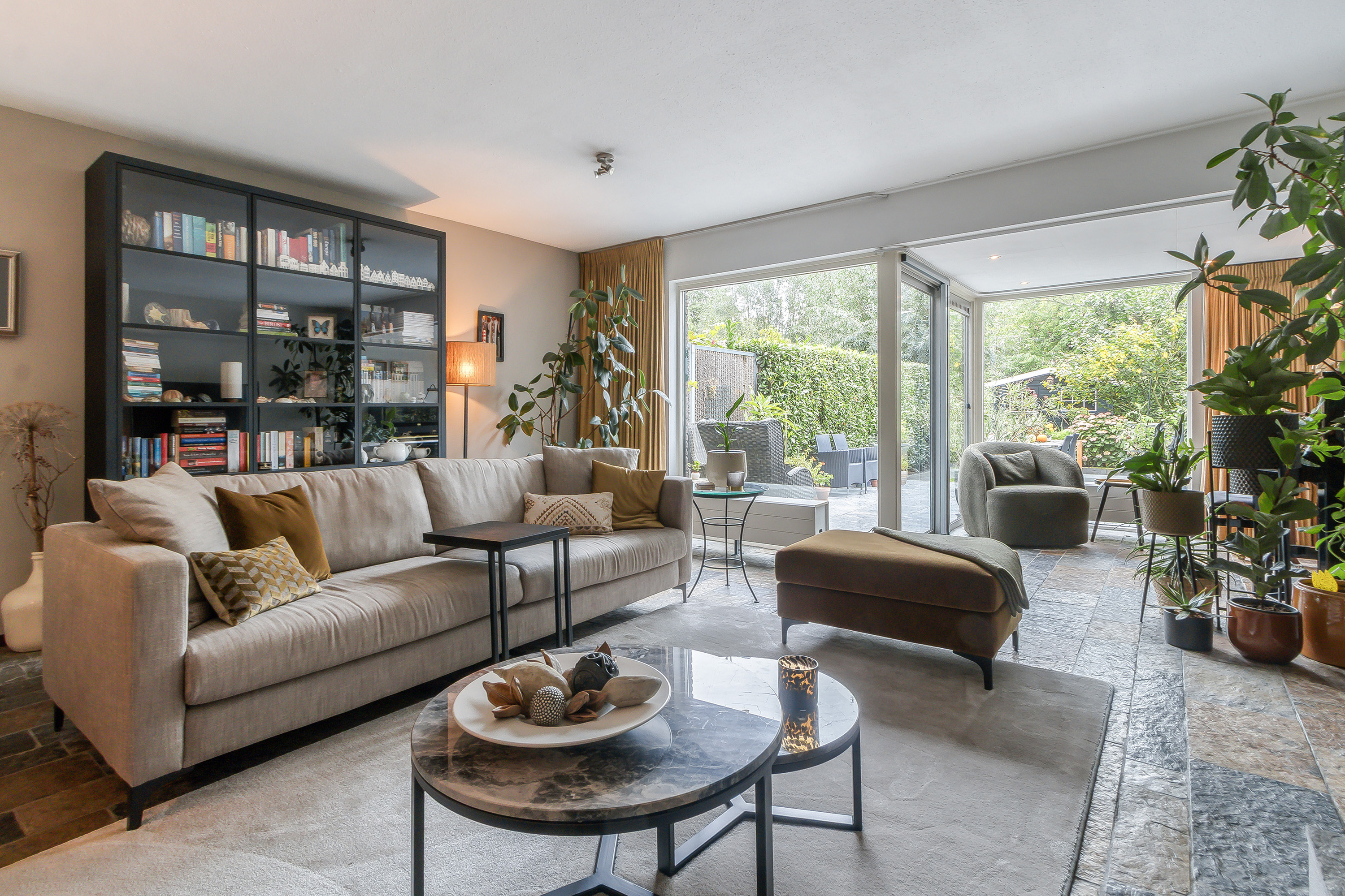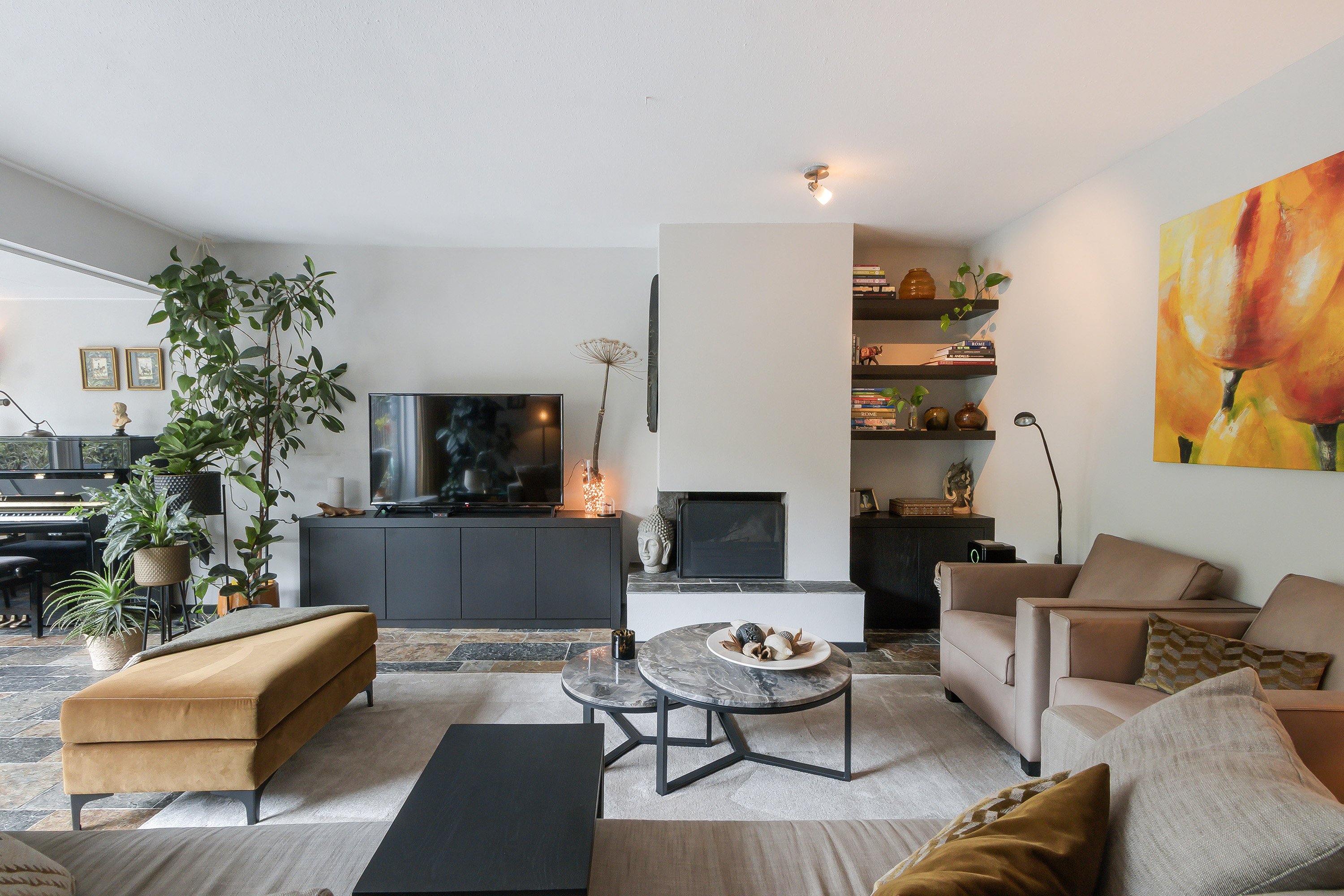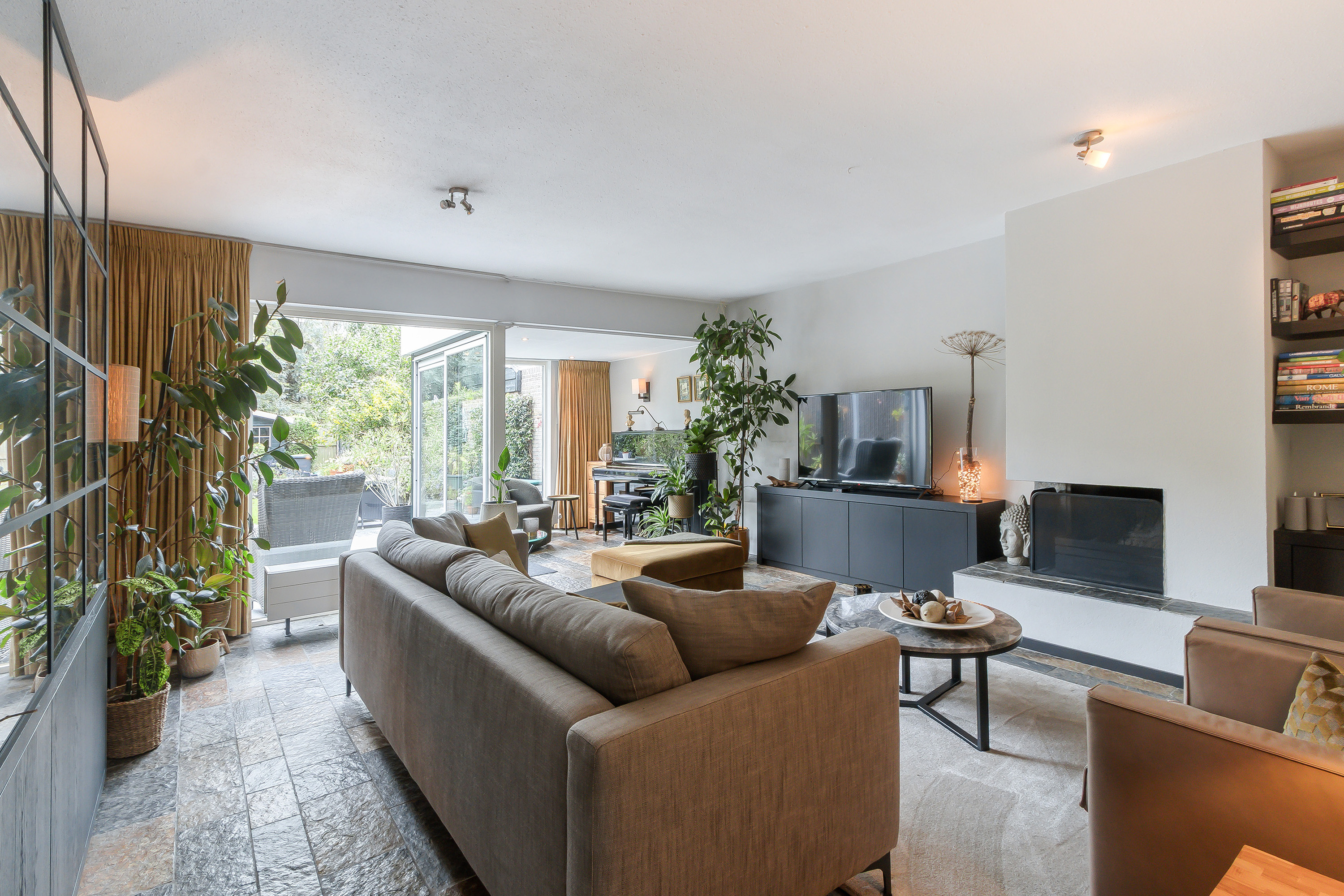 - Tuingerichte woonkamer met veel lichtinval dankzij de grote raampartijen en een aluminium schuifpui met isolatieglas naar de tuin. De woonkamer is voorzien van een sfeervolle openhaard.