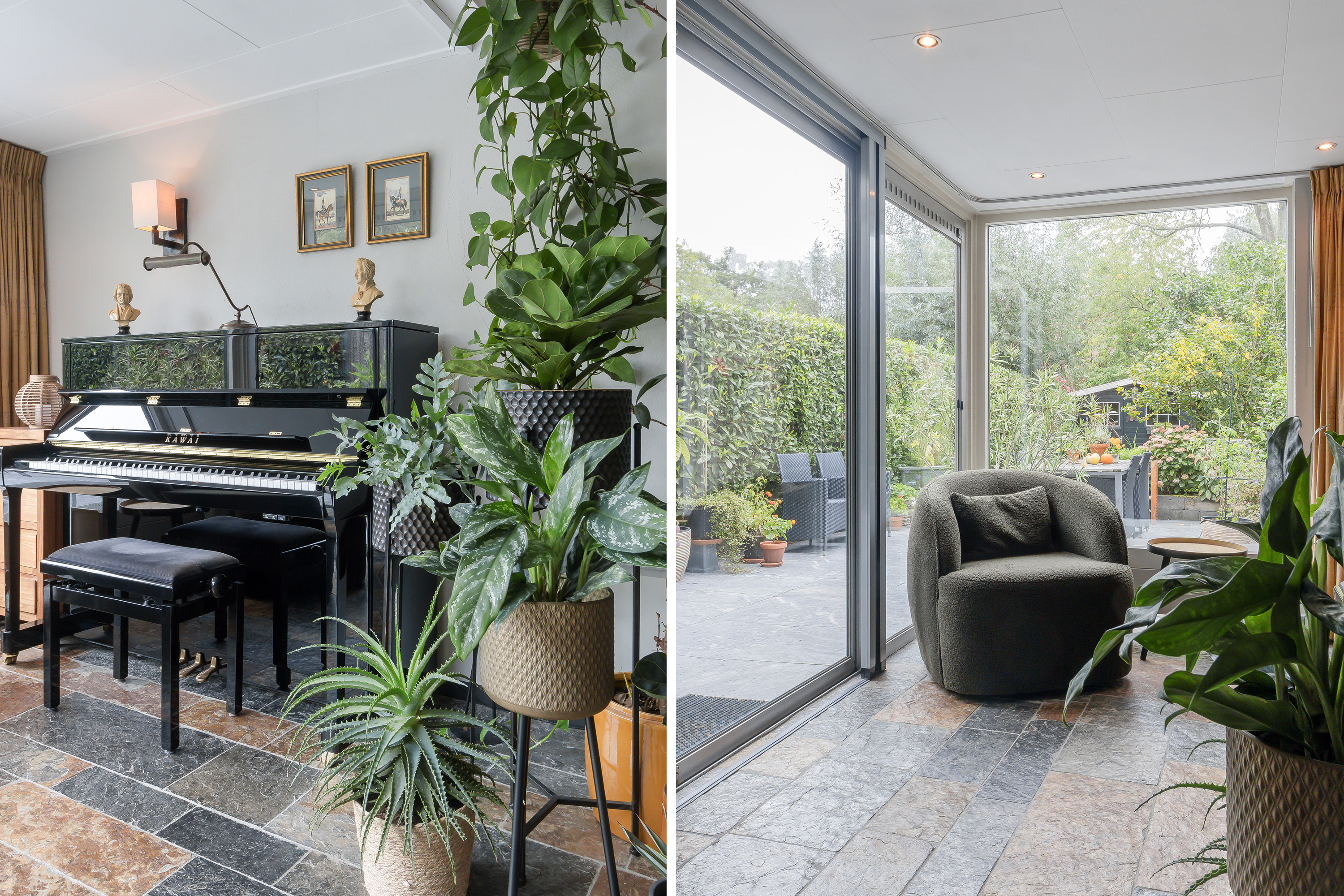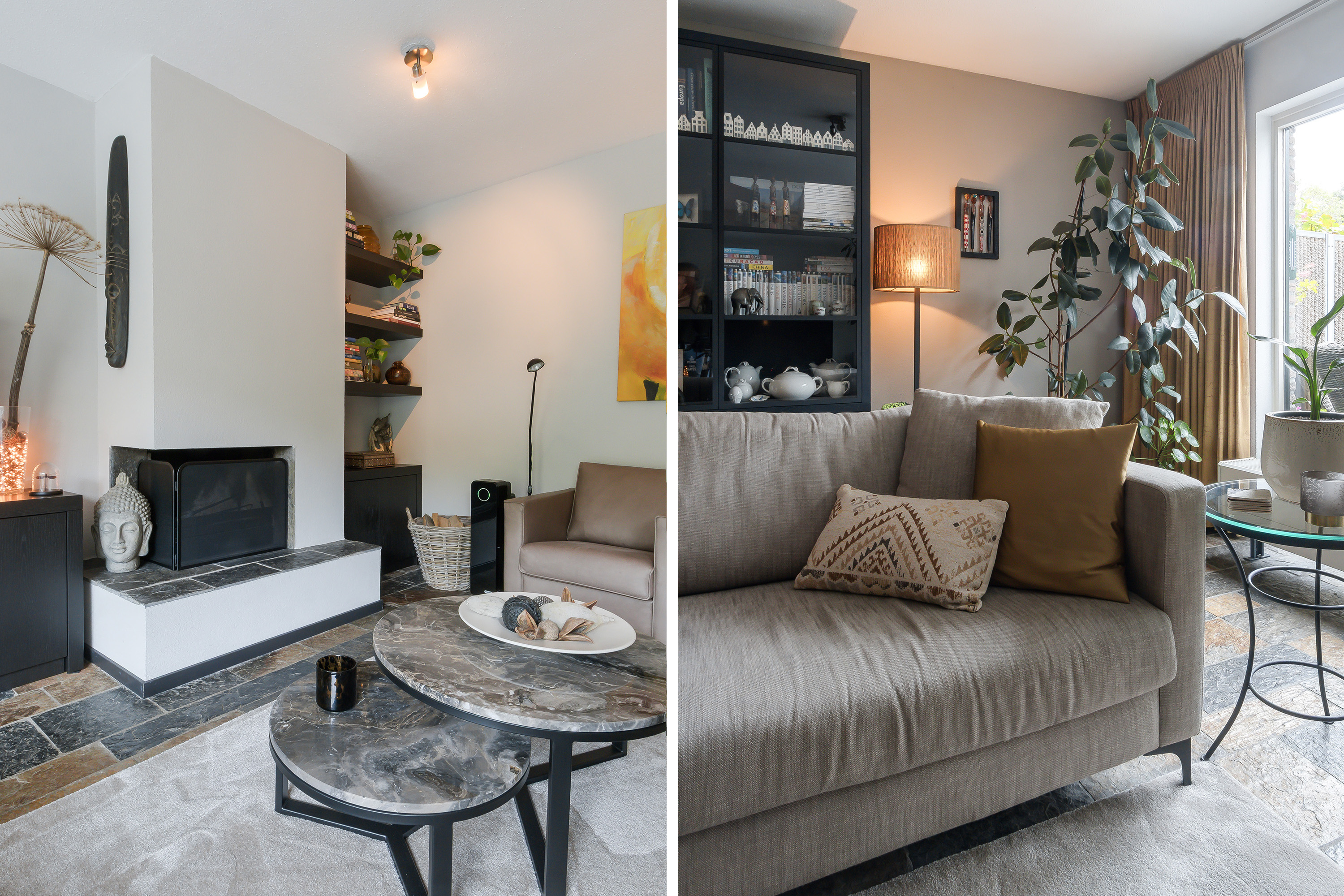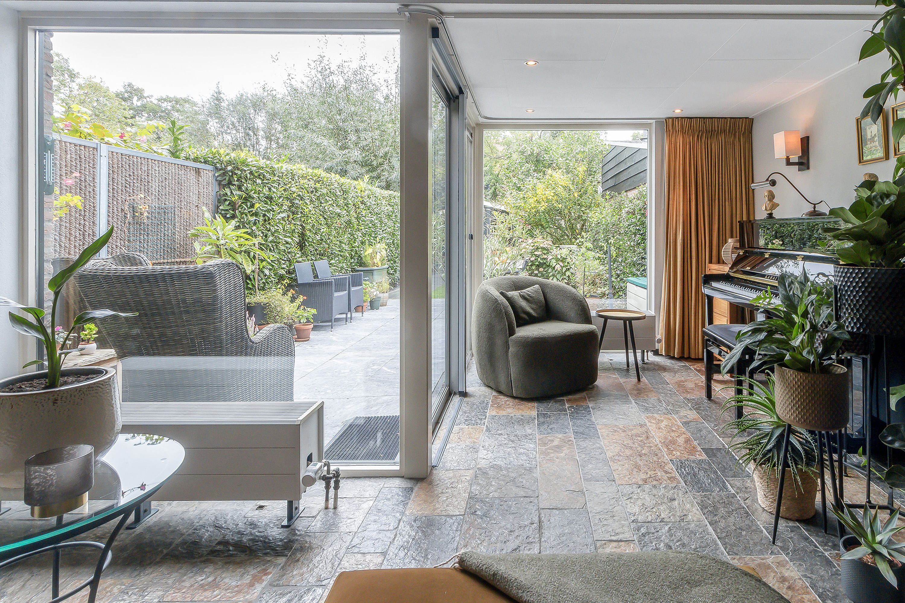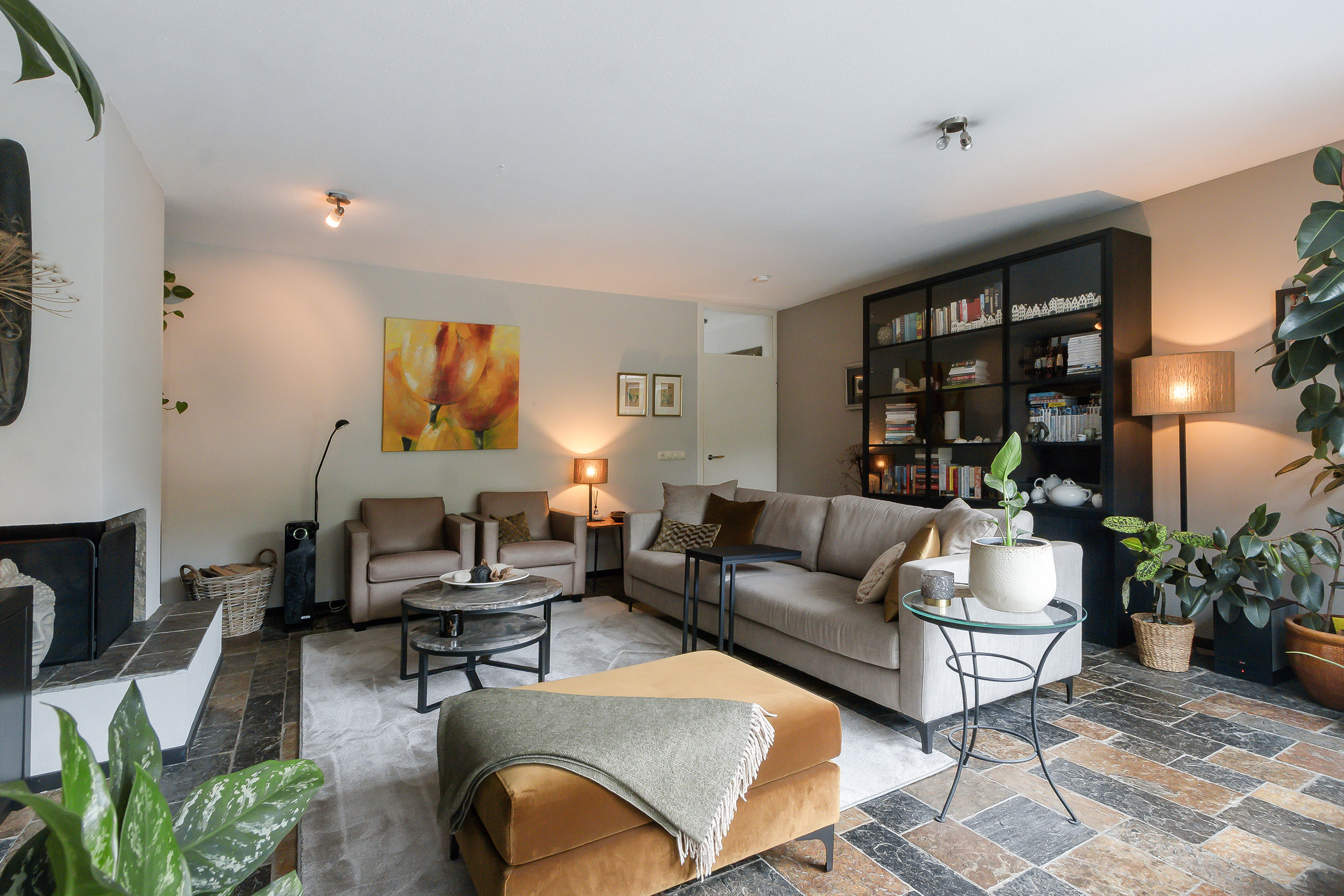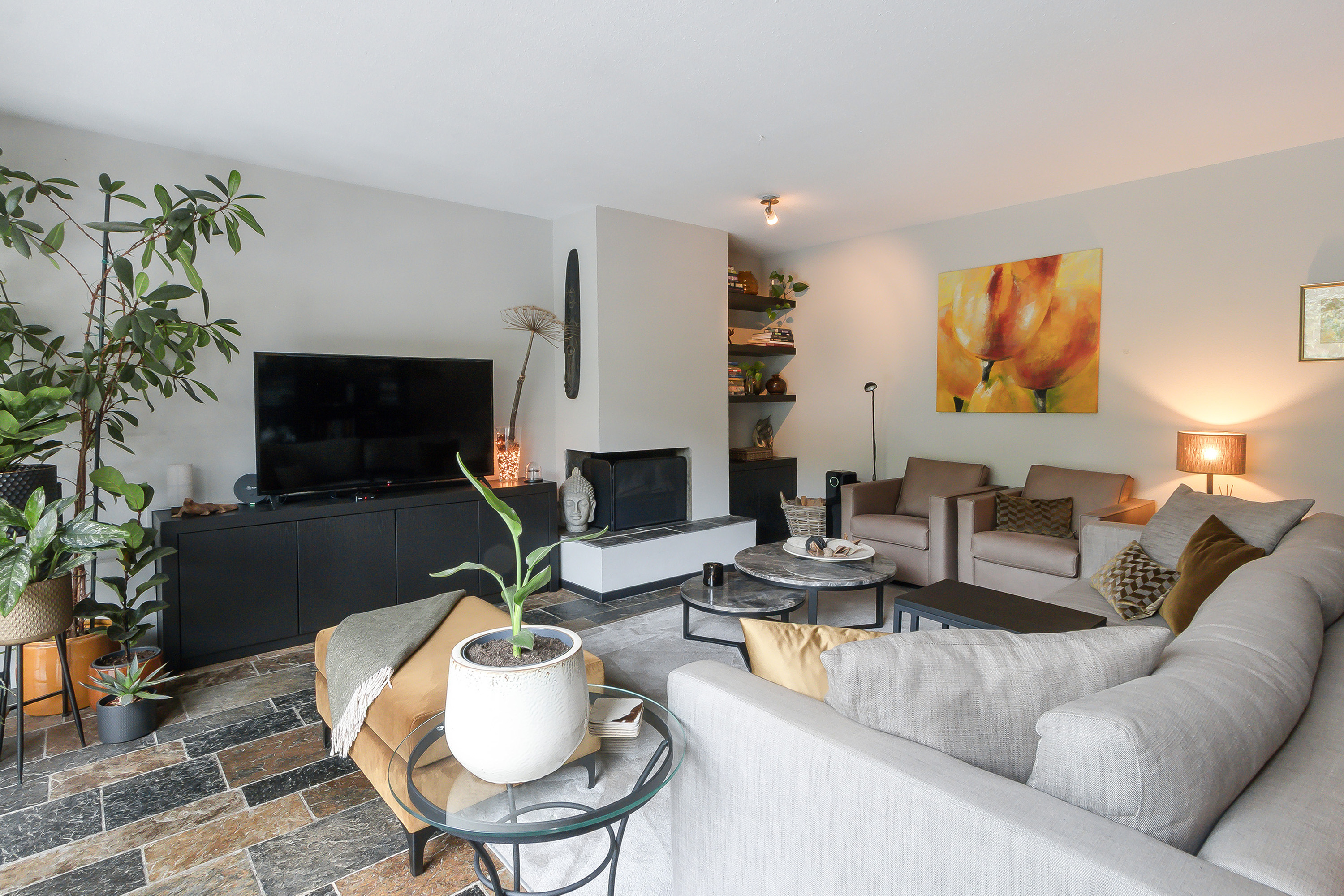 • Tuingerichte woonkamer met sfeervolle houtkachel;
