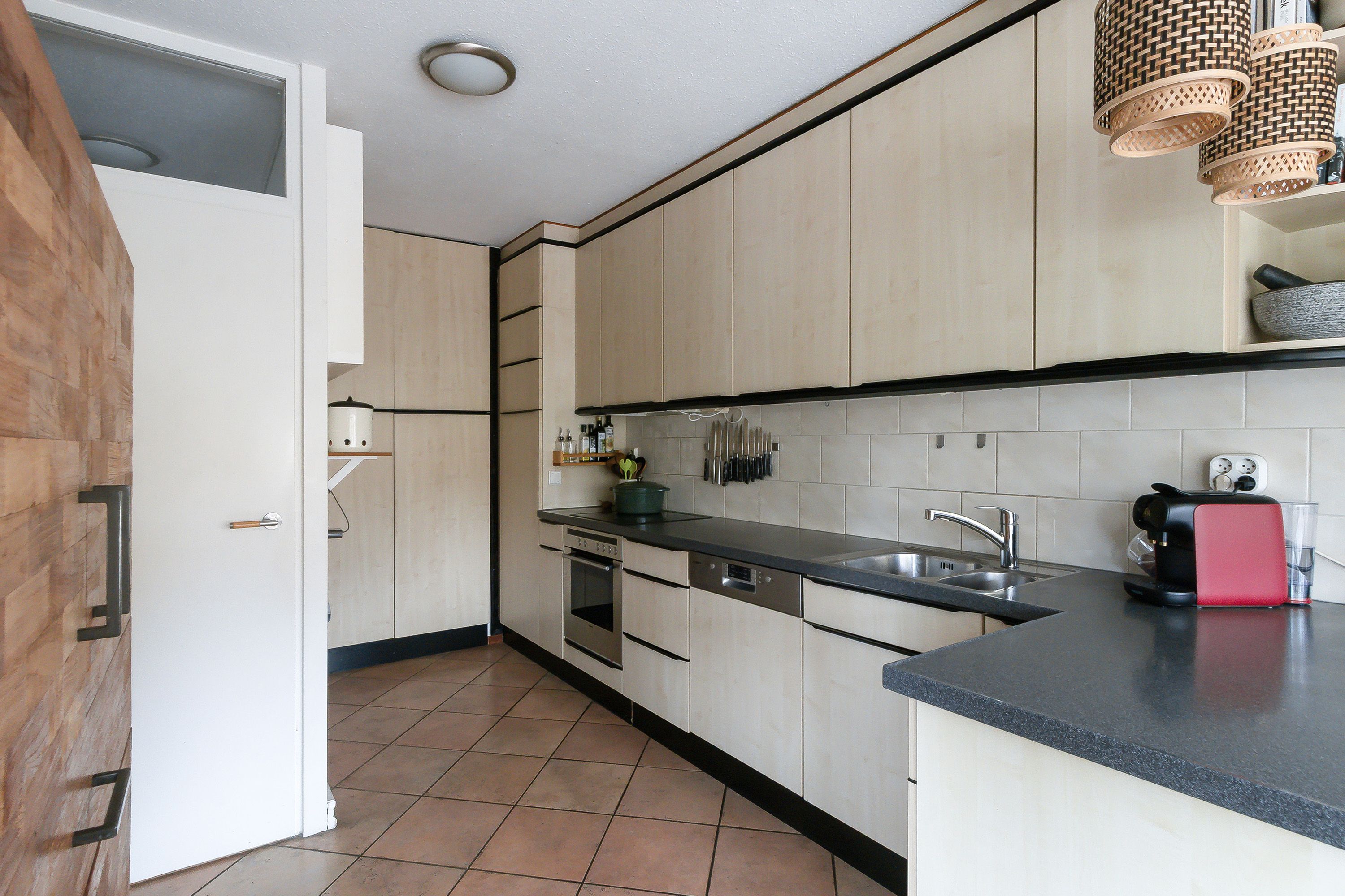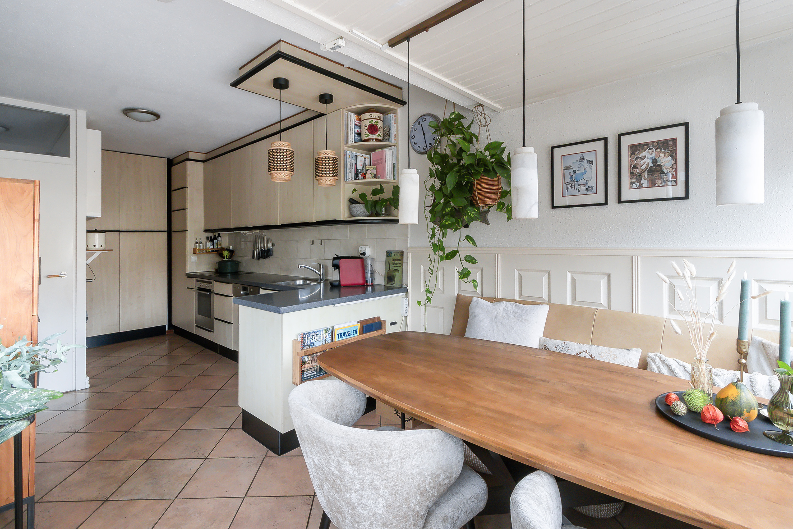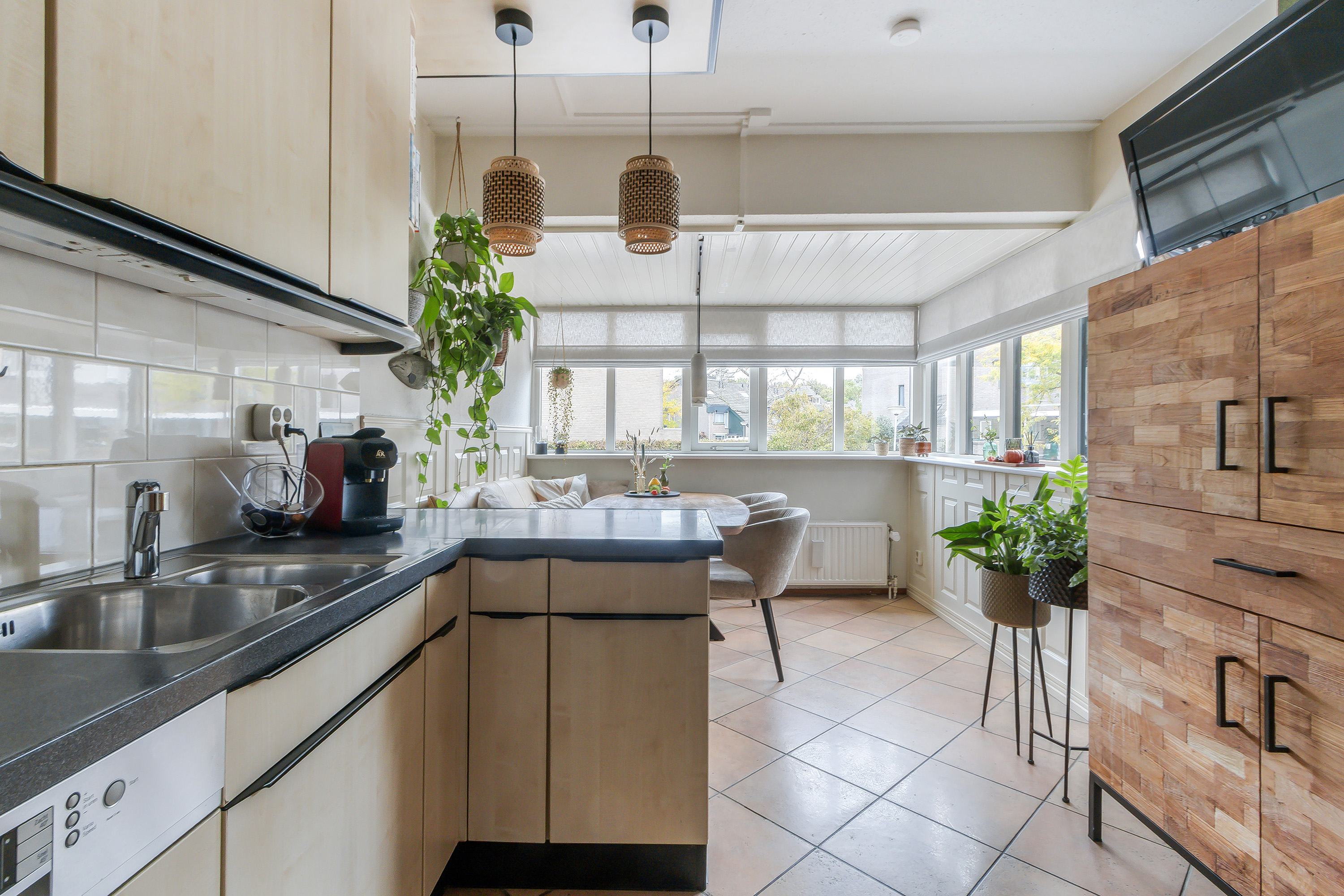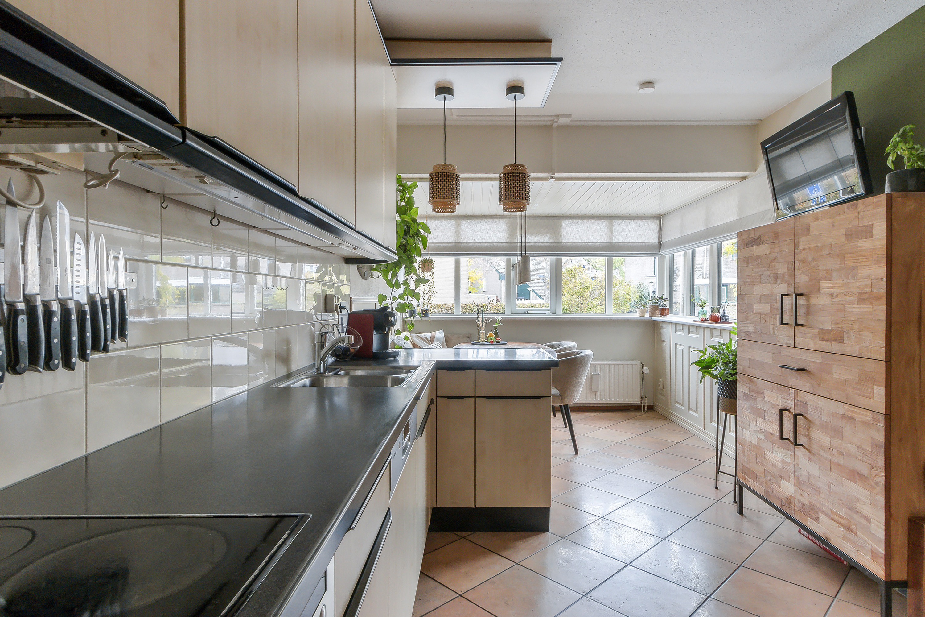 - Gezellige eetkeuken met hoekkozijn, gelegen aan de voorzijde van de woning en bestaande uit 2 secties (hoekopstelling en een wandsectie). De keukeninrichting is voorzien van o.a.: een 1,5 rvs spoelbak, diverse onder- en bovenkasten, laden, app.: afzuigkap, een 4-pits keramische kookplaat, een vaatwasser, een oven en een koelkast met vriesvak. Deze eetkeuken biedt met gemak plaats voor een eettafel.
