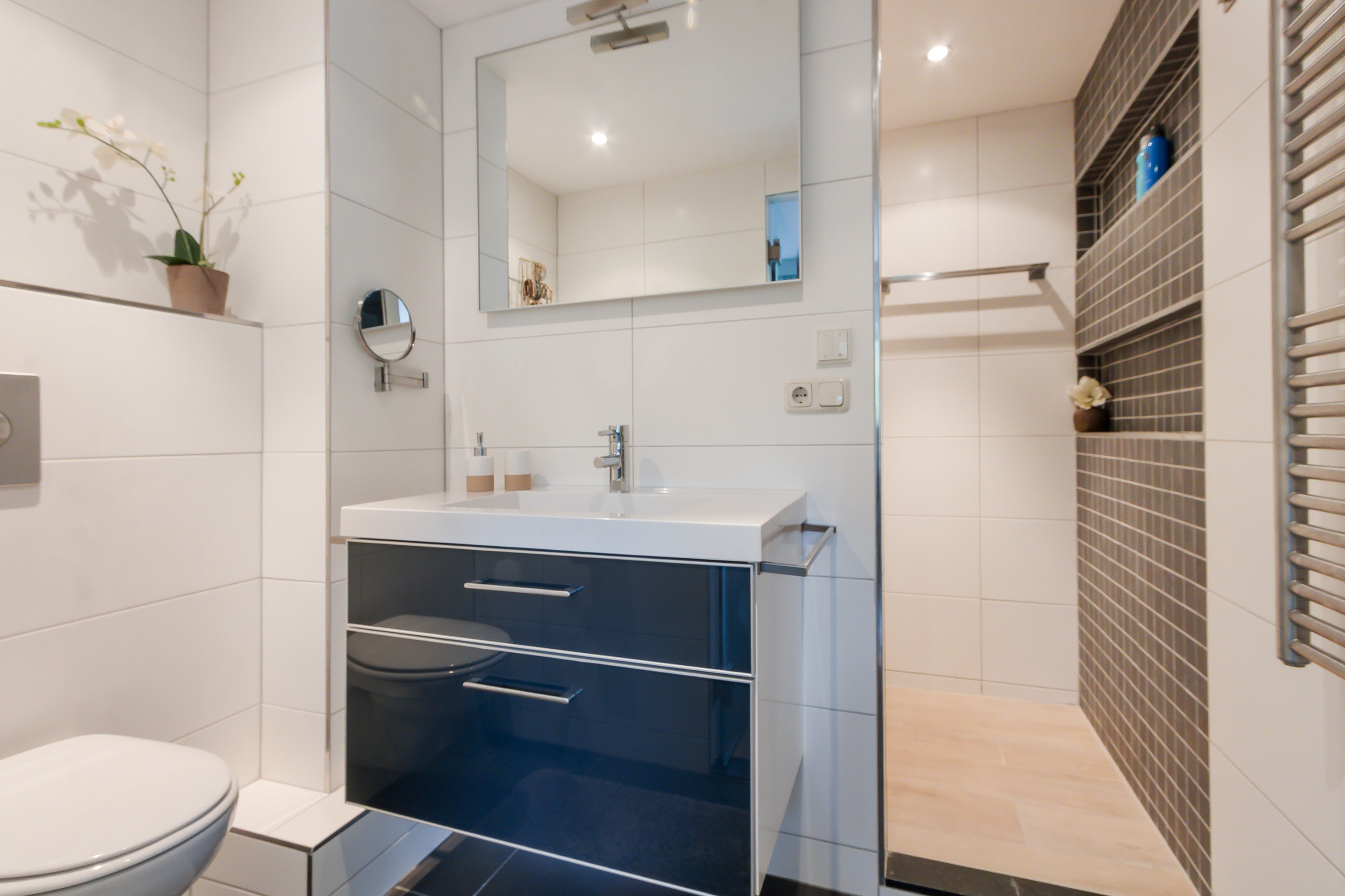 - Badkamer 1, inpandig gelegen, met geheel betegelde wanden, plavuizenvloer, wastafelmeubel, ruime inloopdouche, wandcloset en een designradiator;