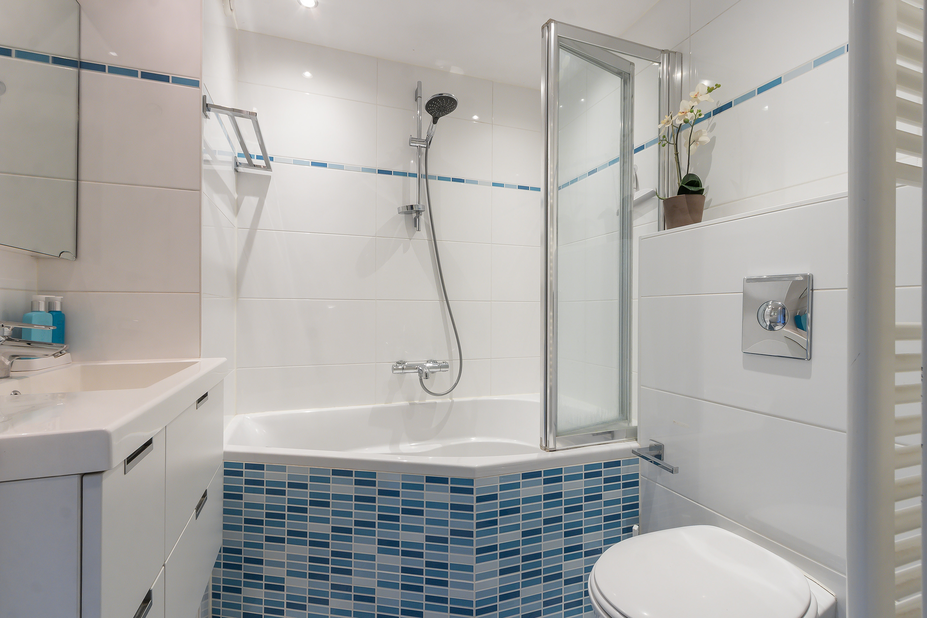 - Badkamer 2, gelegen in het midden van de verdieping met geheel betegelde wanden, een plavuizen vloer, wit sanitair, een wastafelmeubel, een ligbad met douchescherm, een wandcloset en een designradiator;