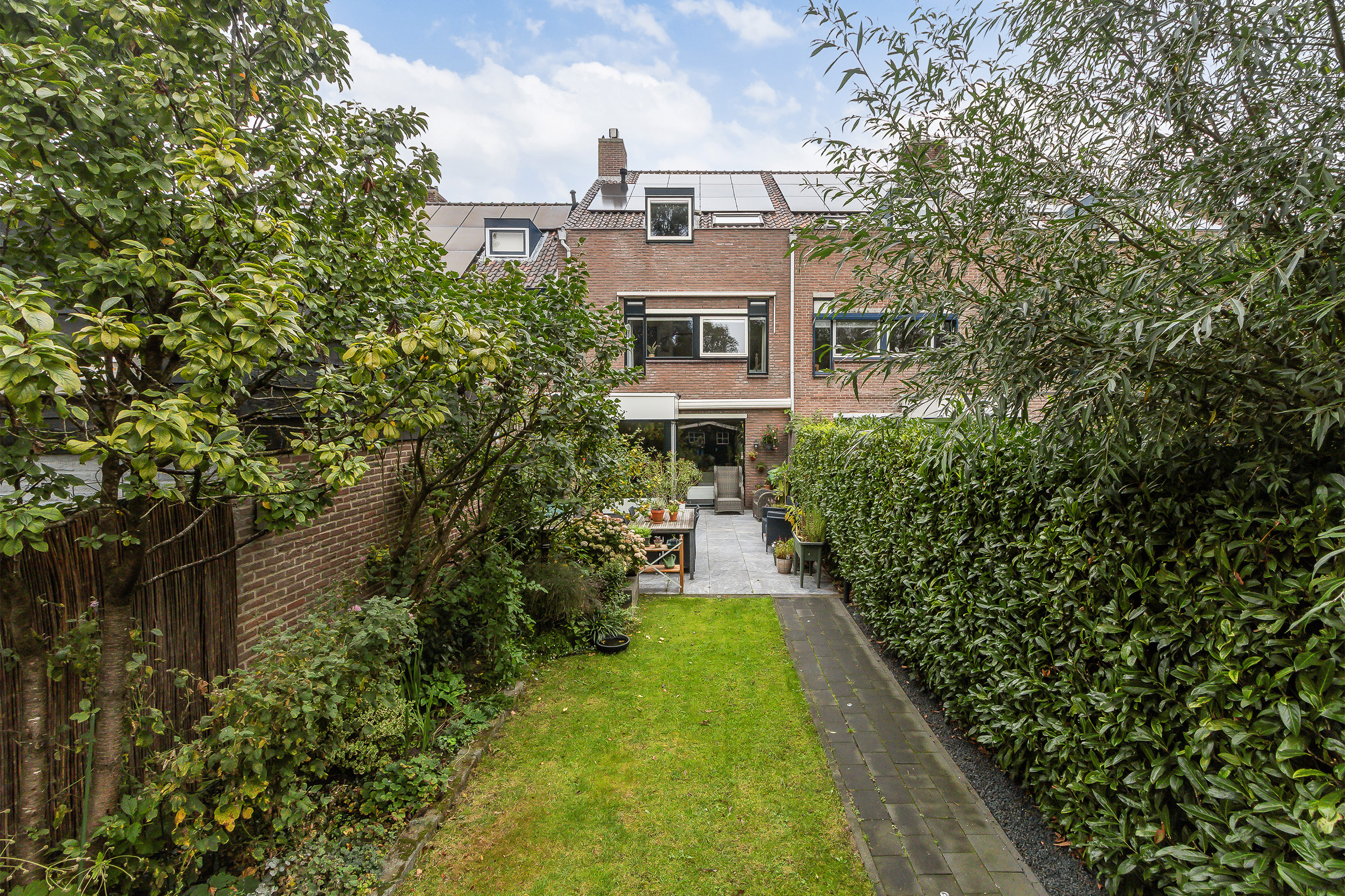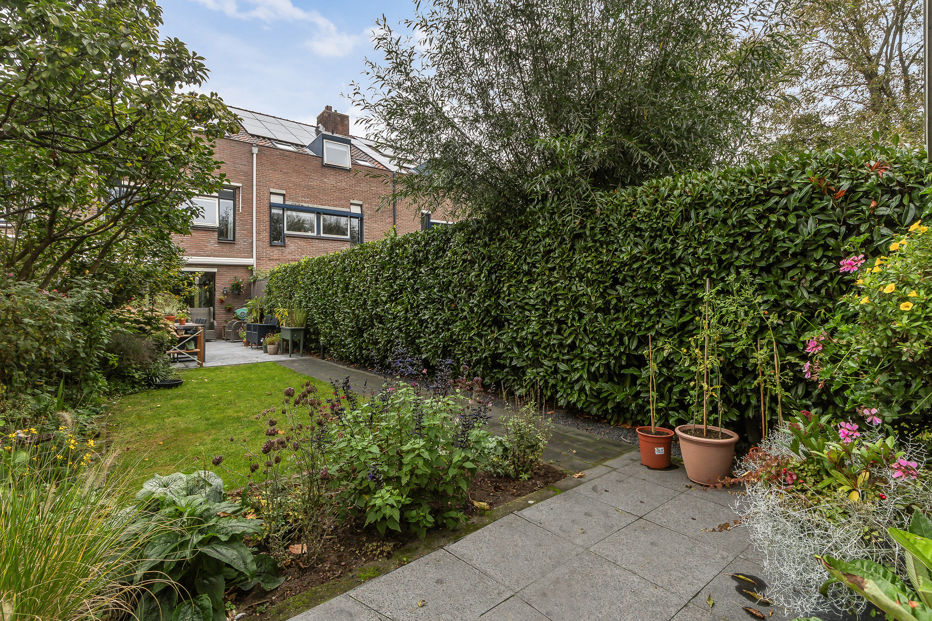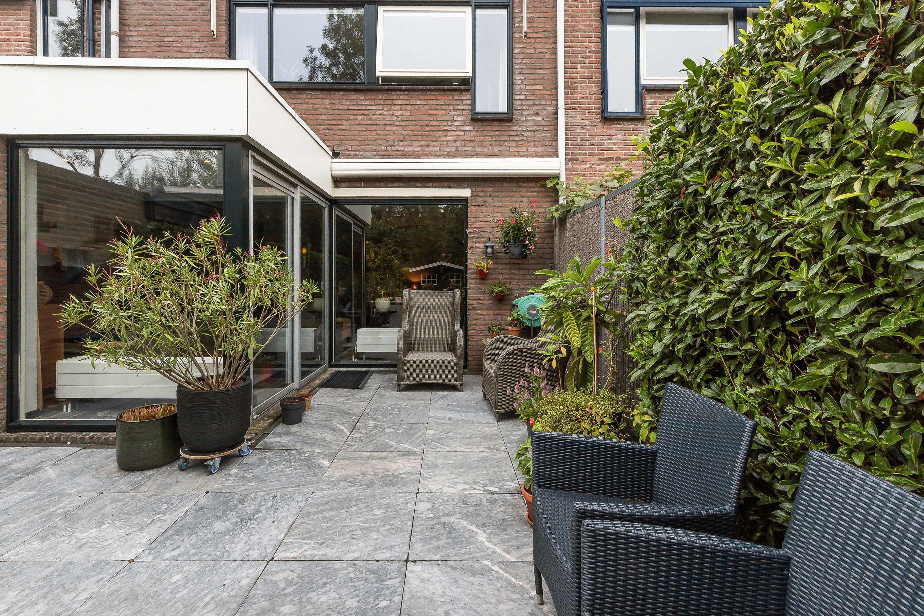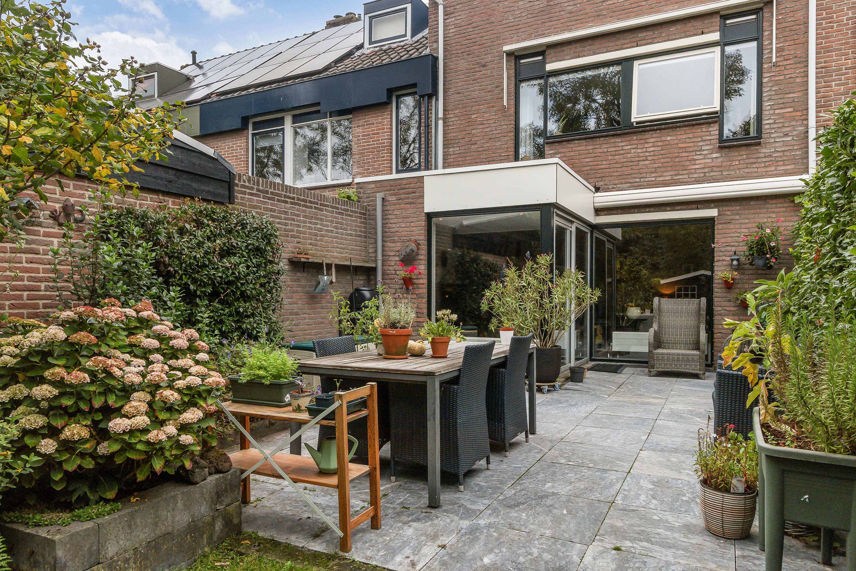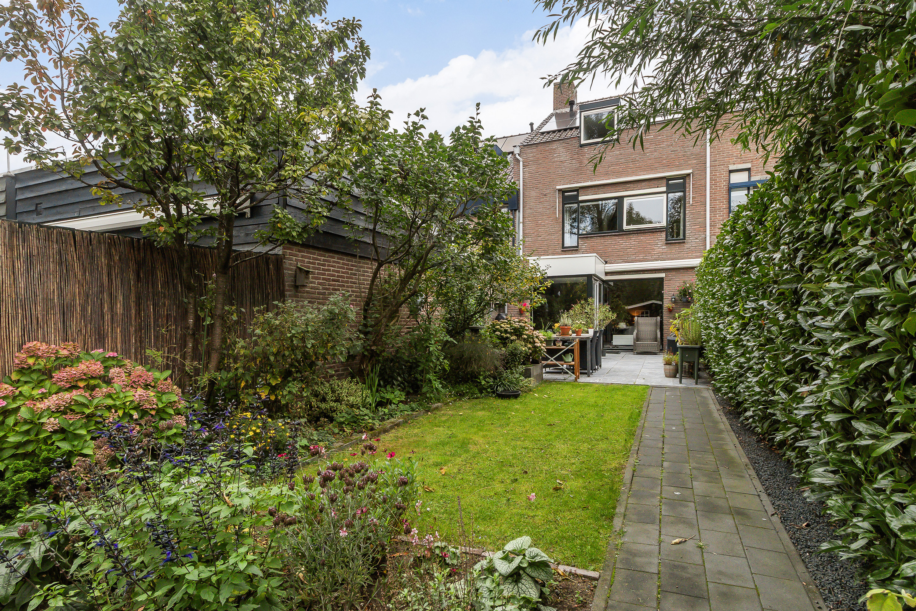 De achtertuin is een opvallend pluspunt. Bijna 20 meter diep, vrij gelegen en op het zuidoosten gesitueerd, biedt deze tuin veel privacy en volop zon. De tuin is ingericht met een groot betegeld terras, gras, borders, grind en een houten berging. Ook is er een achterom aanwezig.