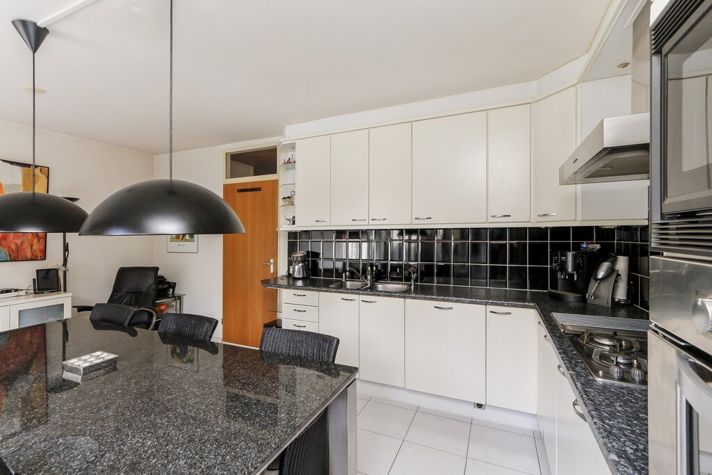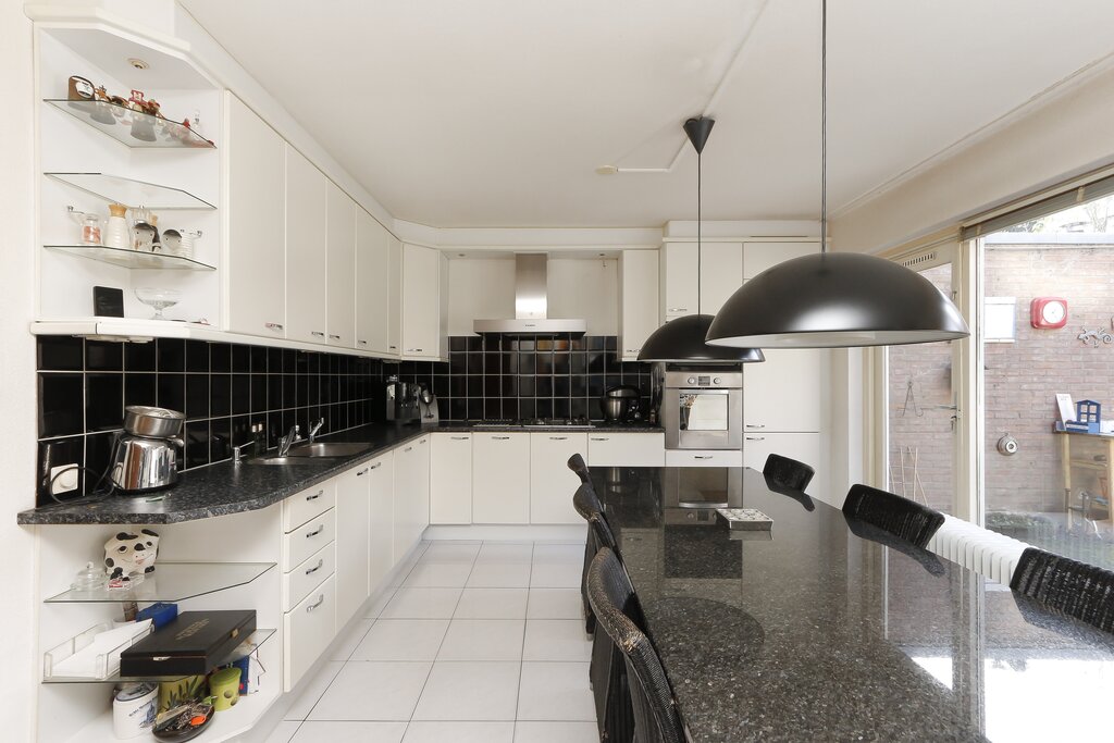 - Woonkeuken met plavuizenvloer, schuifpui met toegang tot de patiotuin en corridor richting de woonkamer die achter de patiotuin is gesitueerd. De keuken is voorzien van een granietkleurig aanrechtblad, mintgroene kastdeuren (dit in afwijking van de foto van de keuken) en diverse inbouwapparatuur, t.w.: een afzuigkap, een gaskookplaat met ‘Teppanyaki’ een elektrische bakplaat, een heteluchtoven, een magnetron, een vaatwasser, een quooker en een koel-/vriescombinatie;