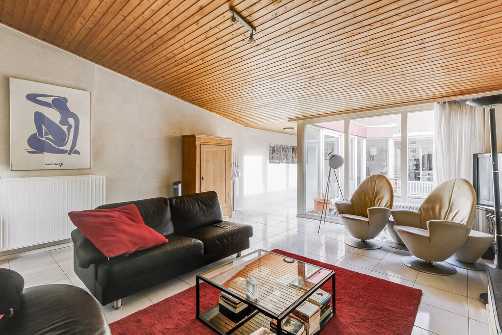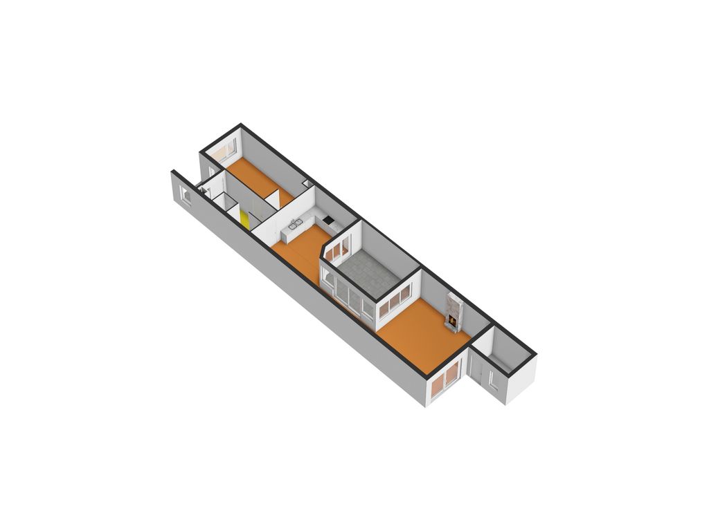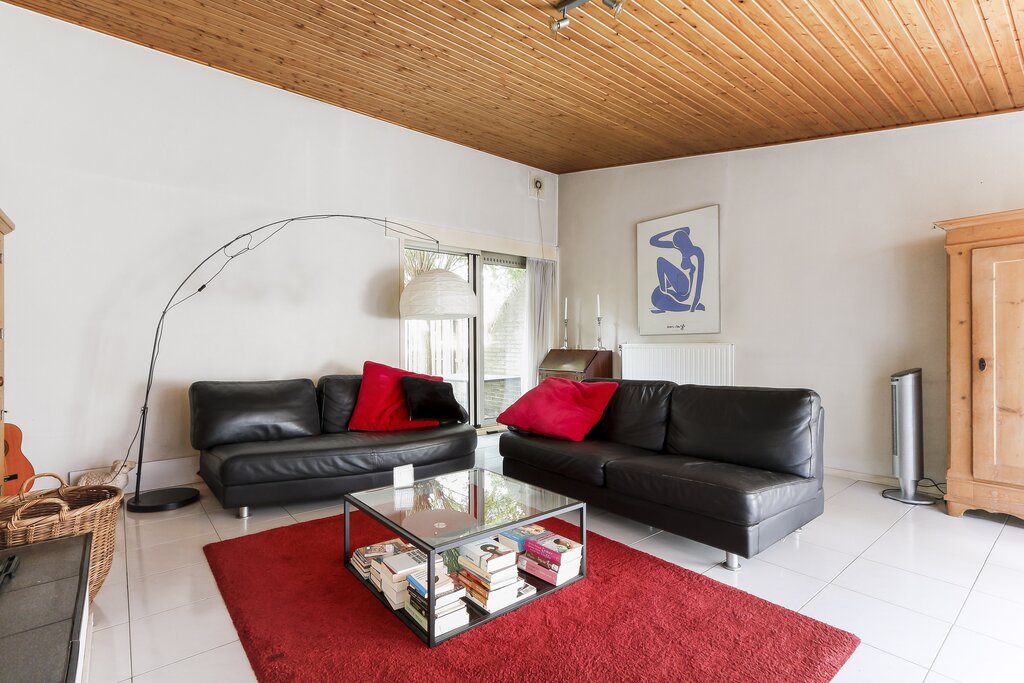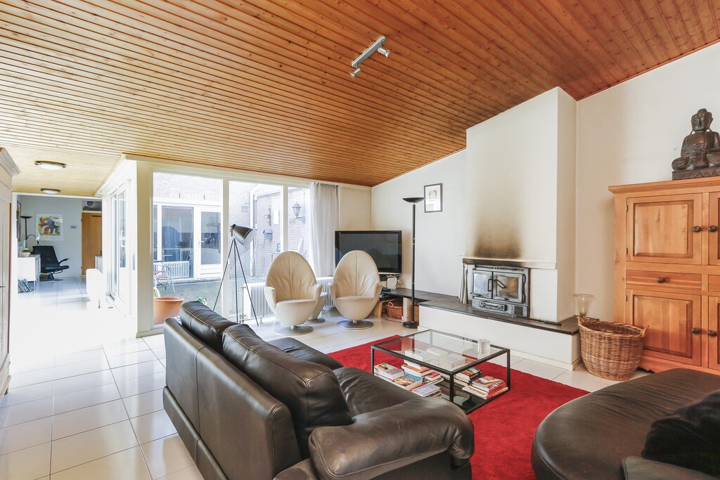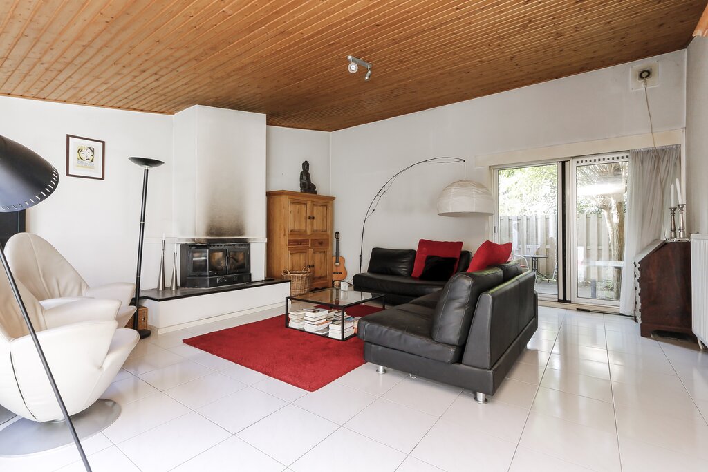 - Woonkamer voorzien van een schuifpui richting de achtertuin, glazen pui met zicht richting de patiotuin en woonkeuken, houtkachel en schuin oplopend plafond (lessenaarsdak).