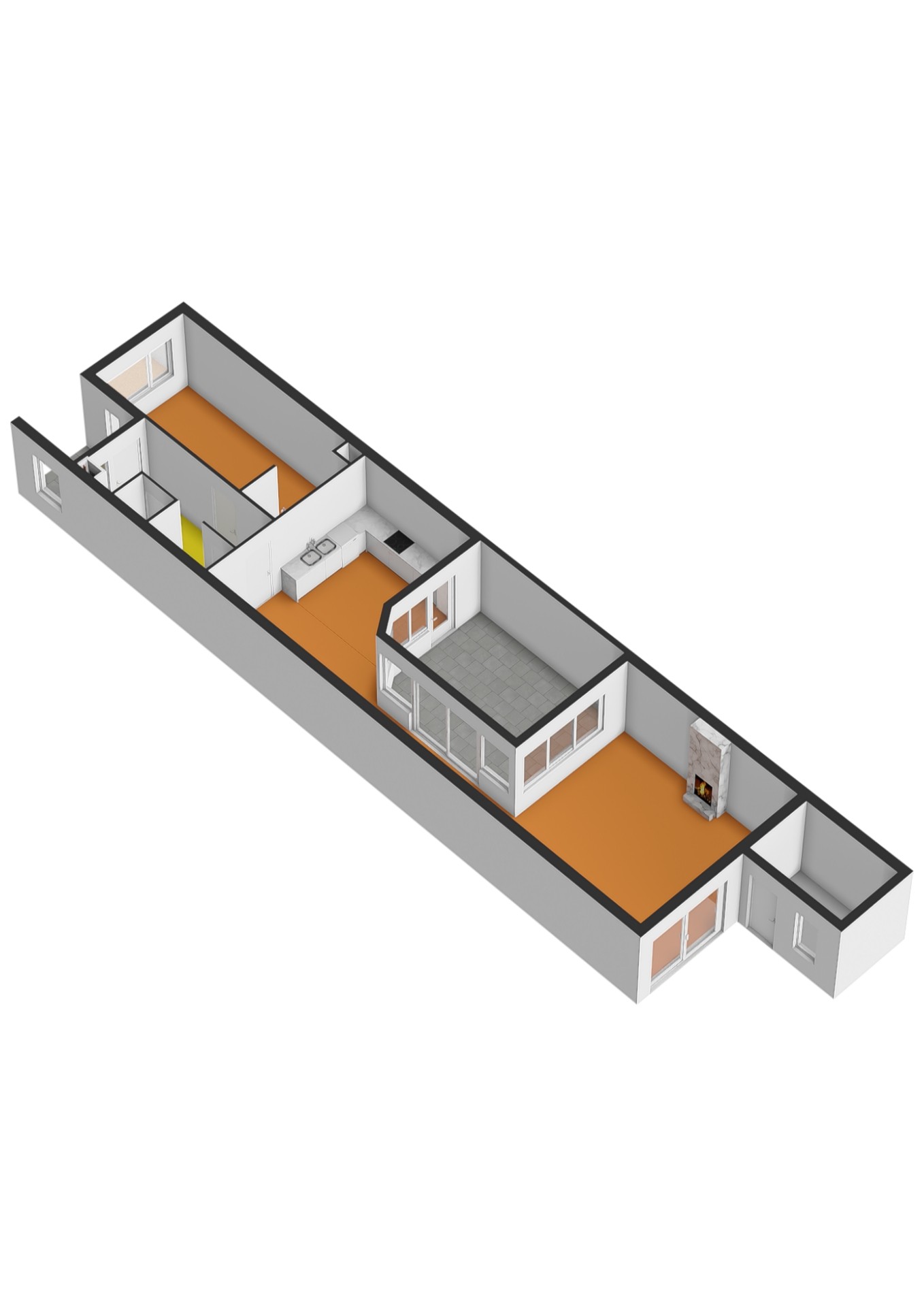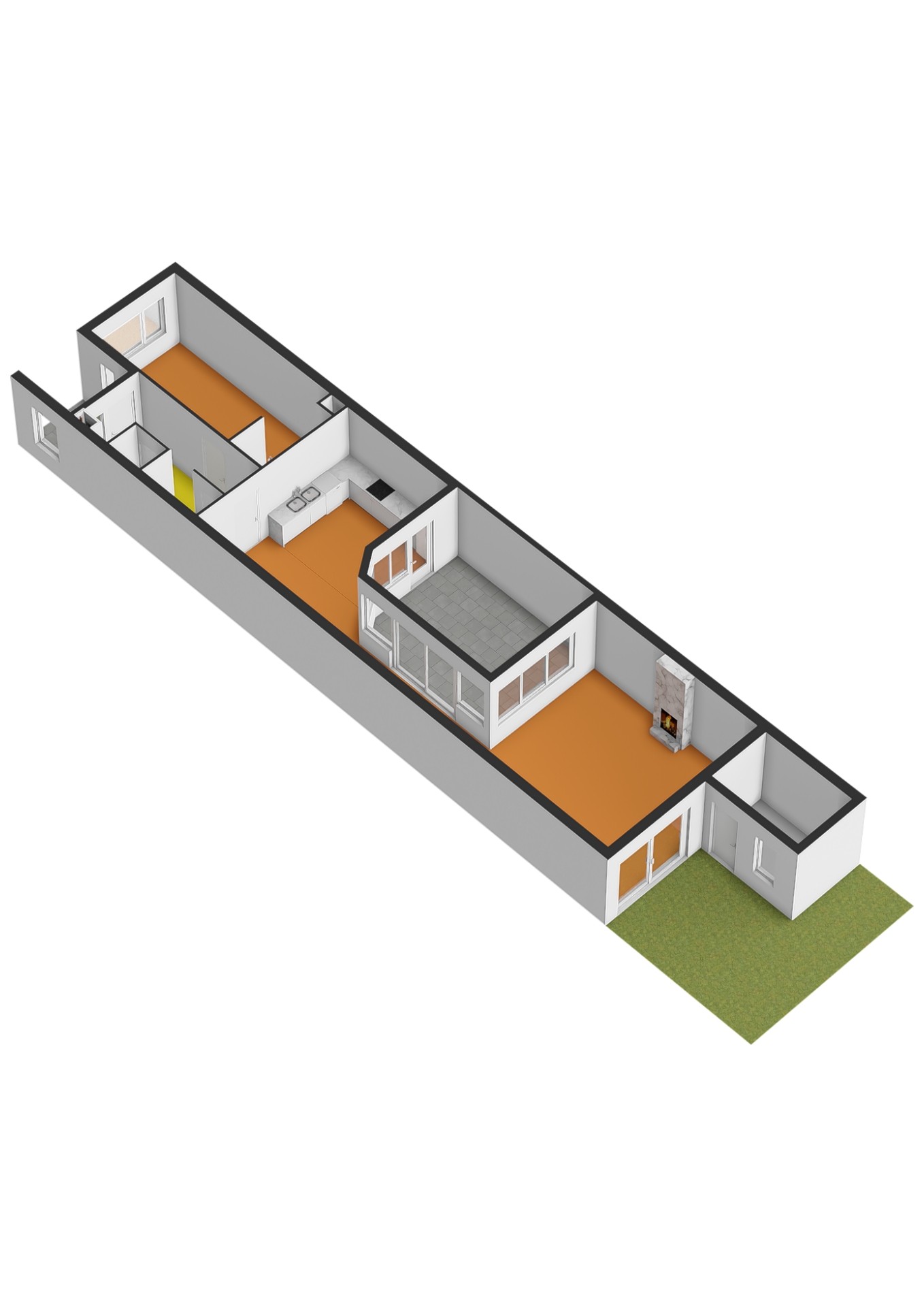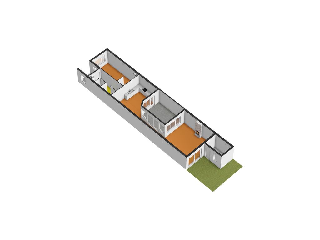 - Woonkamer voorzien van een schuifpui richting de achtertuin, glazen pui met zicht richting de patiotuin en woonkeuken, houtkachel en schuin oplopend plafond (lessenaarsdak).
