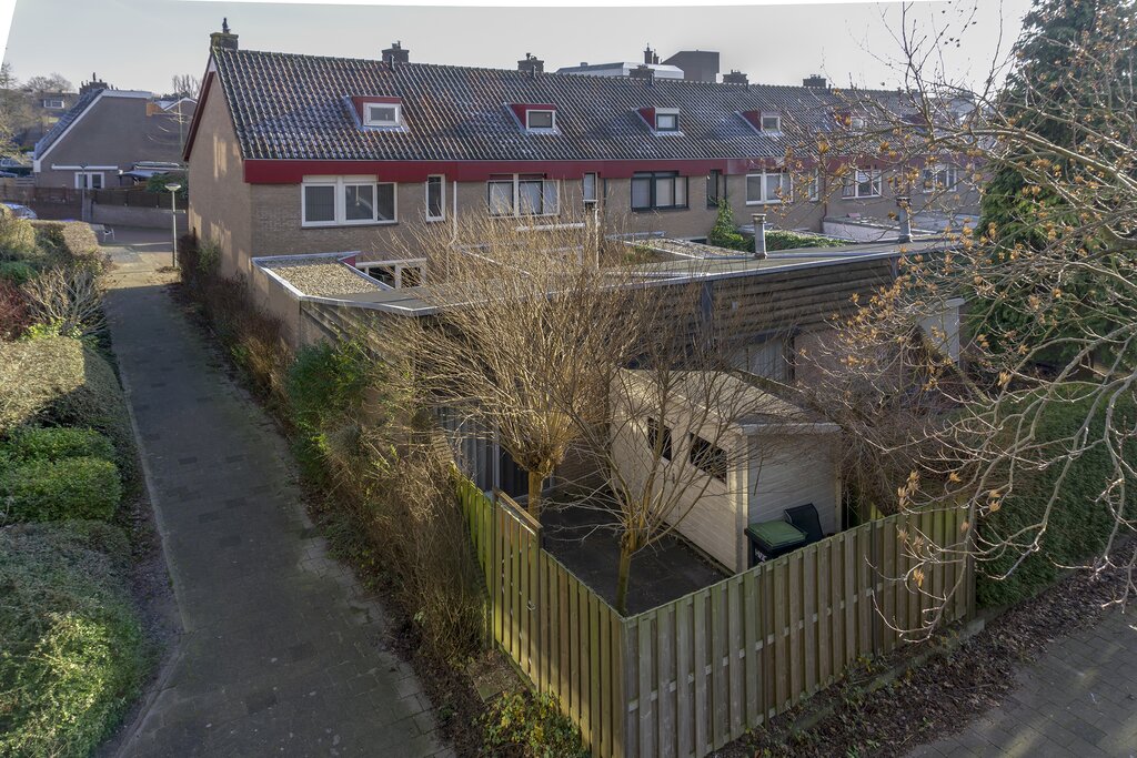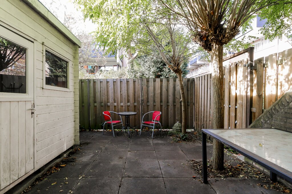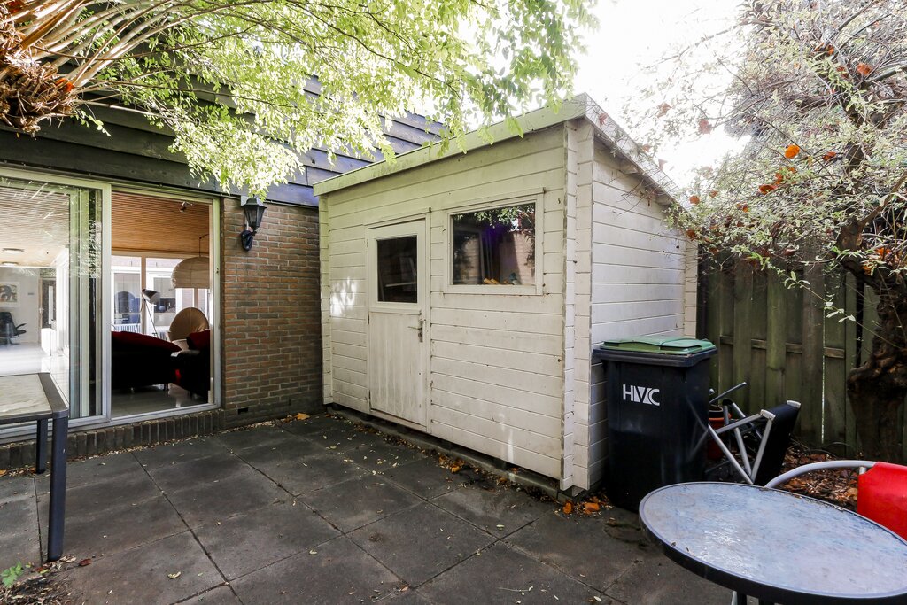 - Achtertuin: afm. ca. 5.04 x 5.40 m., gesitueerd op het westen met achterom. Omheind met houten schuttingdelen en voorzien van een houten schuur.