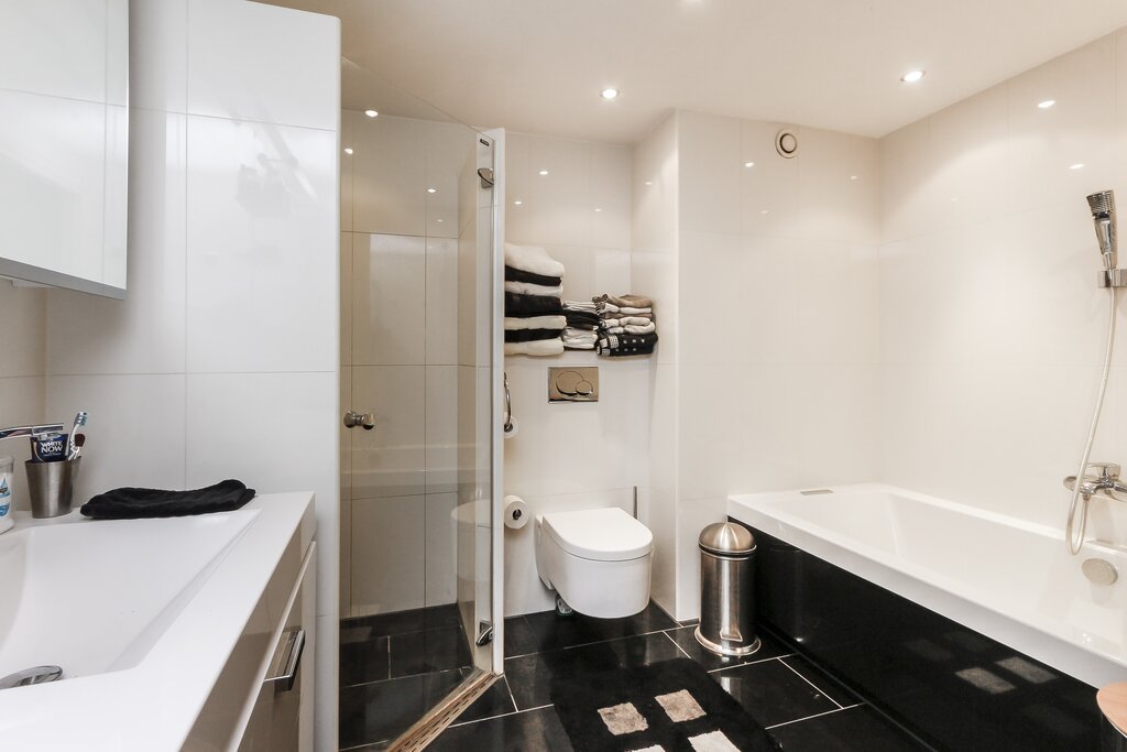 - Toiletruimte, met zwart/witte wand- en vloertegels, wit sanitair, hangcloset en hoekfontein;