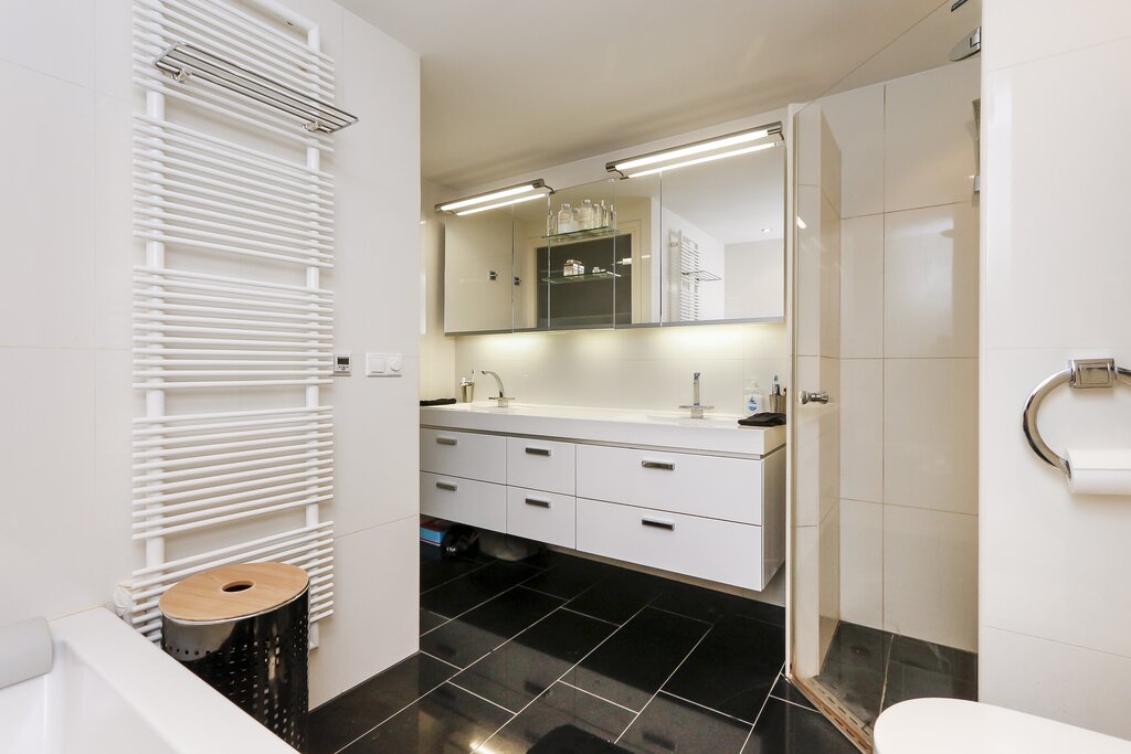 - Ruime badkamer, die in 2005/2006 is vergroot en luxueus is aangelegd met hardstenen vloertegels, witte wandtegels, glad stucplafond met inbouwspots, wit sanitair van het luxemerk “Joop” t.w.: extra groot ligbad, douchecabine/ inloopdouche, hangcloset, duo- wastafelmeubel, spiegelkastenwand en een designradiator. De vloer is voorzien van elektrische vloerverwarming.