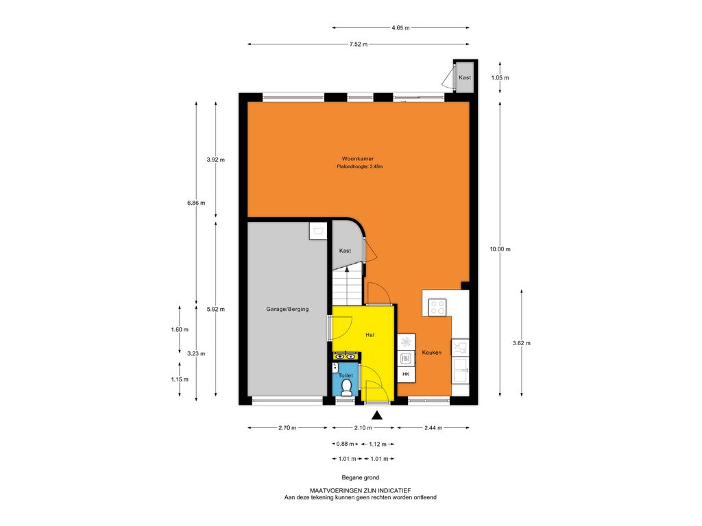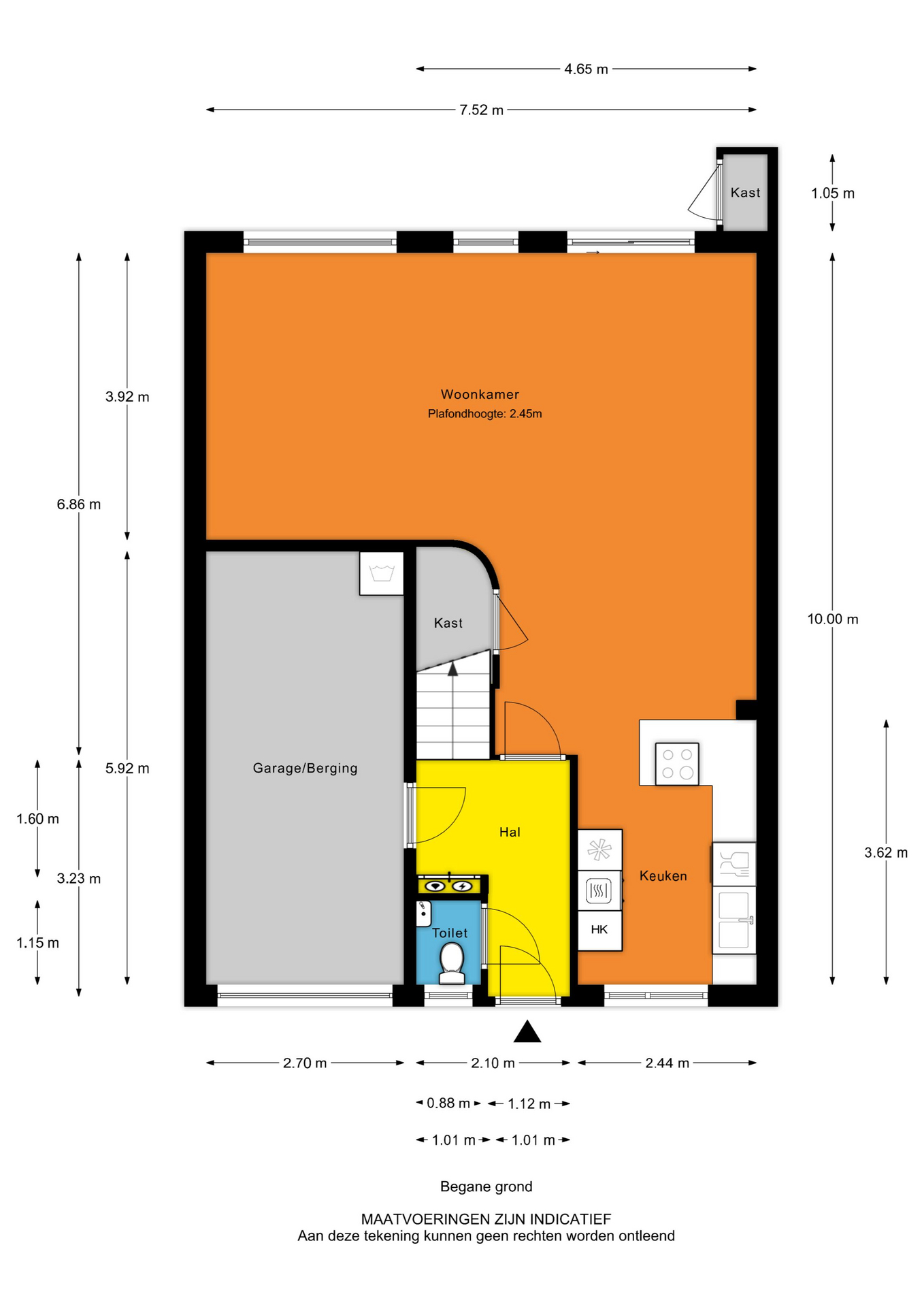 Begane grond: entree, hal, meterkast, toilet, tuingerichte woonkamer met trapkast en schuifpui, een open keuken met diverse apparatuur en een inpandige garage.