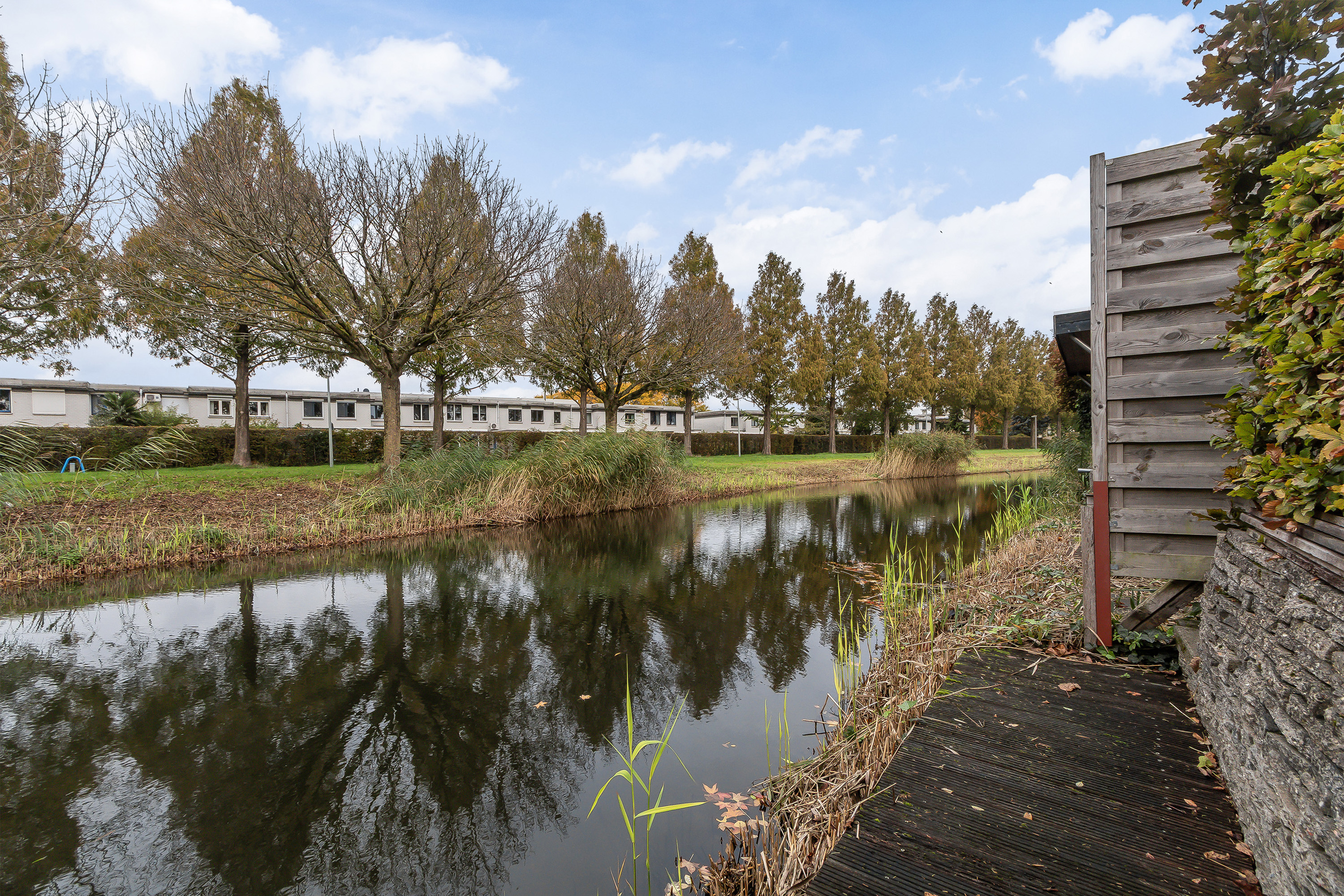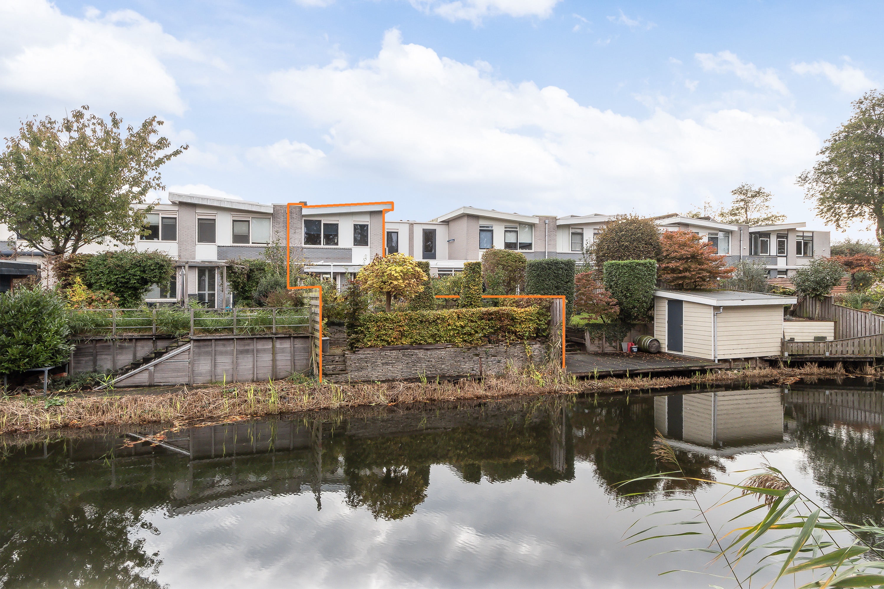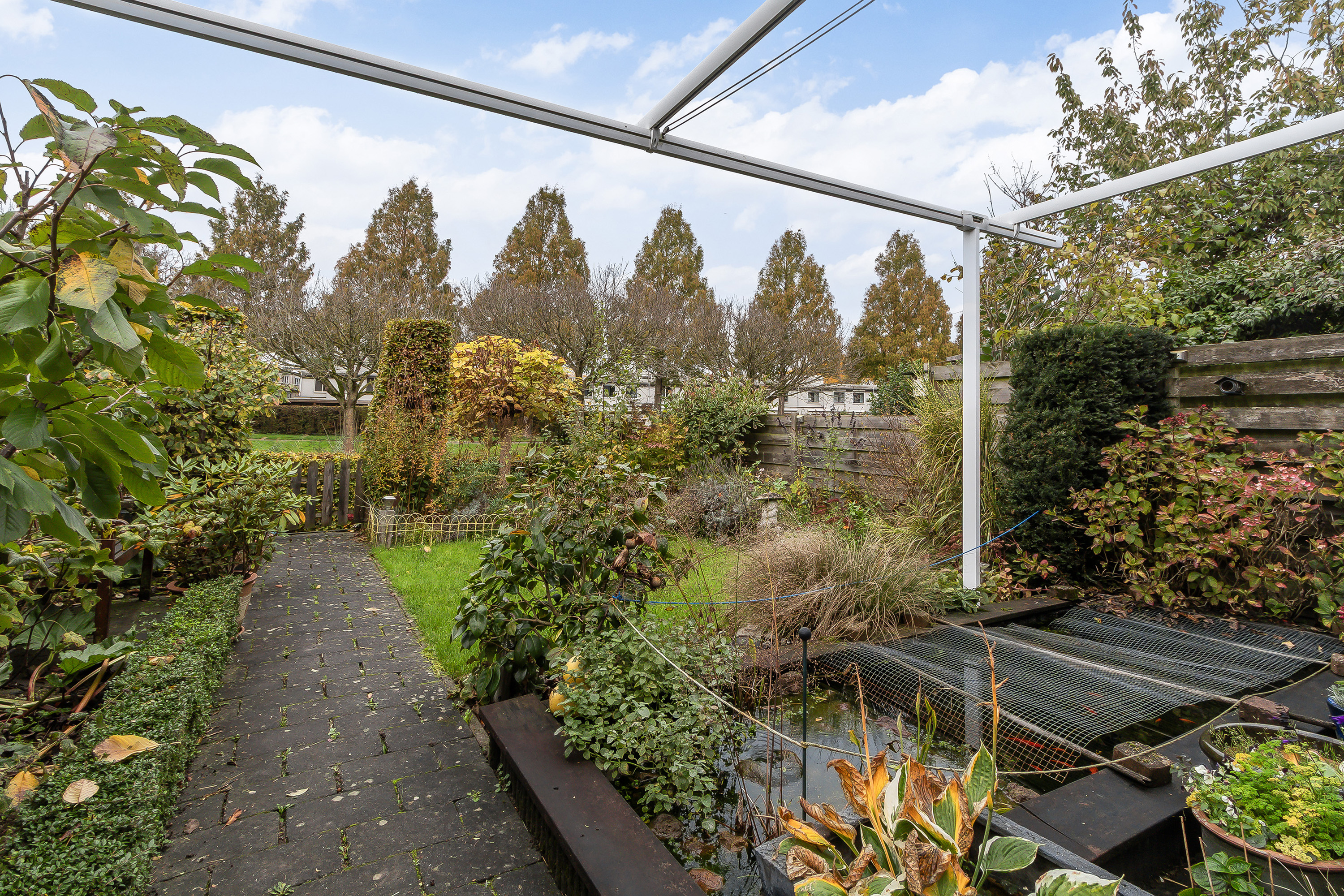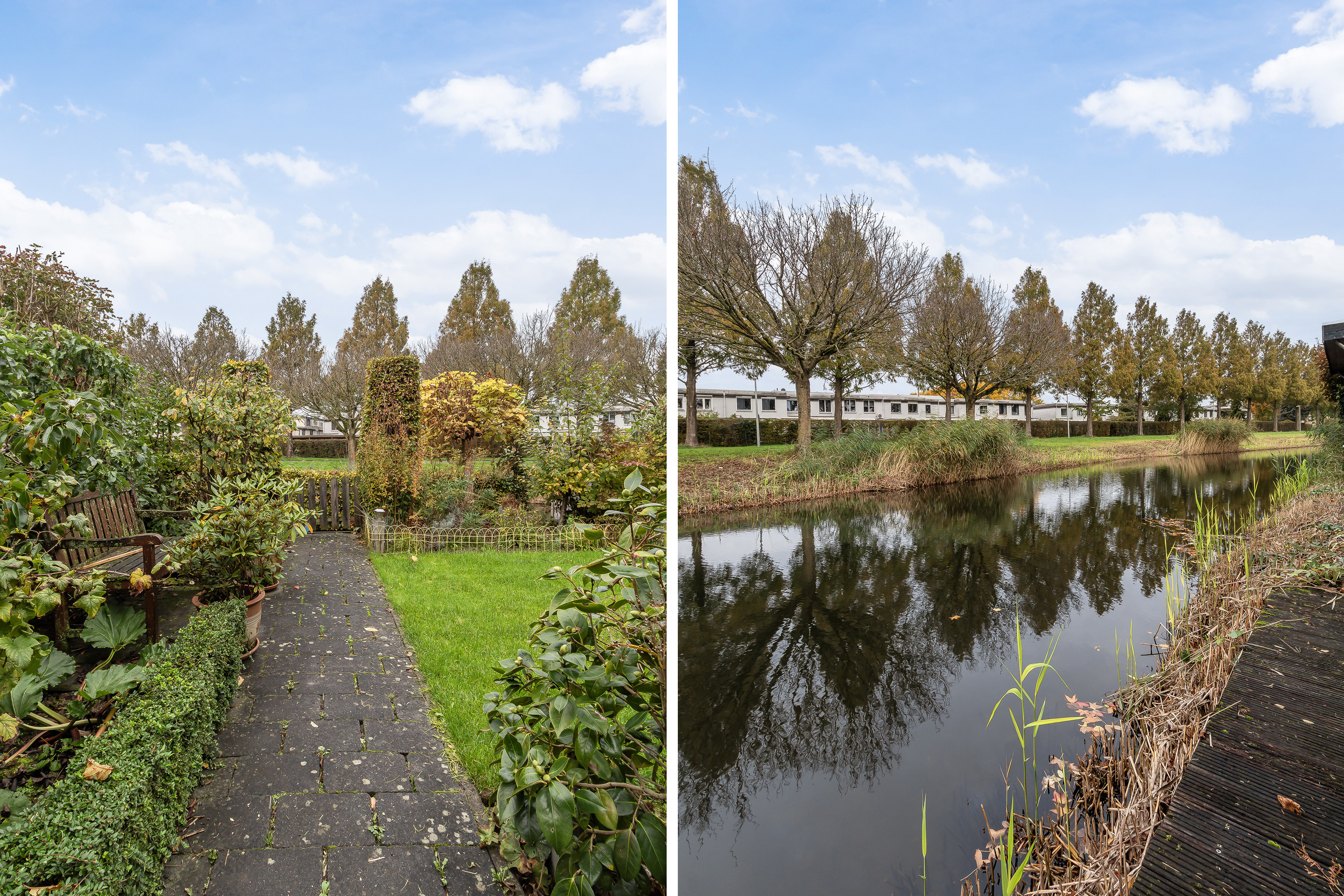 - Achtertuin: gesitueerd op het westen, grenzend aan een waterloop. Aangelegd met houten schuttingdelen, een betegeld terrasgedeelte, gras, sierbestrating, borders, een vijver en aan de achterzijde een afstap naar een waterterras. Tuinkast. Buitenkraan.
