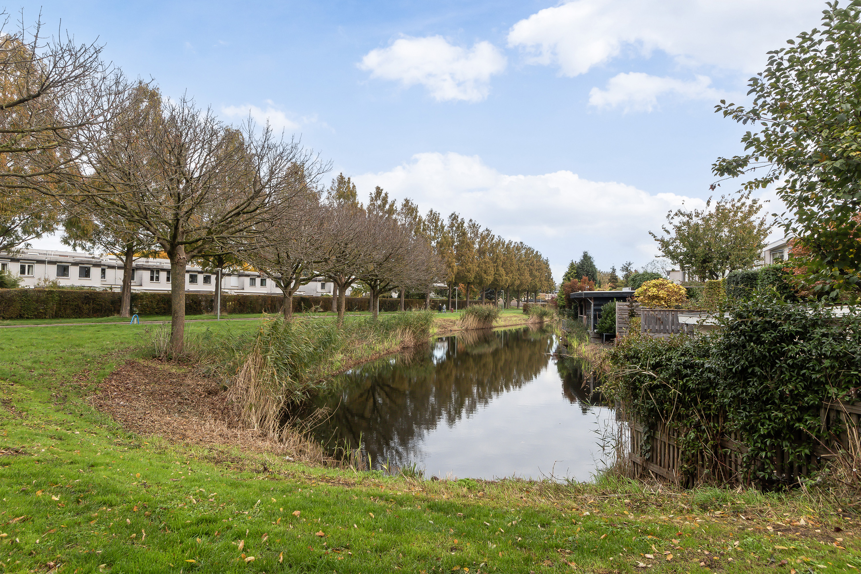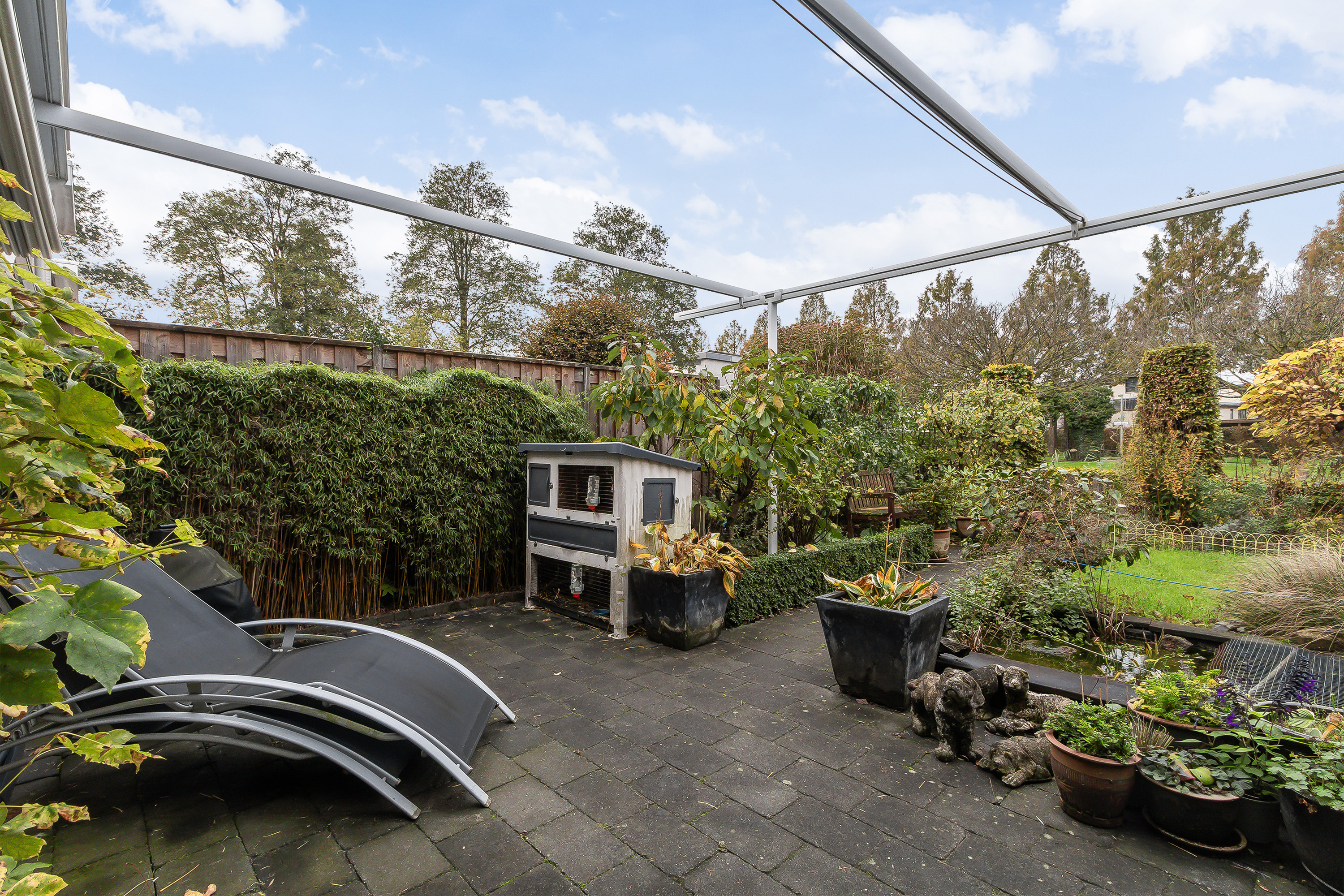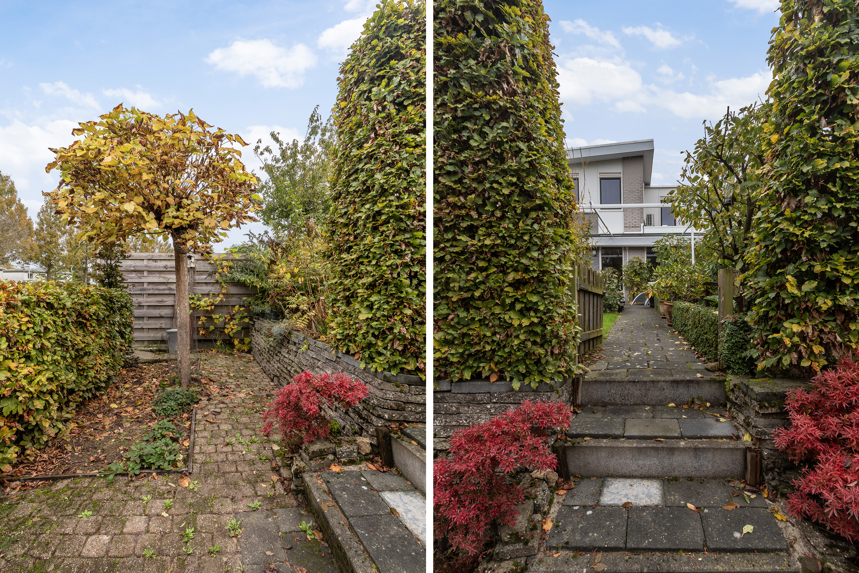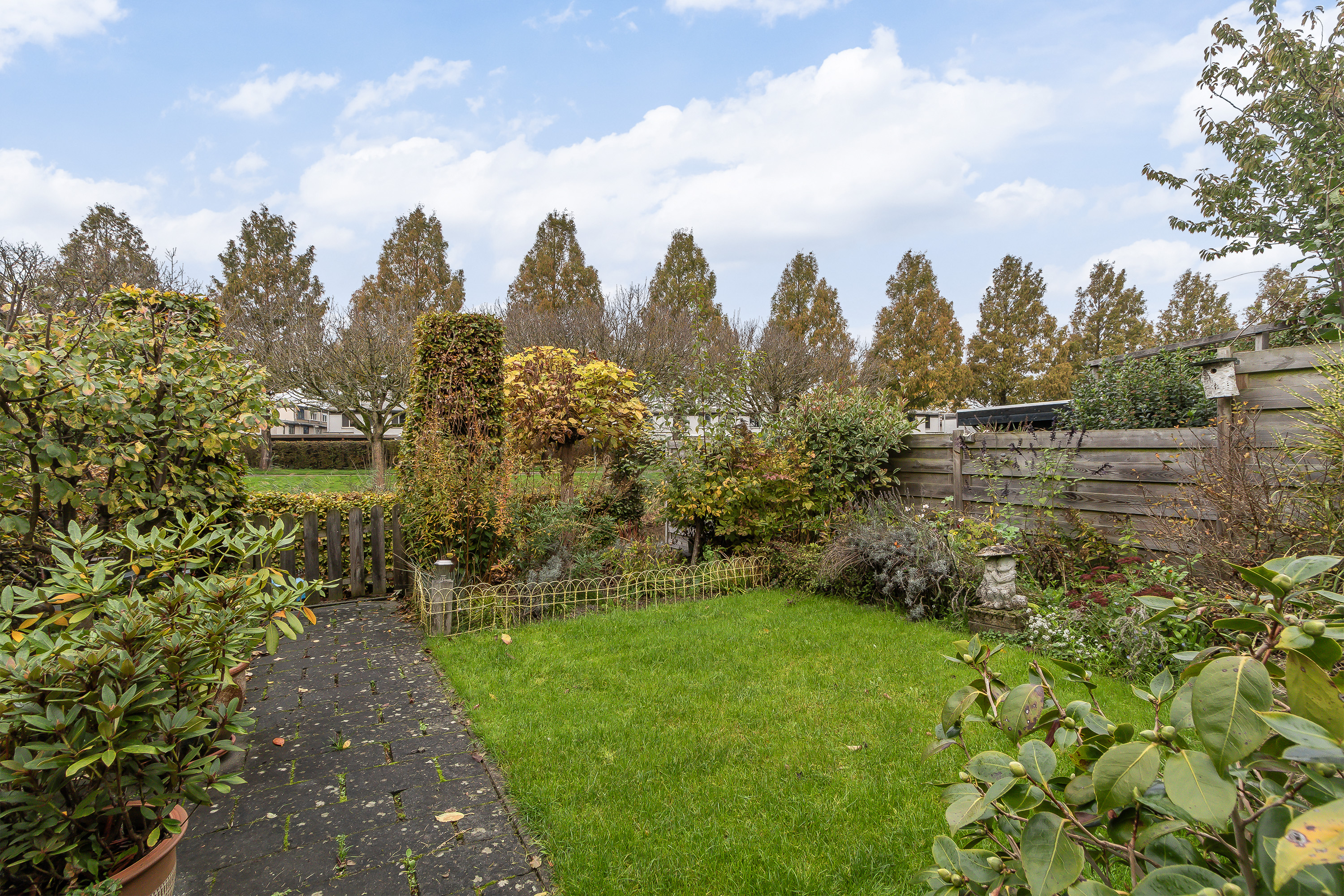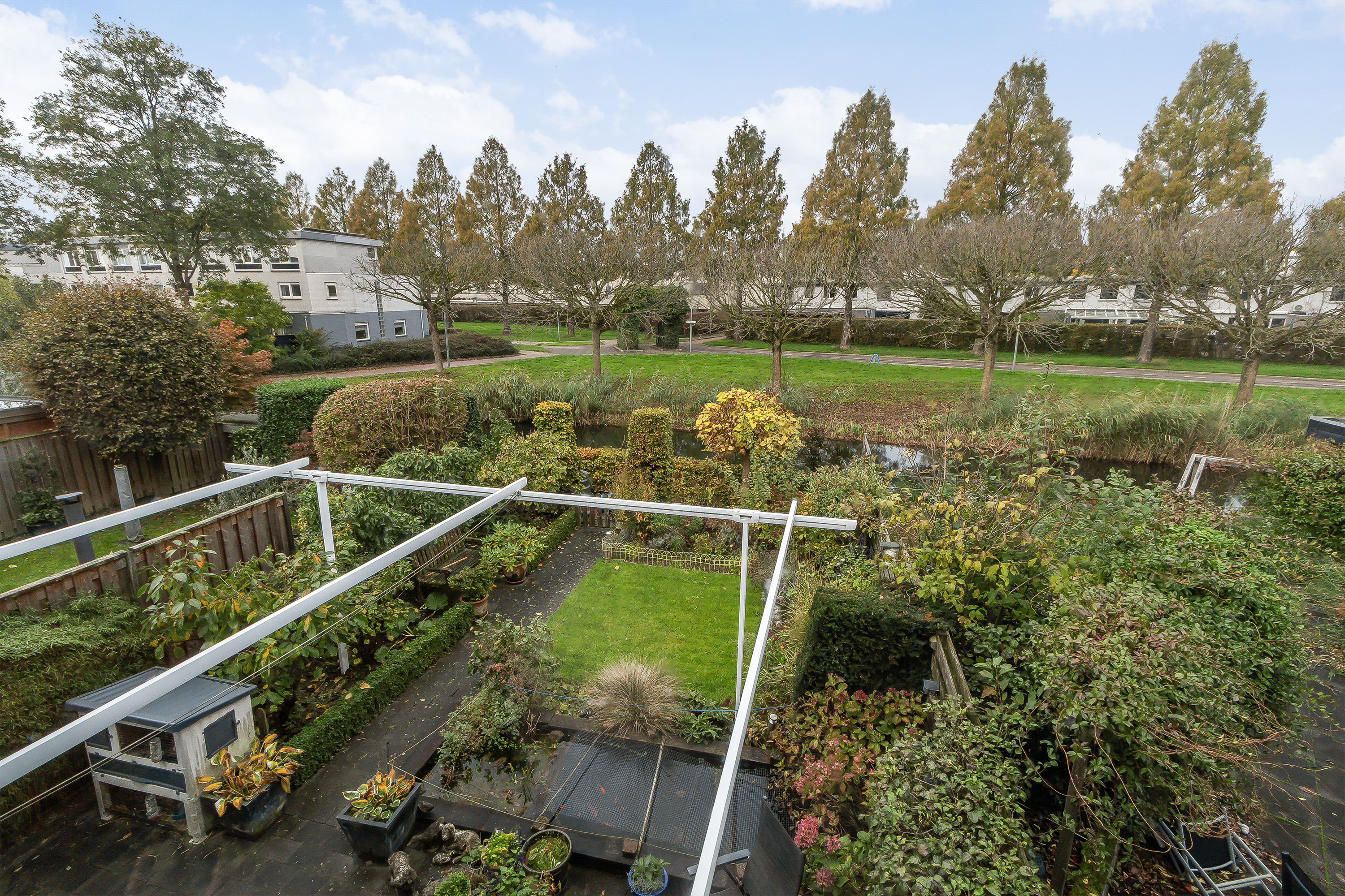 - Achtertuin: gesitueerd op het westen, grenzend aan een waterloop. Aangelegd met houten schuttingdelen, een betegeld terrasgedeelte, gras, sierbestrating, borders, een vijver en aan de achterzijde een afstap naar een waterterras. Tuinkast. Buitenkraan.