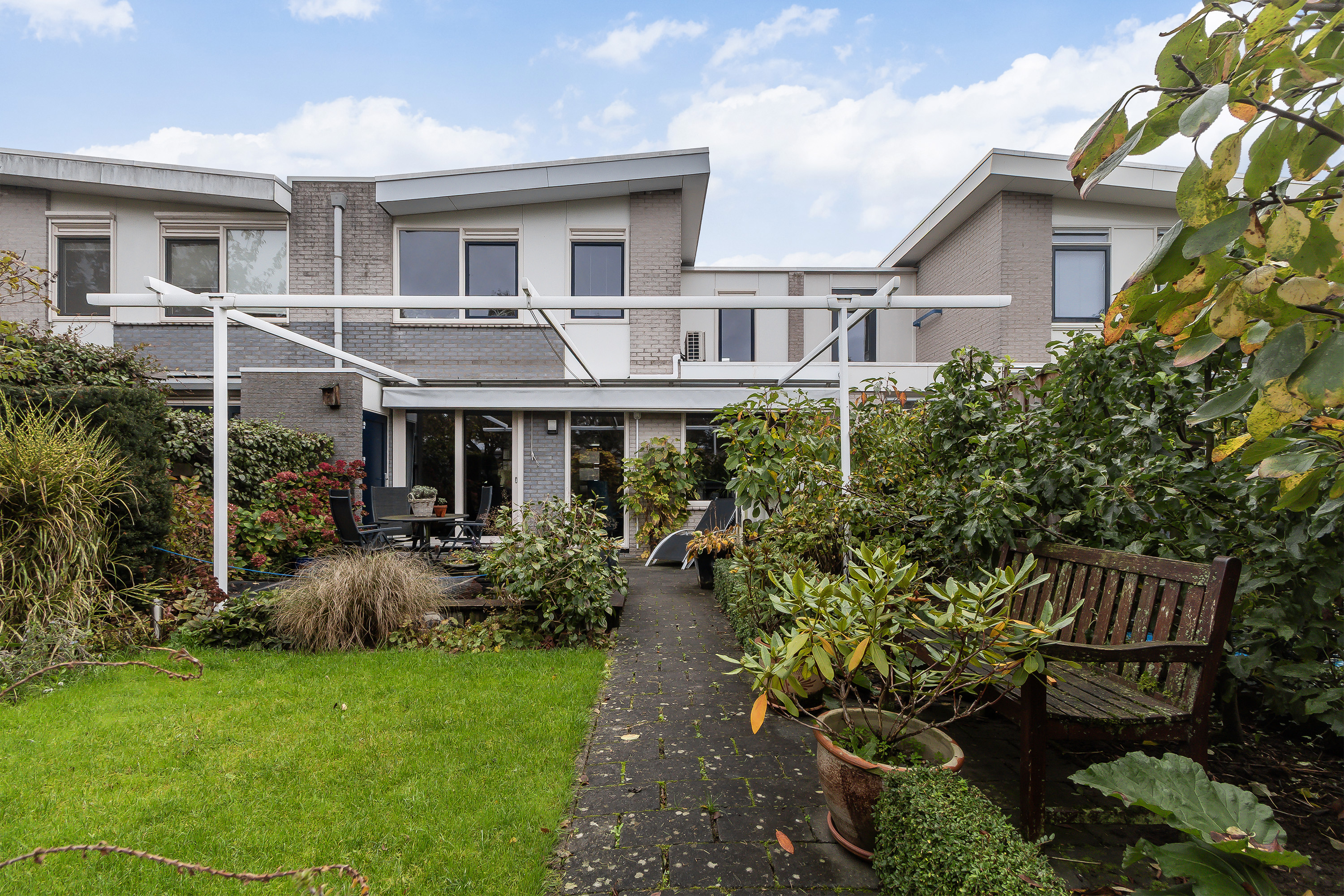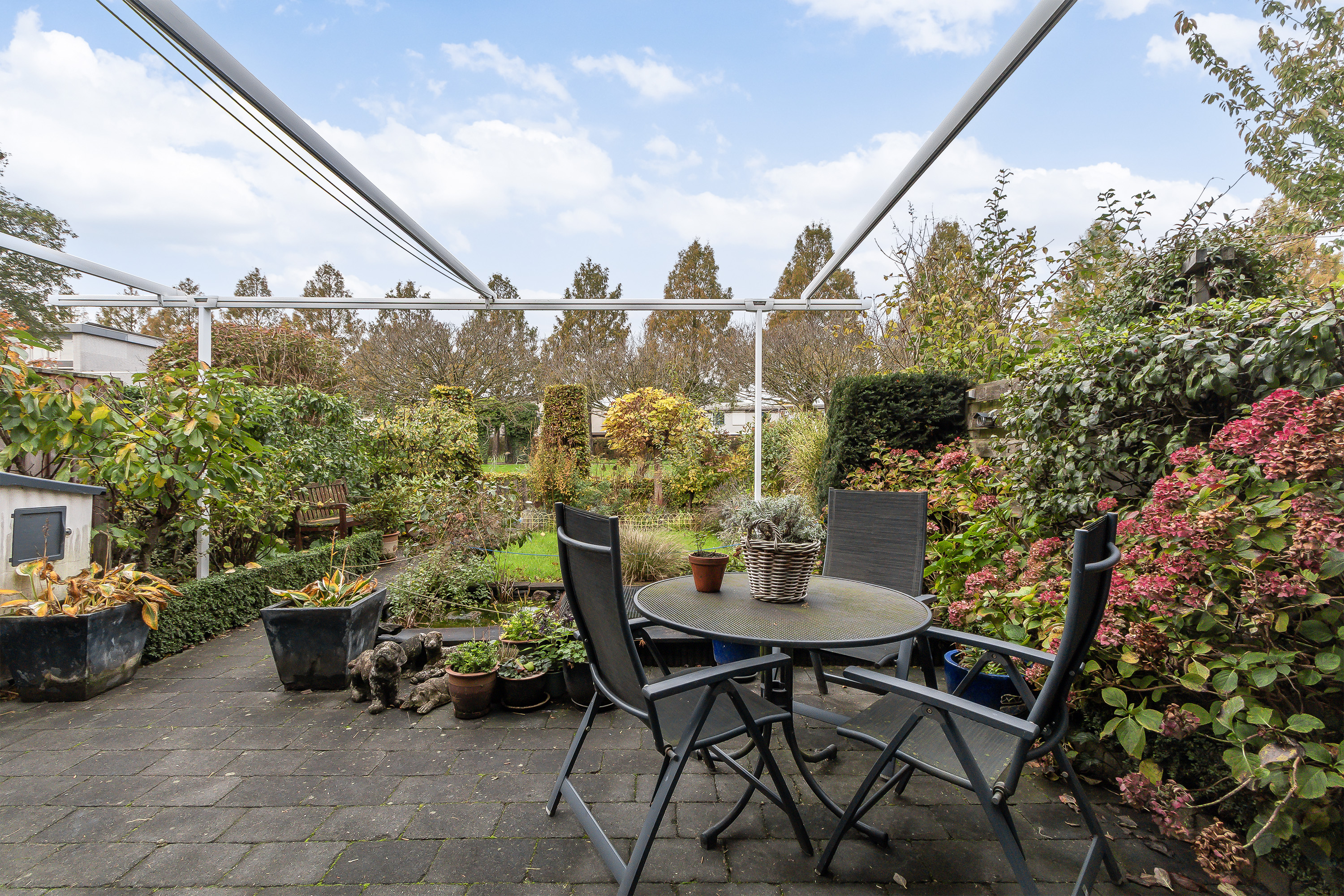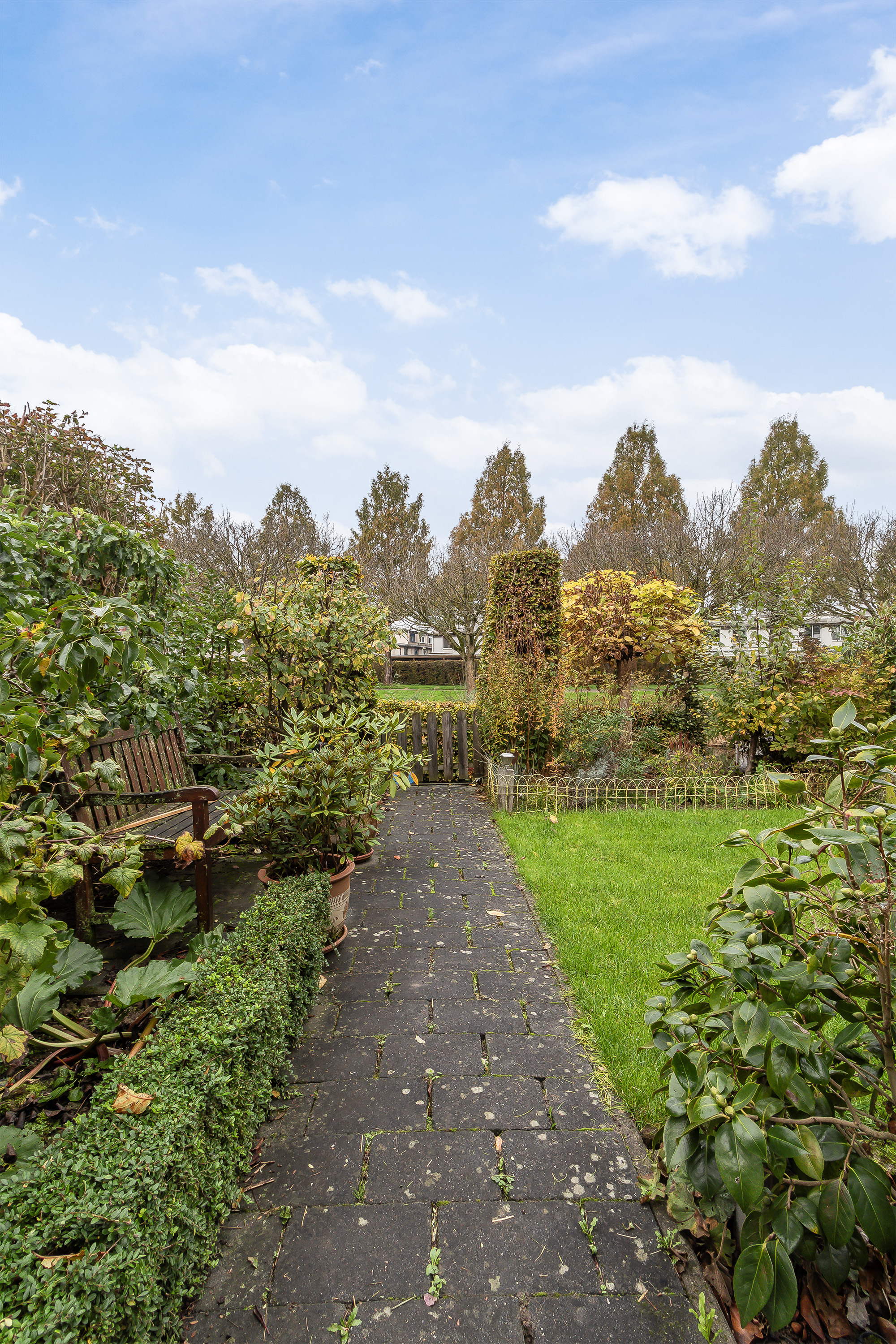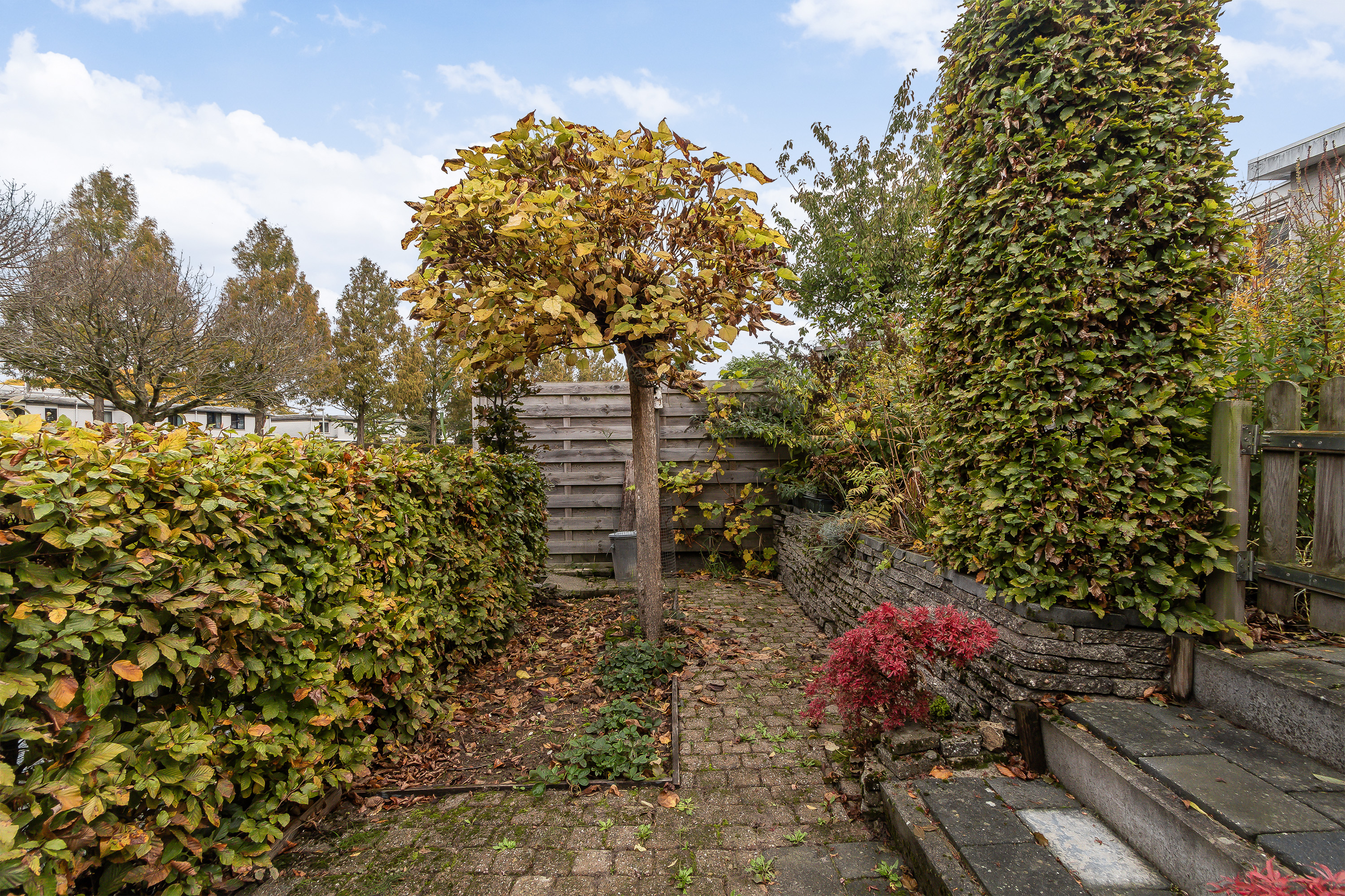 - Achtertuin: gesitueerd op het westen, grenzend aan een waterloop. Aangelegd met houten schuttingdelen, een betegeld terrasgedeelte, gras, sierbestrating, borders, een vijver en aan de achterzijde een afstap naar een waterterras. Tuinkast. Buitenkraan.