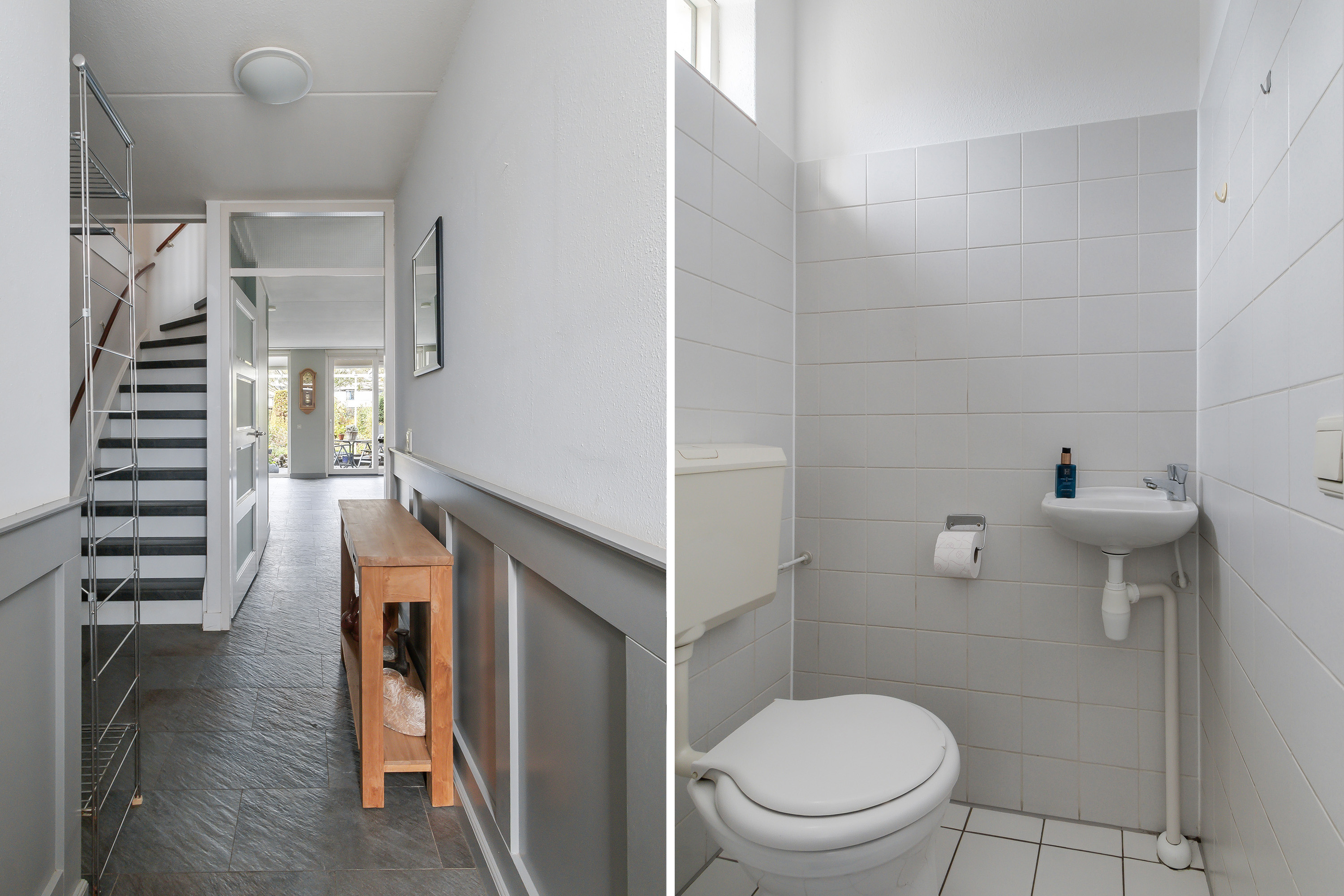 - Entree, hal met een wandlambrisering, de meterkast, een toilet, trap naar de verdieping en deuren naar de inpandige garage en de woonkamer;