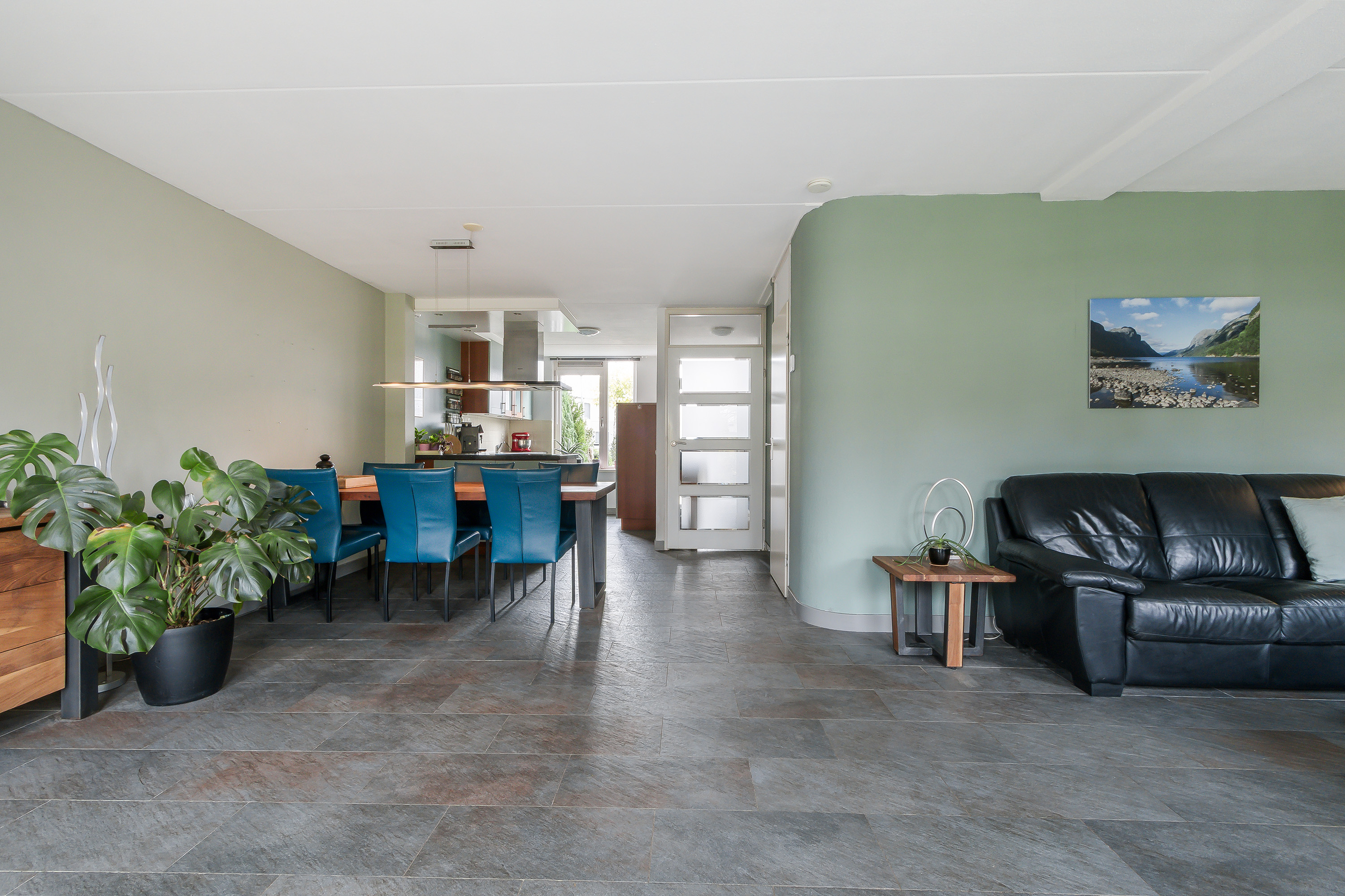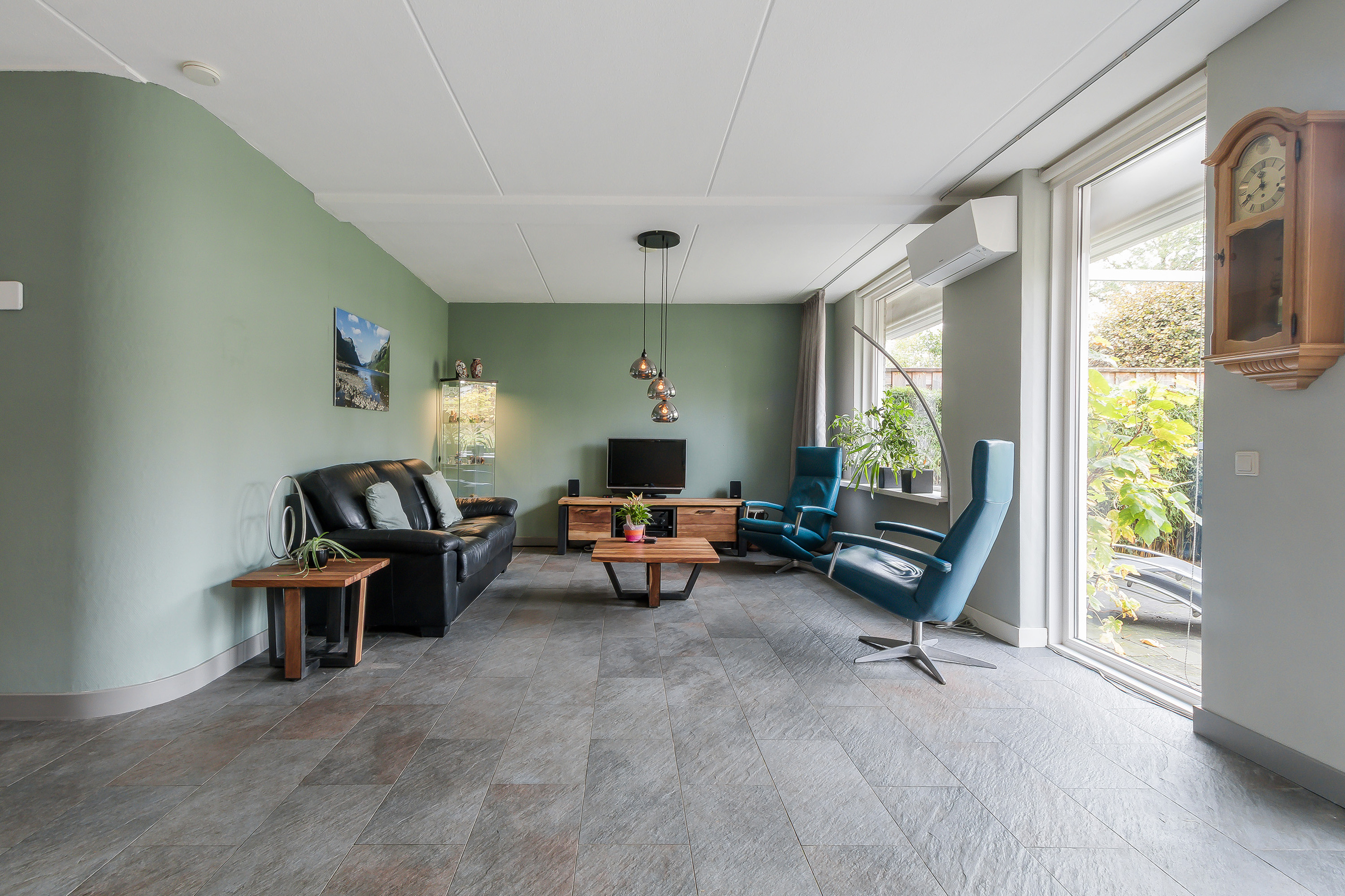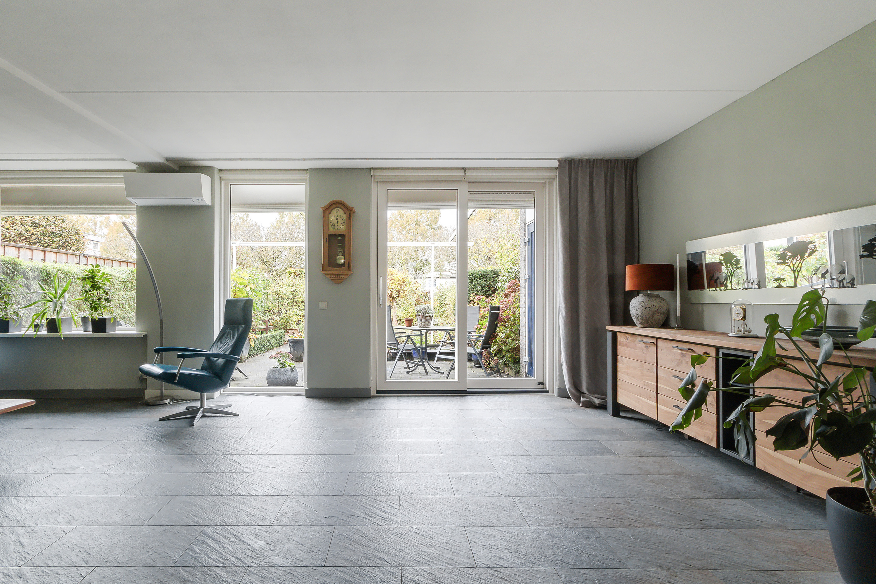 - Tuingerichte woonkamer met trapkast met in de tuingevel een kunststof schuifpui, een doorlopend raam en een groot raamkozijn, een fijne lichtinval is dus verzekerd;