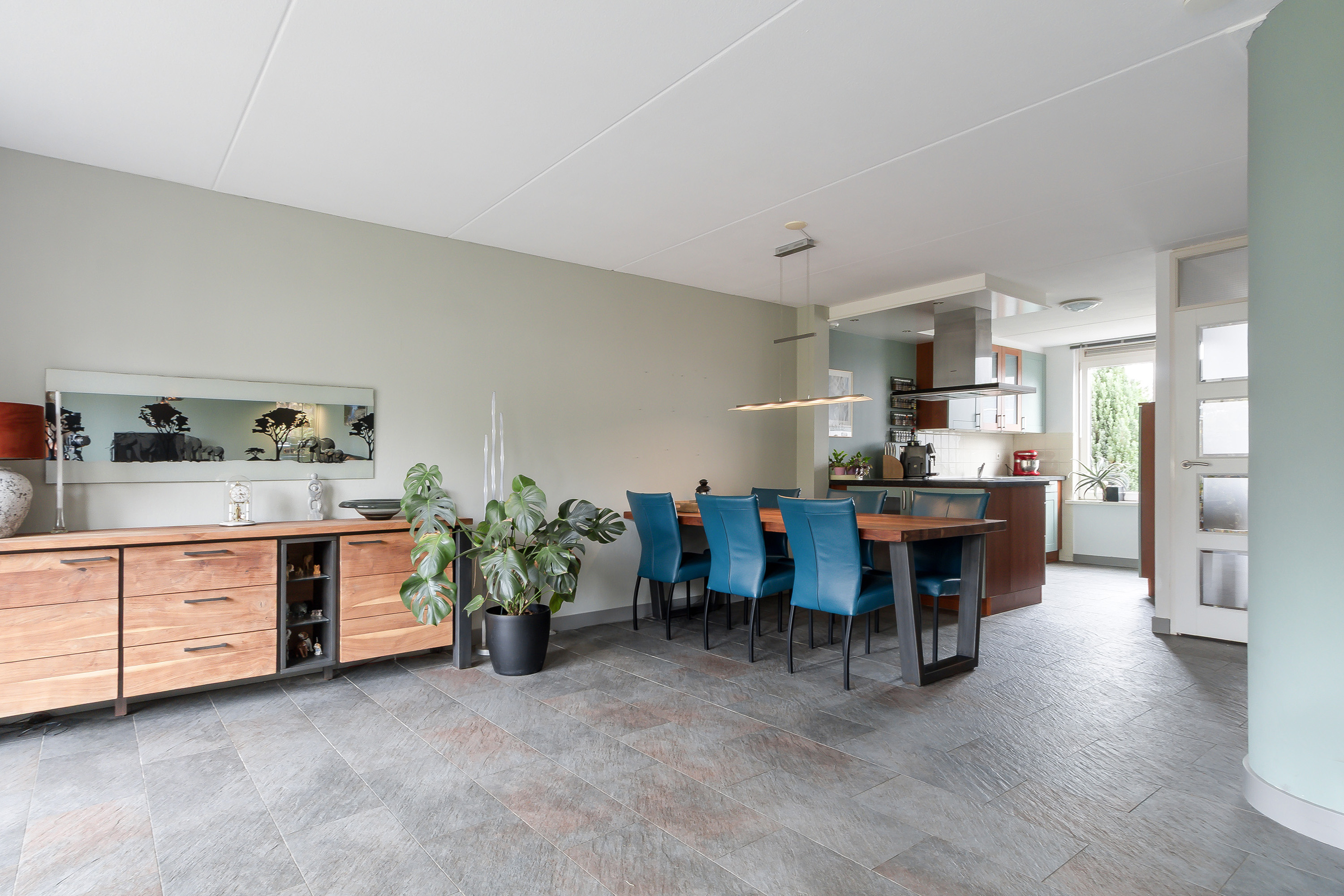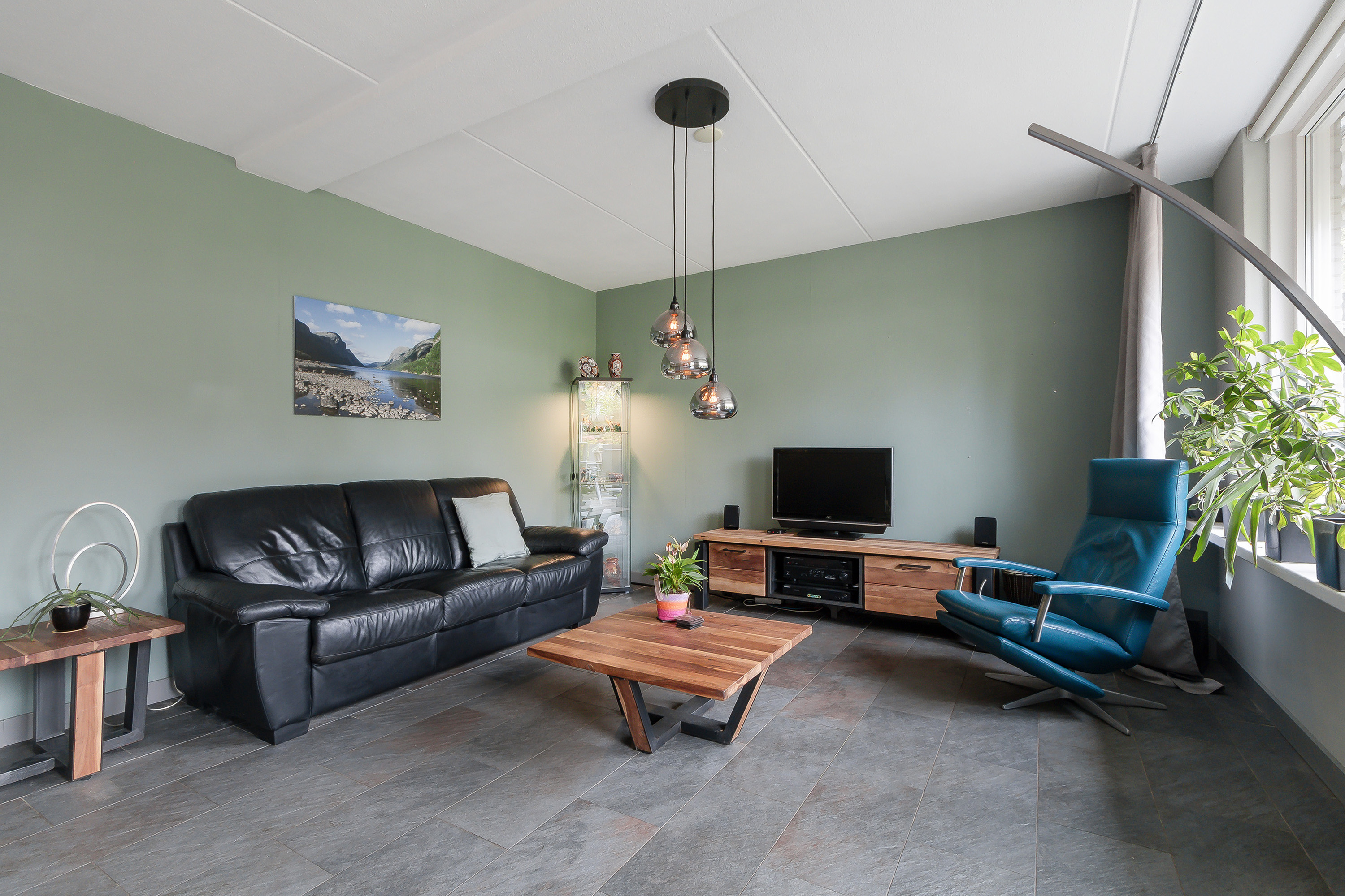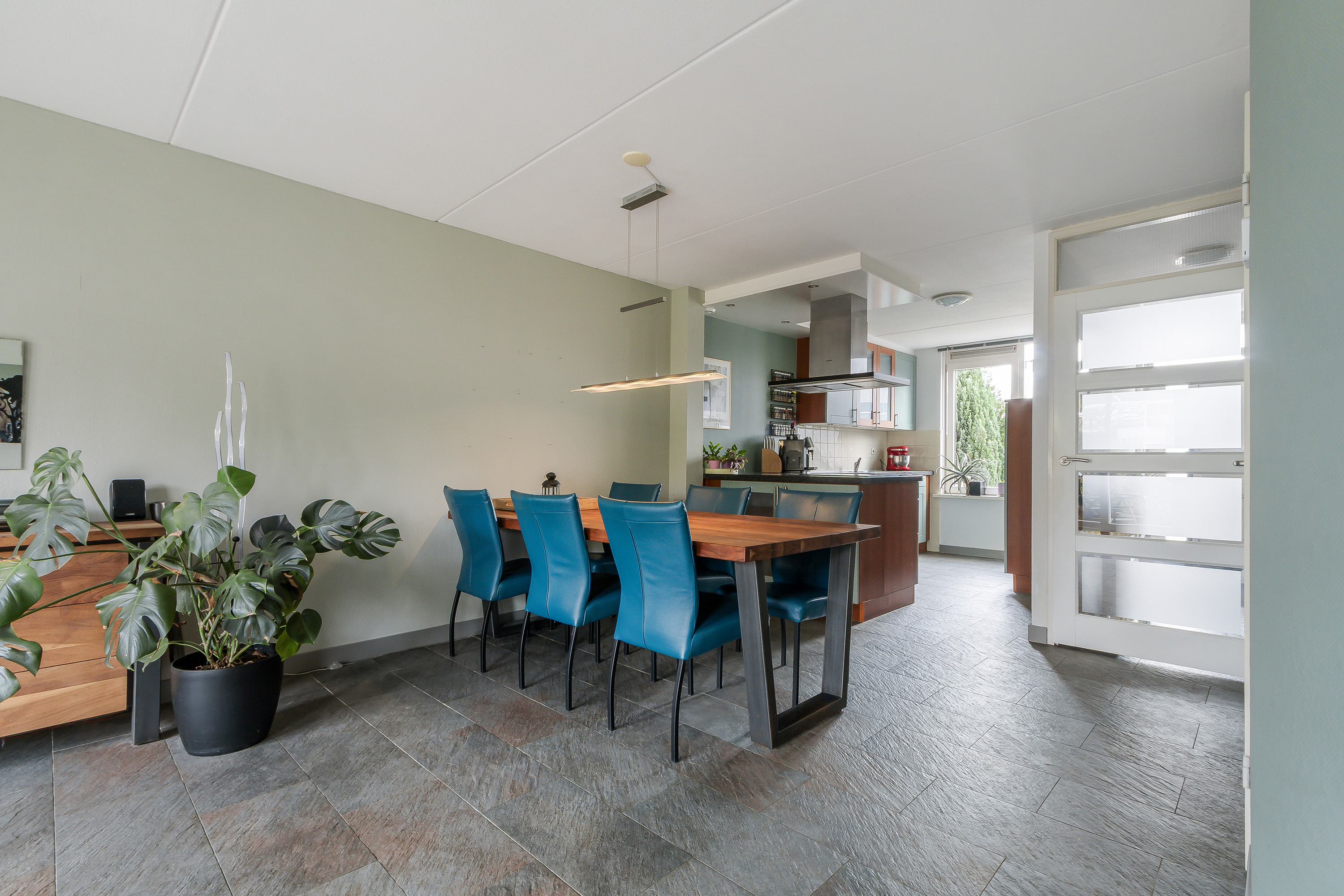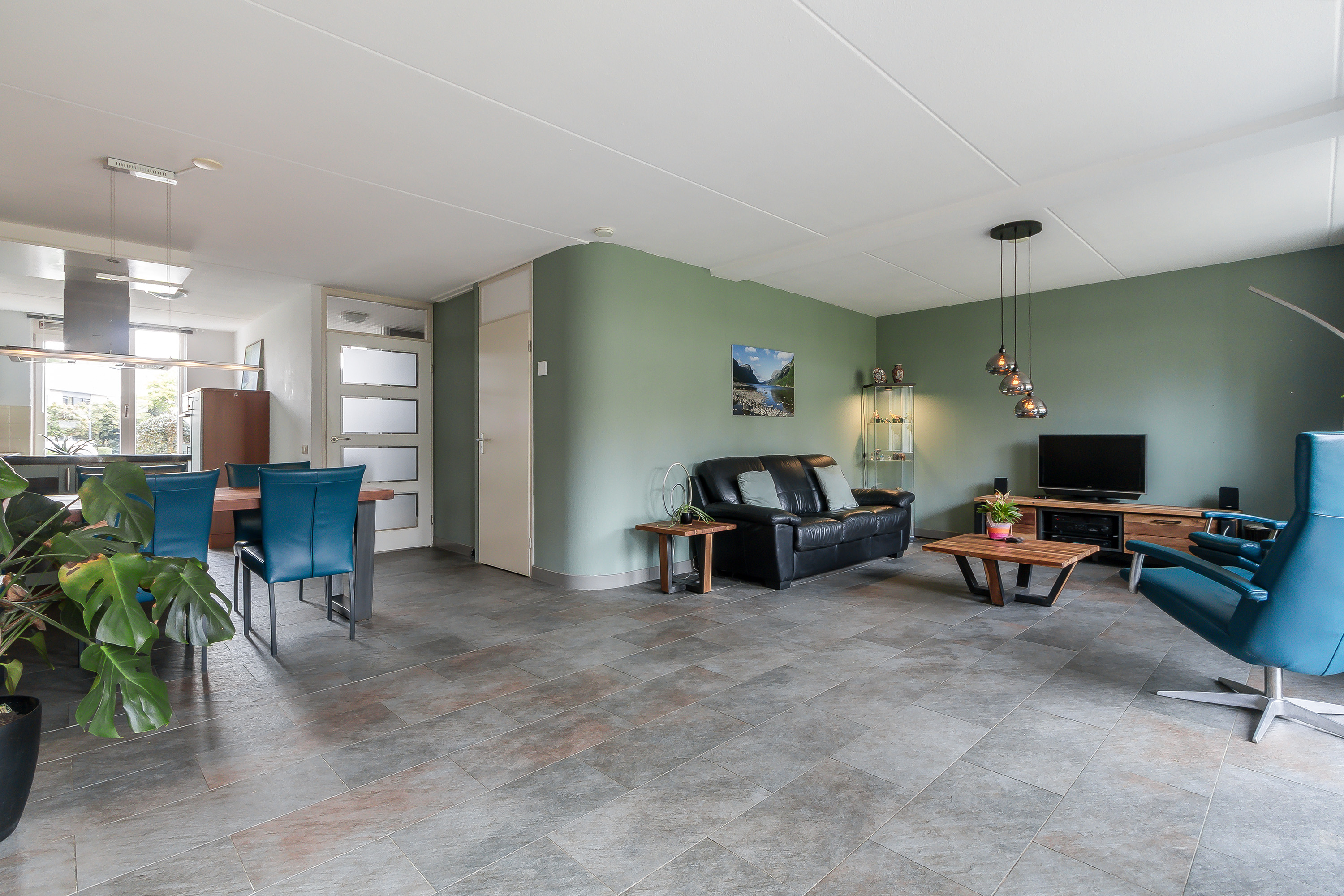 - Tuingerichte woonkamer met trapkast met in de tuingevel een kunststof schuifpui, een doorlopend raam en een groot raamkozijn, een fijne lichtinval is dus verzekerd;