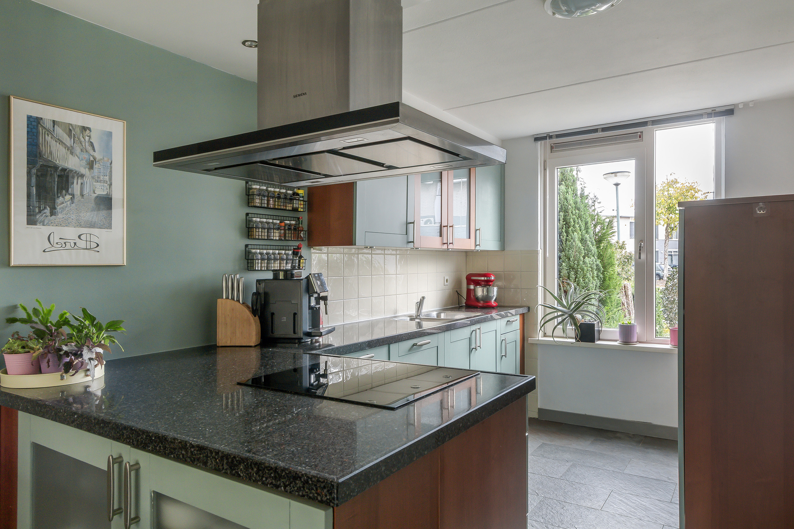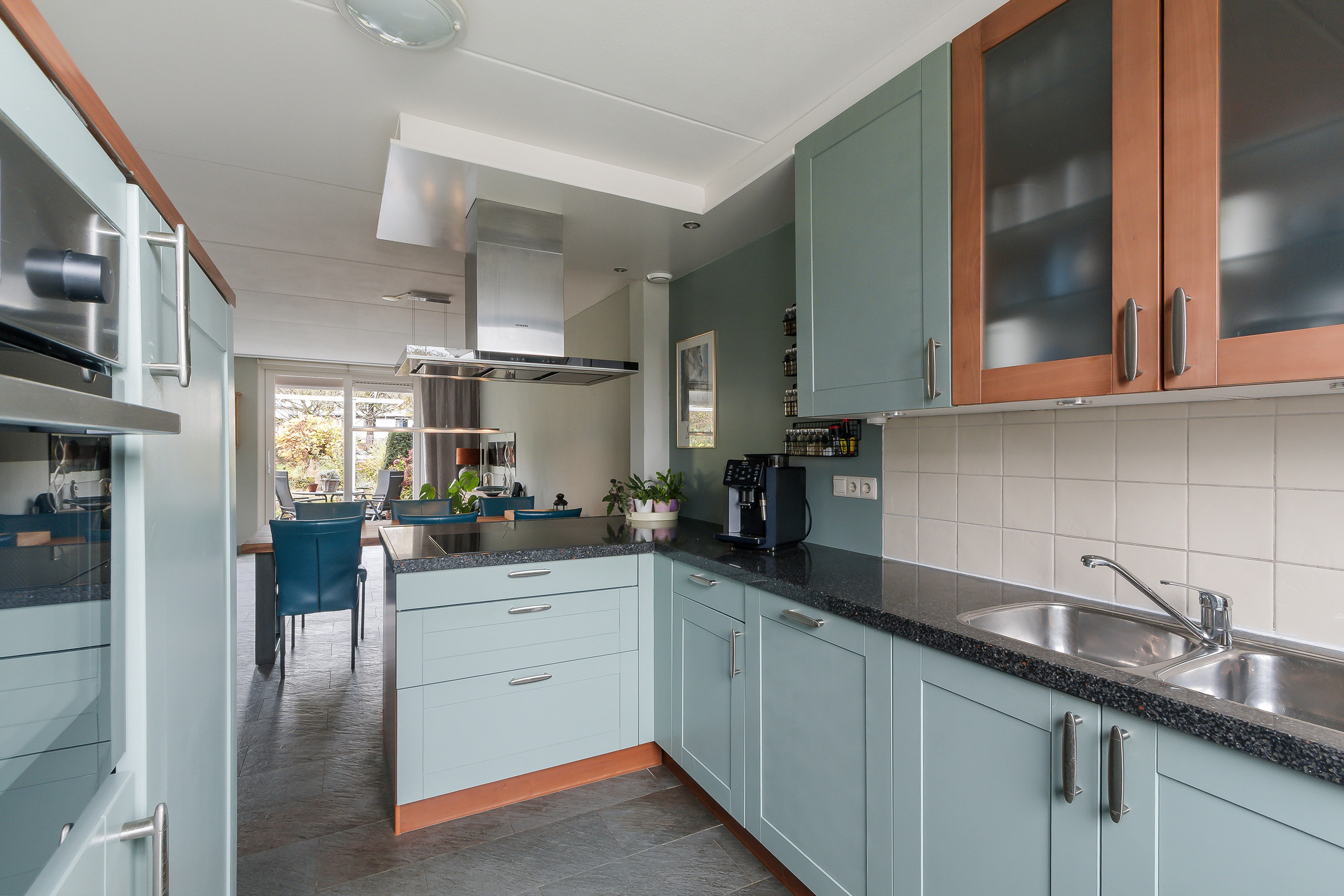 - Open keuken aan de voorzijde met een inrichting in 2 secties (een hoekopstelling en een wandopstelling) met o.a. een composiet werkblad, een dubbele rvs spoelbak, diverse onder- en bovenkasten, laden, app.: rvs afzuigschouw, een 4-zone inductiekookplaat, een vaatwasser (defect), een combi-oven, een koelkast en een vriezer;