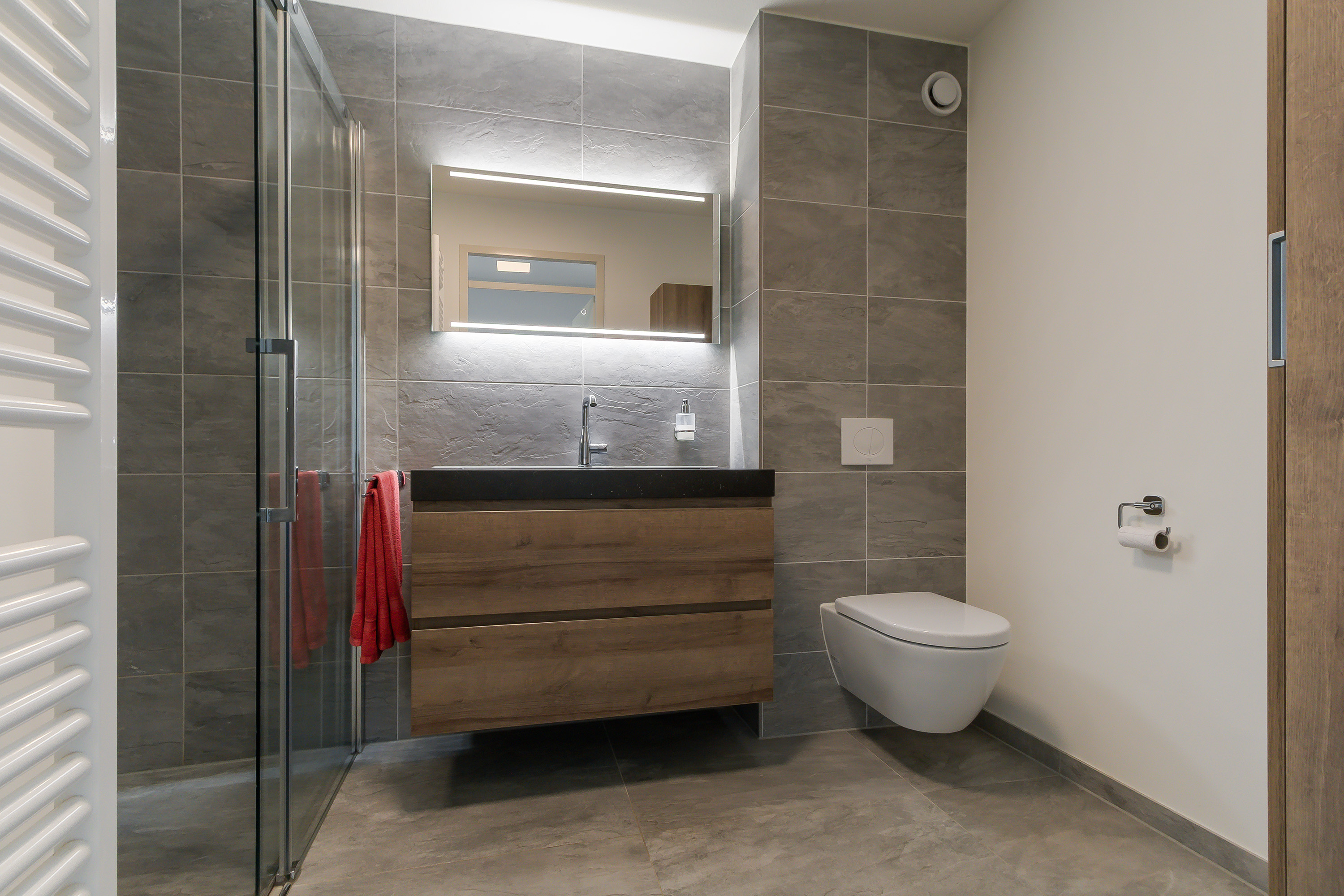 - Moderne badkamer (2018) in het midden van de verdieping met geheel betegelde wanden ter plaatse van het wastafelmeubel en de inloopdouche, verder gestucte wandafwerking, een plavuizen vloer, wit sanitair, een wastafelmeubel met spiegelcombinatie (incl. verlichting), een inloopdouche met drainafvoer en een thermostaatkraan, een bij het wastafelmeubel bijpassend wandmeubel en een designradiator.