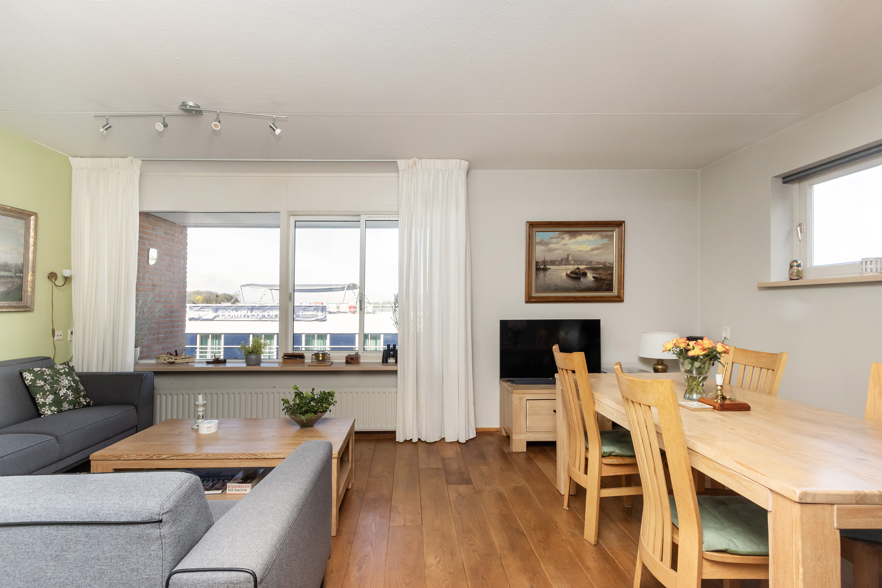 De bovenste verdieping (+1) herbergt de lichte woonkamer. Dankzij de grote raampartijen baadt deze ruimte in natuurlijk licht en geniet u van een fenomenaal uitzicht op het unieke punt waar de Beneden Merwede, de Noord en de Oude Maas samenkomen. Een plek waar rust en levendigheid perfect samenkomen.