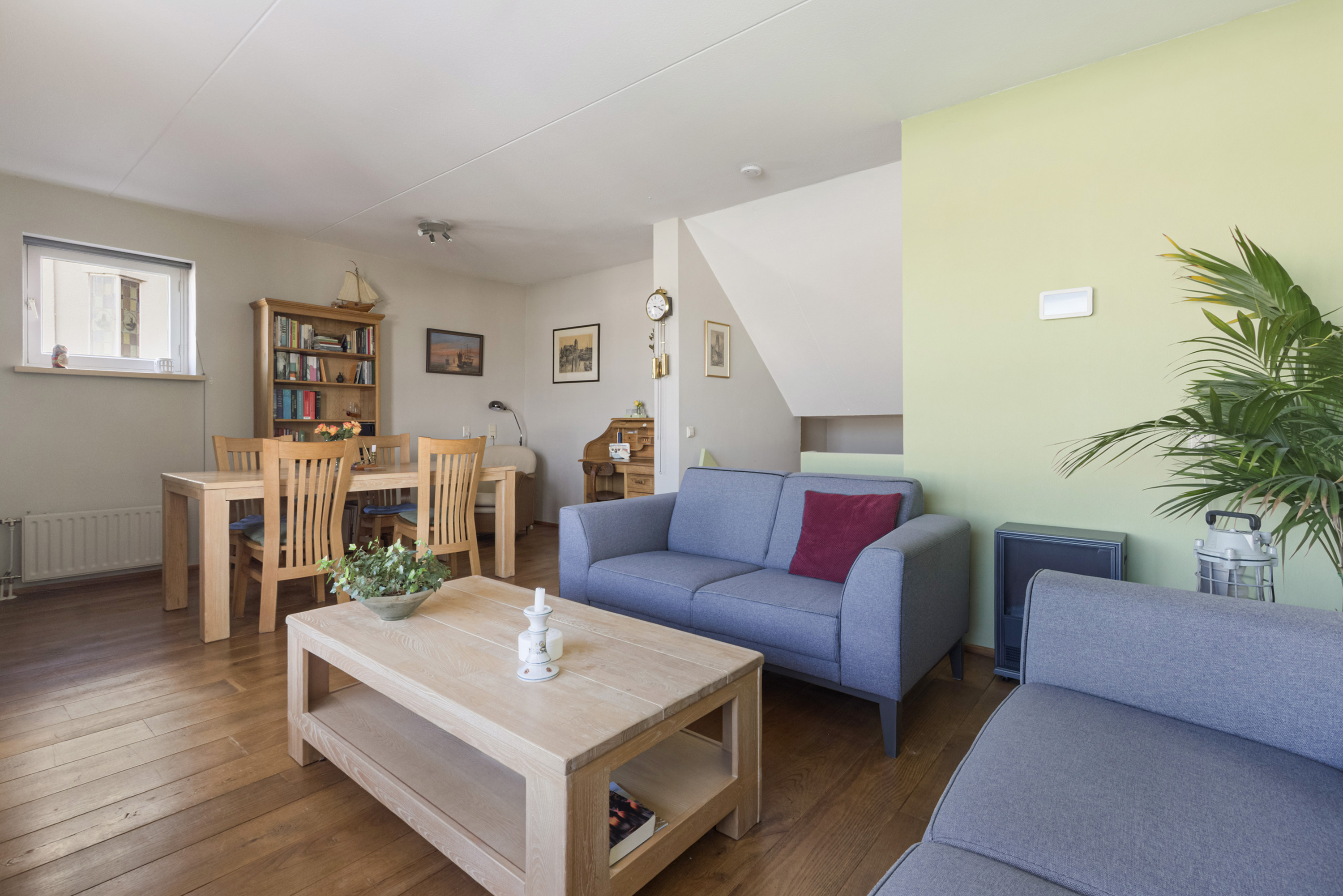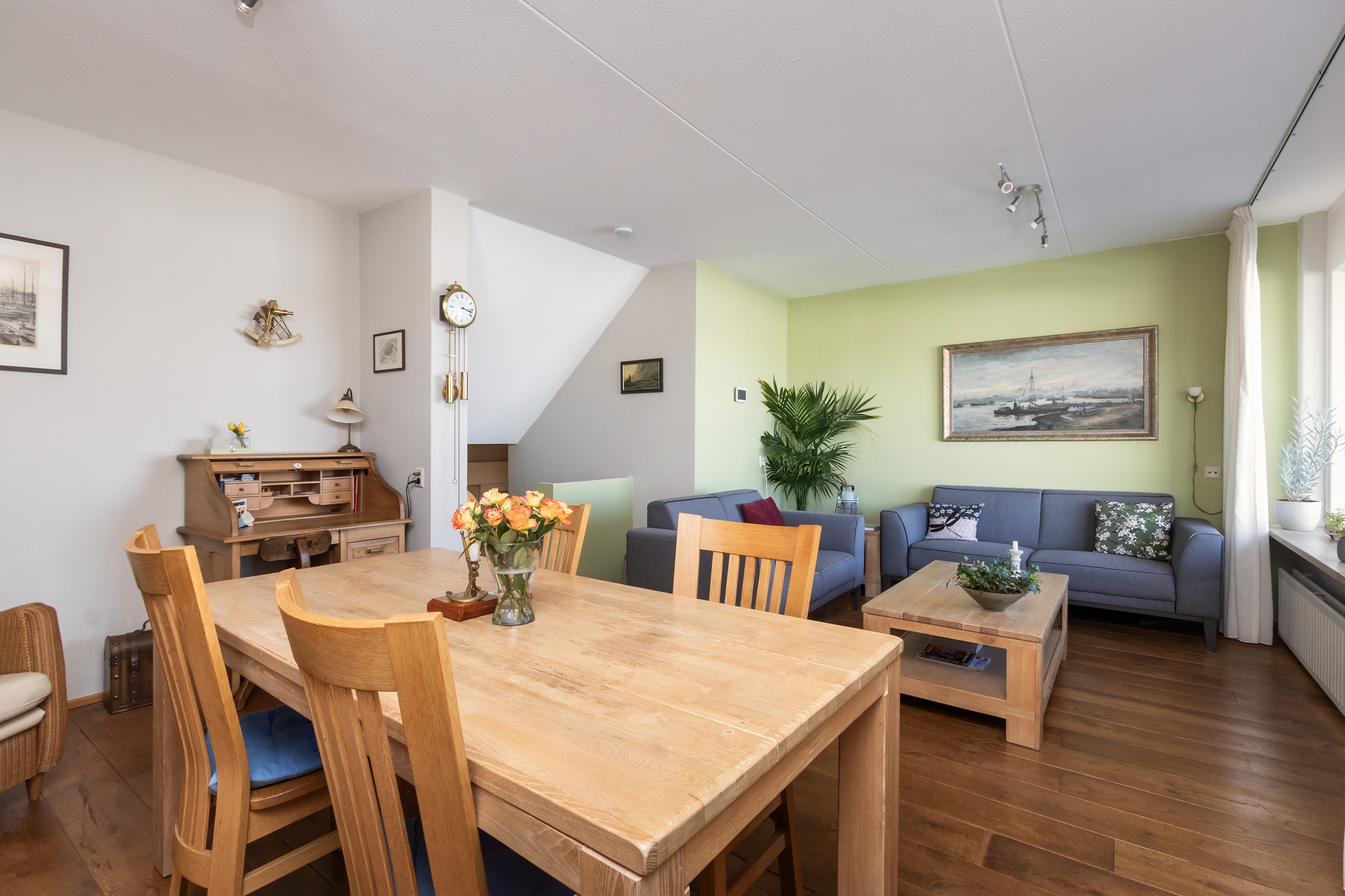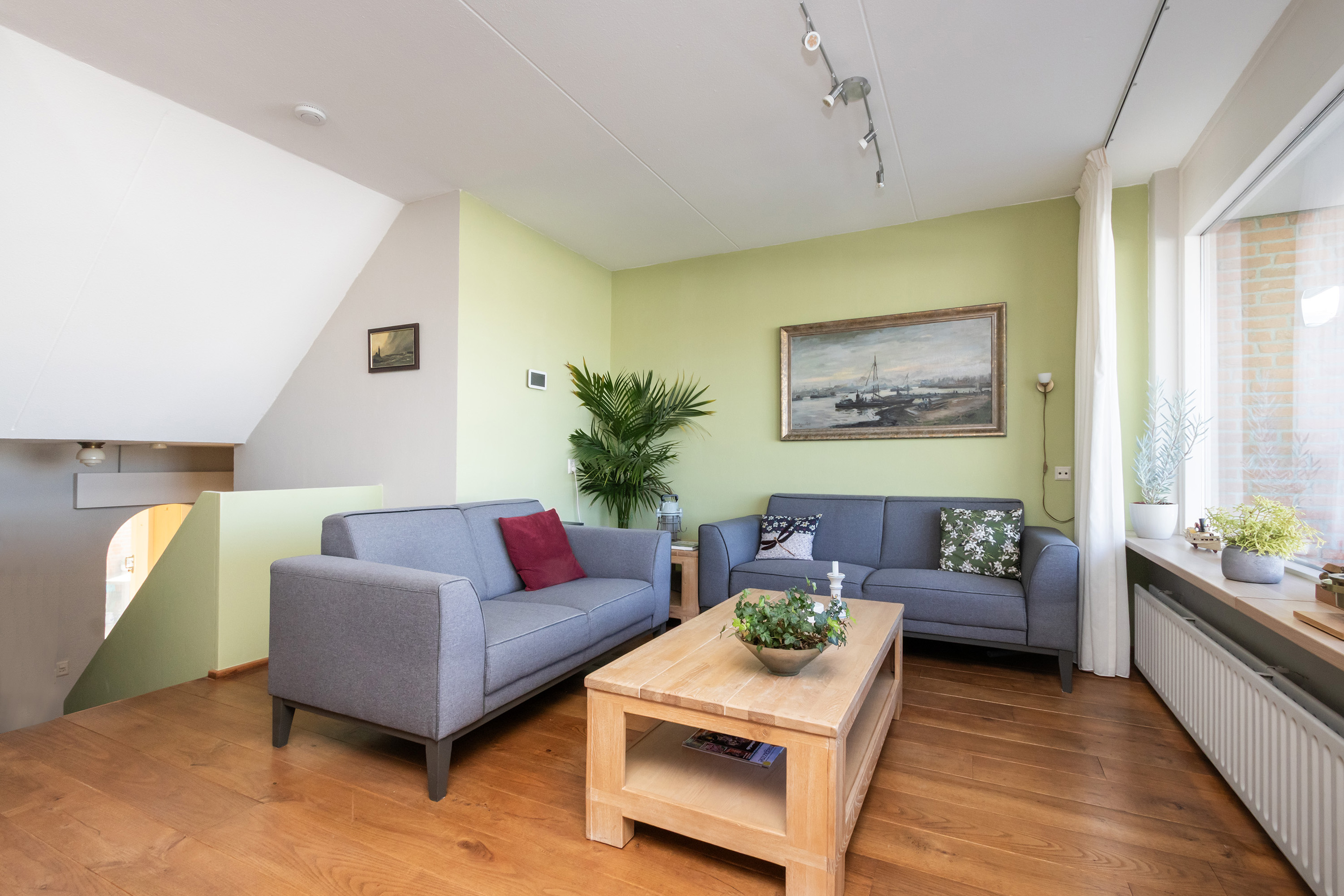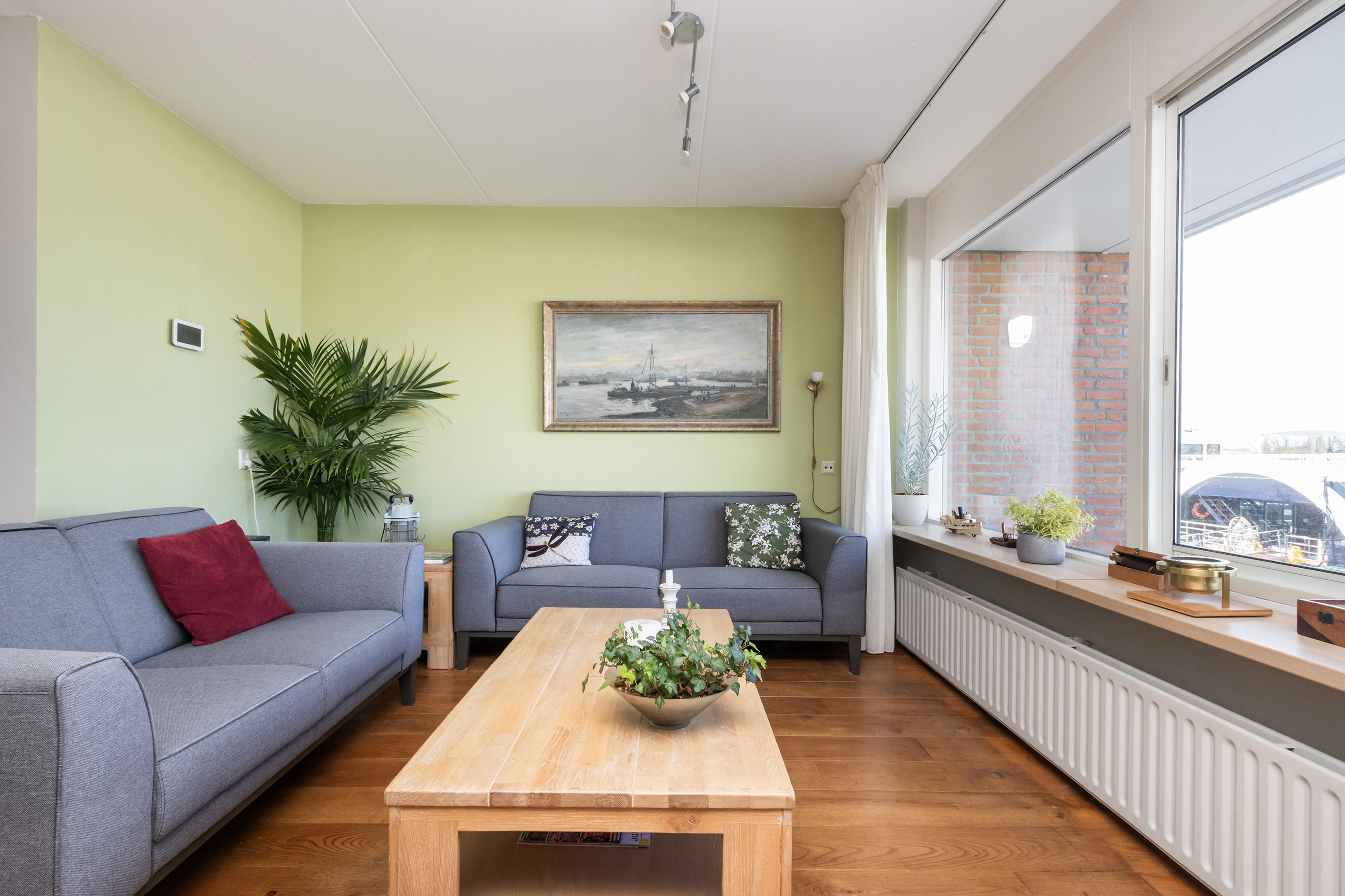 - Woonkamer is te vinden op de bovenste verdieping (8 traptrede) van het appartement. De woonkamer heeft veel lichtinval vanwege de vele ramen met daarbij een fantastisch uitzicht de rivier.