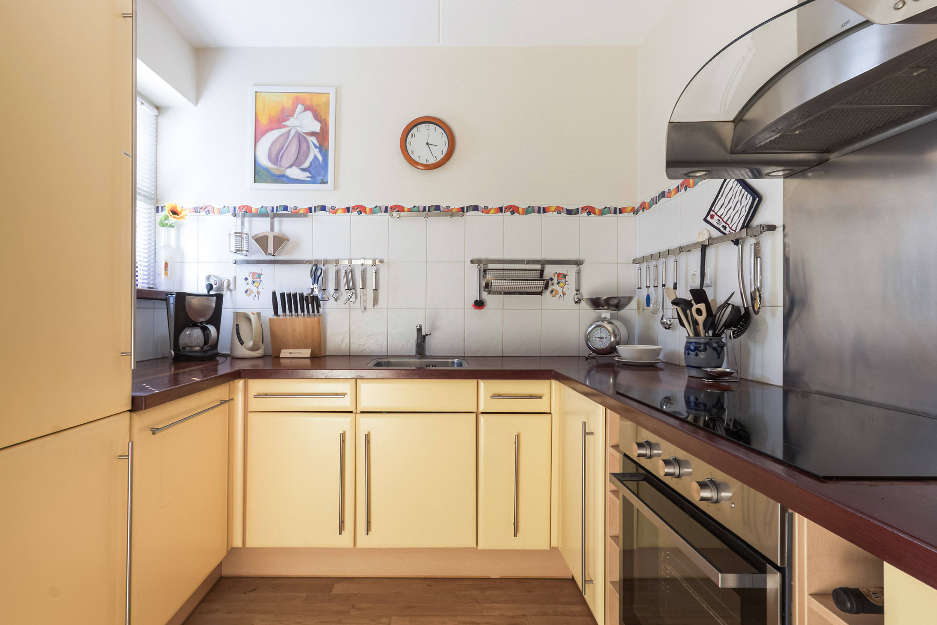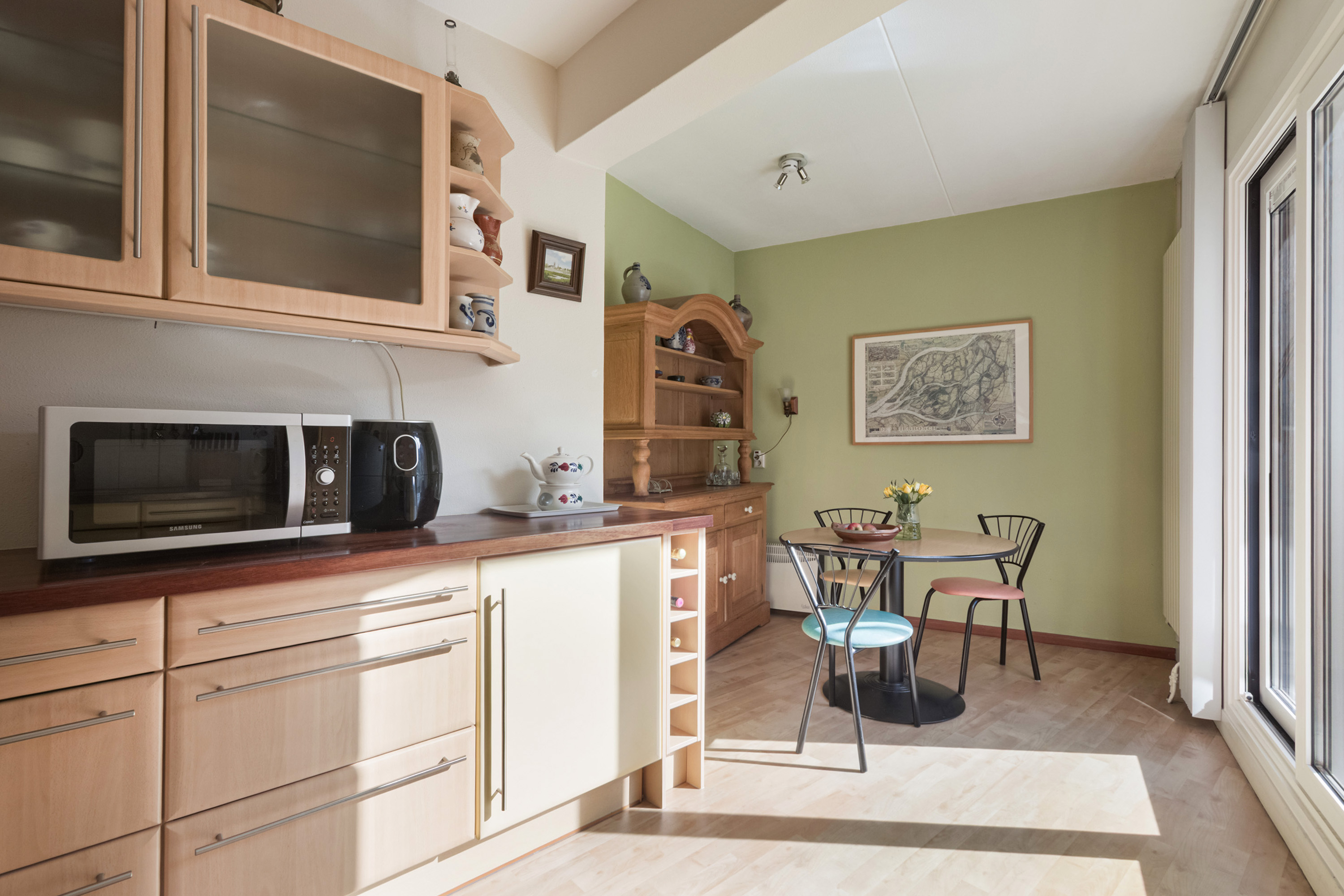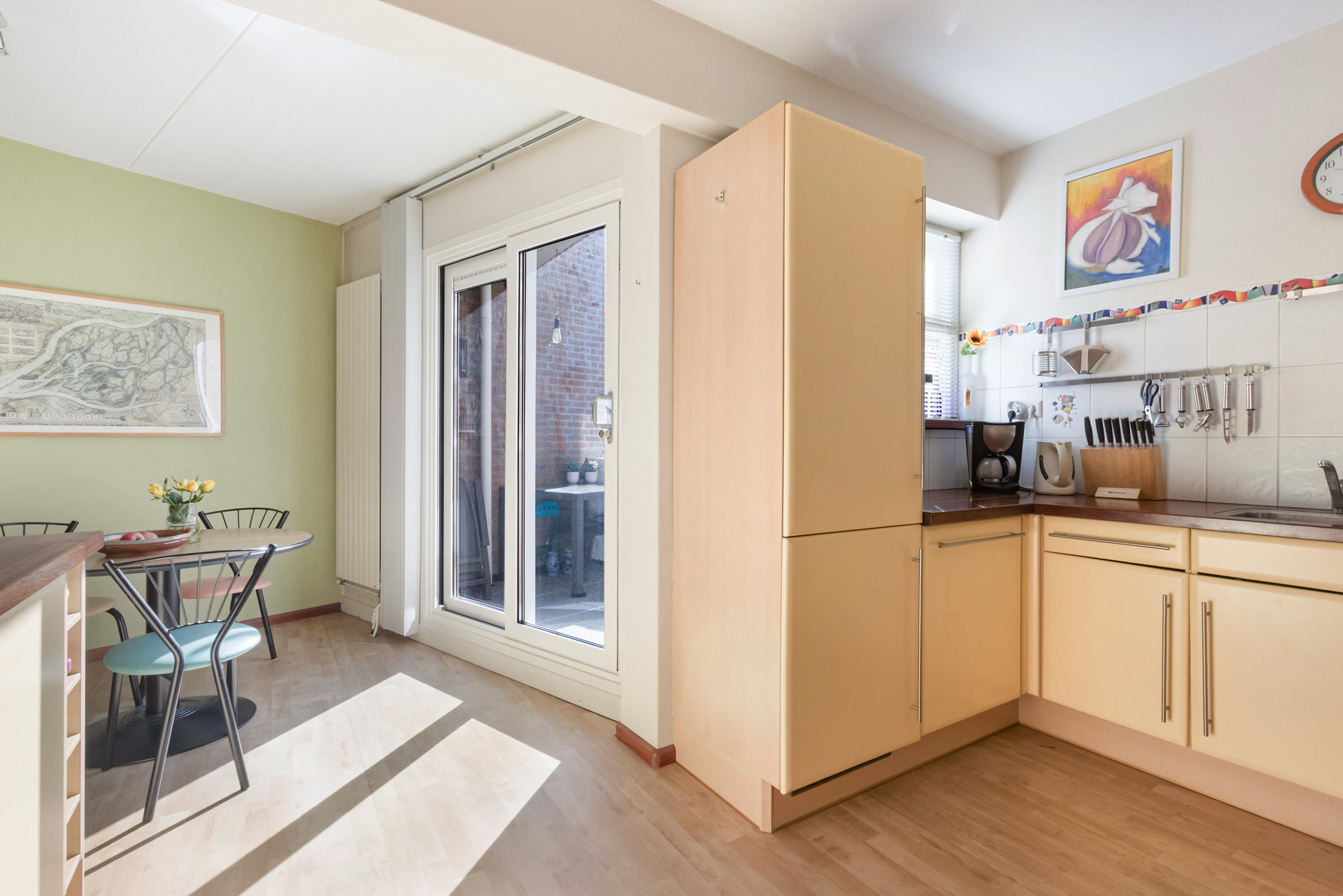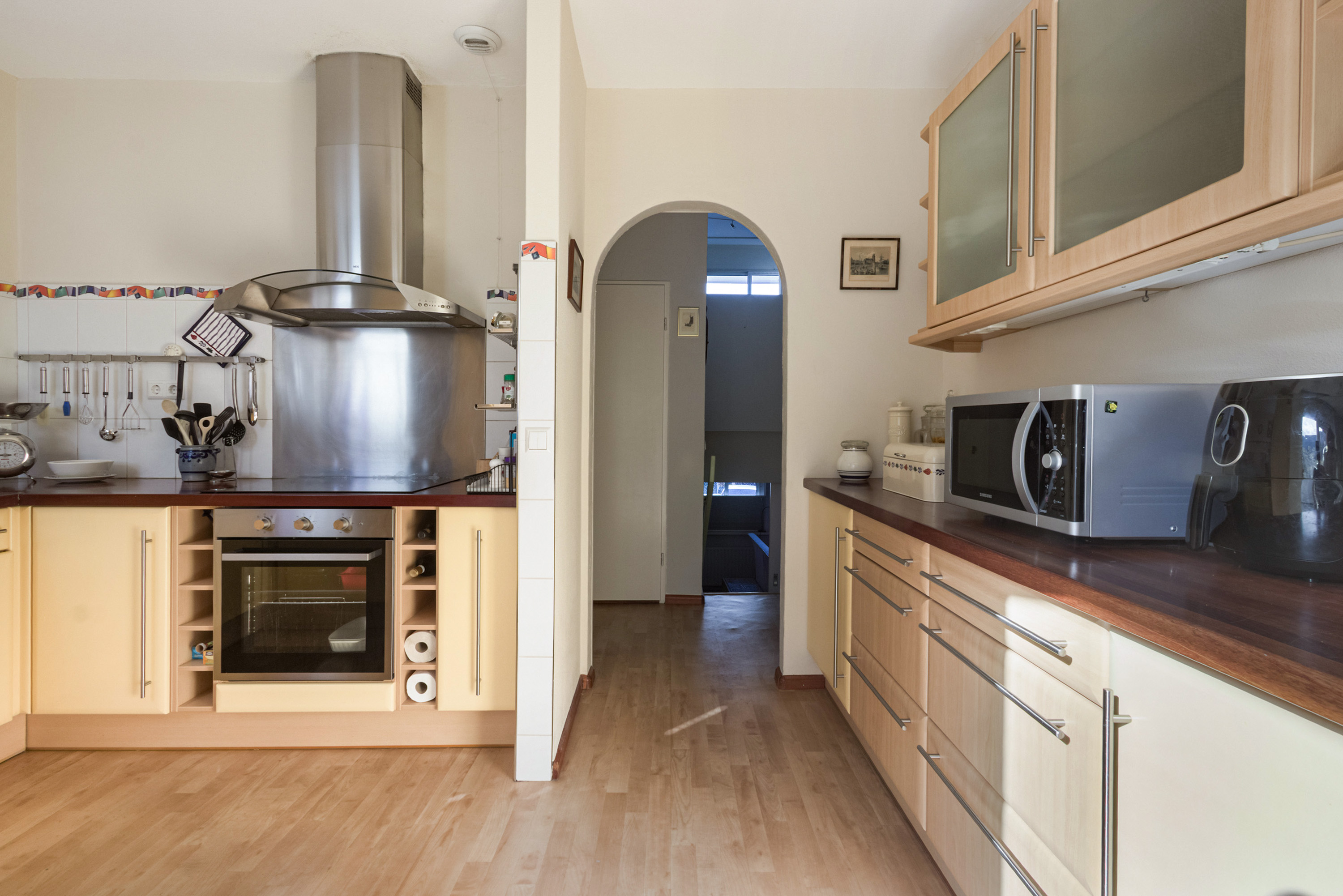 - Keuken, gelegen aan de achterzijde. De keuken is uitgevoerd in een hoekopstelling (u-vorm), met een gedeeltelijk betegelde achterwand, diverse onderkasten en laden. De keuken is voorzien van een RvS-spoelbak, 10L close-in boiler, 4-pits inductiekookplaat, RVS afzuigkap (recirculatie), koel-vriescombinatie, oven en een vaatwasser. Extra rechte wandopstelling met diverse onder en bovenkasten + laden. In de keuken is er tevens plek voor een eettafel en middels de kunststof schuifpui toegang tot het balkon;