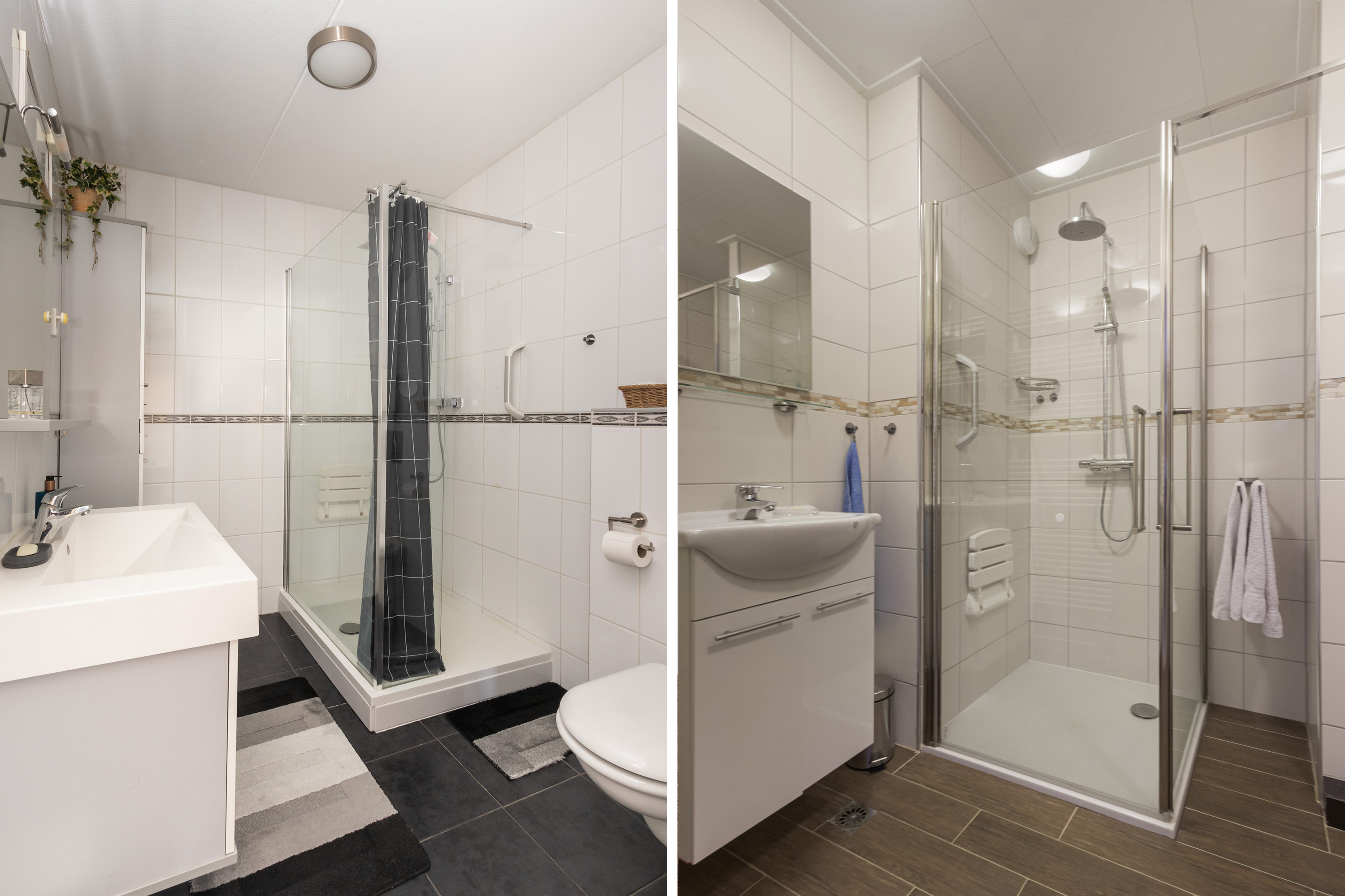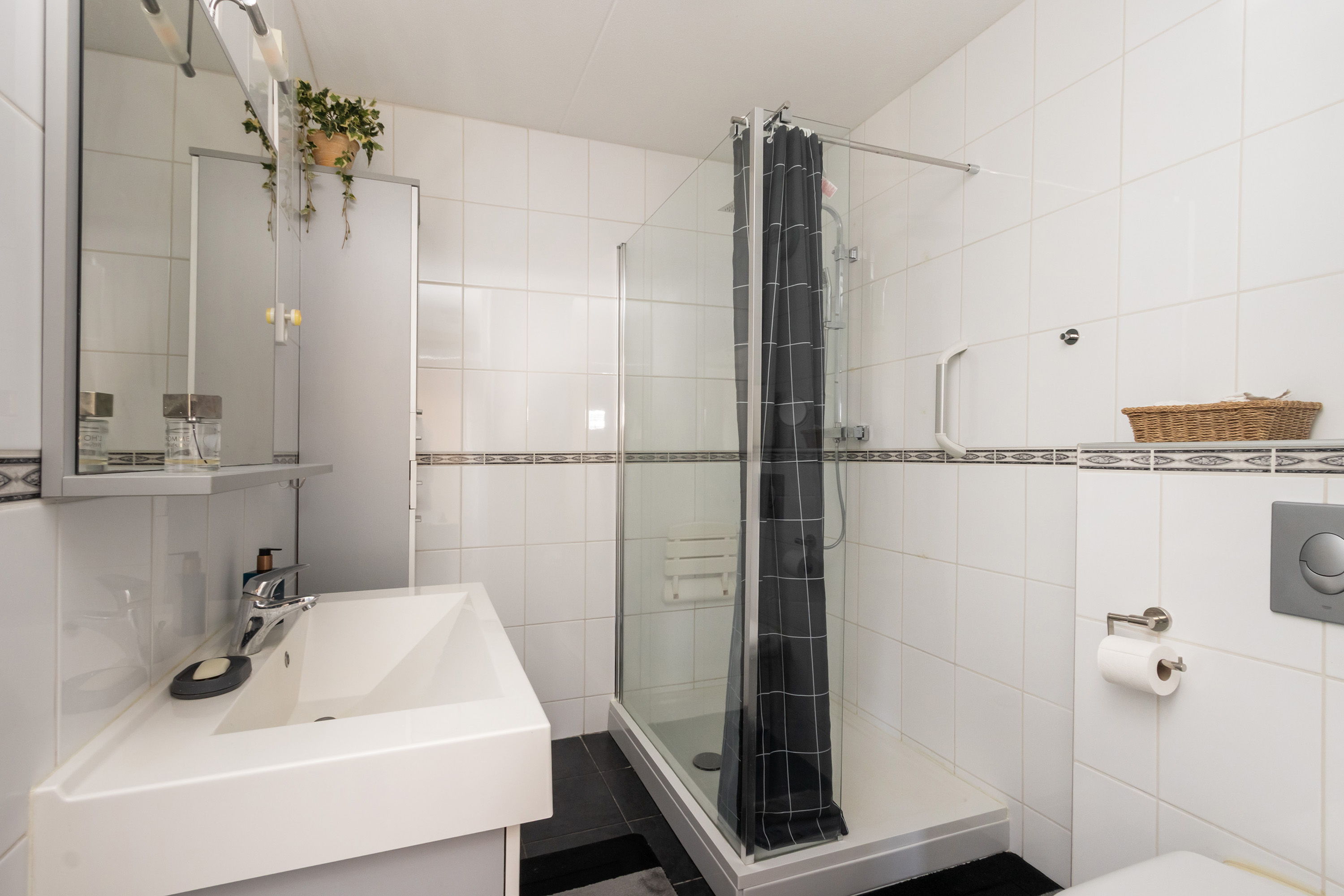 - Badkamer, toegankelijk via de slaapkamer, met geheel betegelde wanden, inloopdouche met glazenwand, wastafelmeubel, wandcloset en een handdoekradiator;