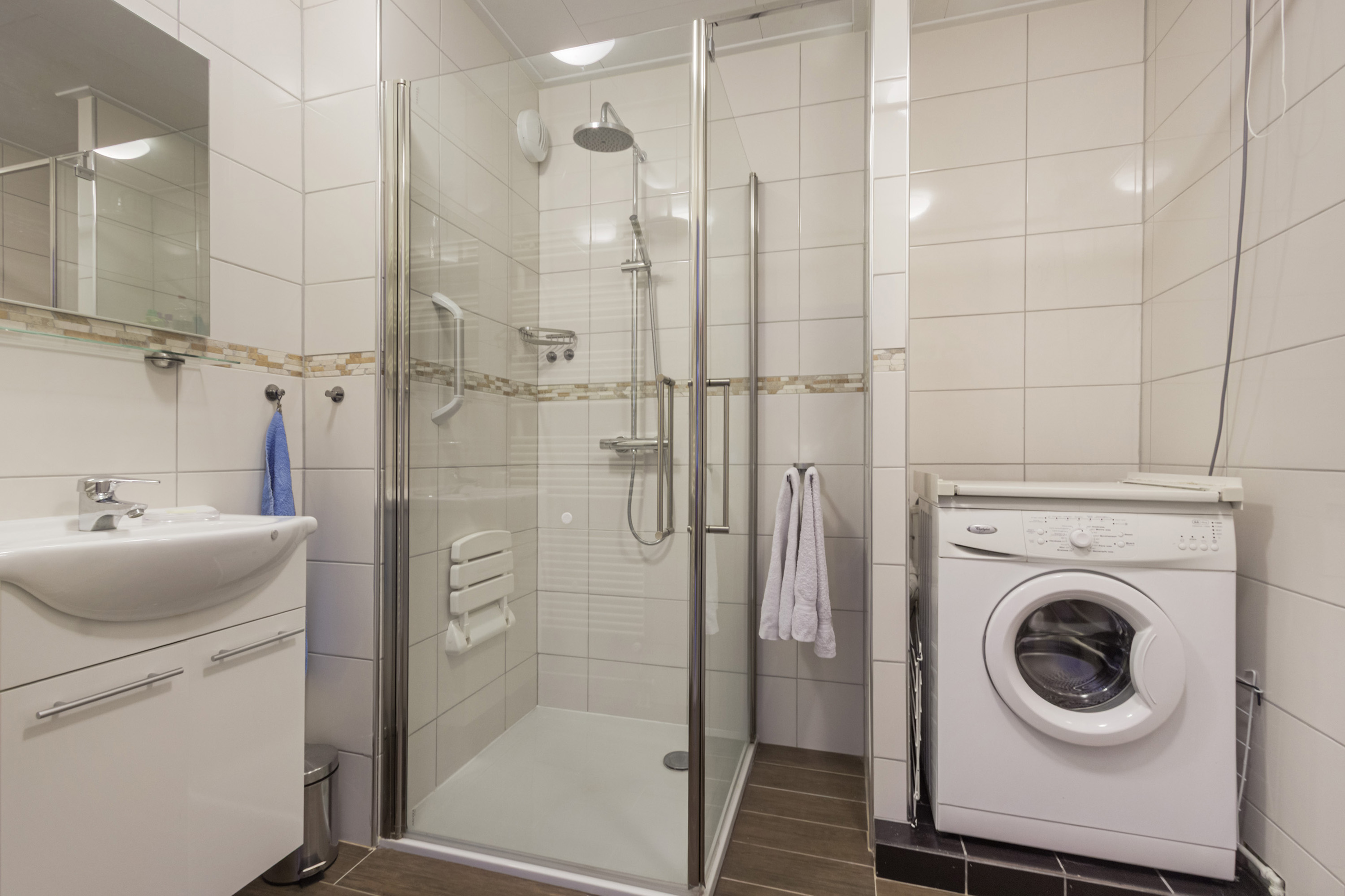 - Badkamer 1, met plavuizenvloer, geheel betegelde wanden, wastafelmeubel, douchecabine met regendouche, wasmachineaansluiting en een handdoekradiator.