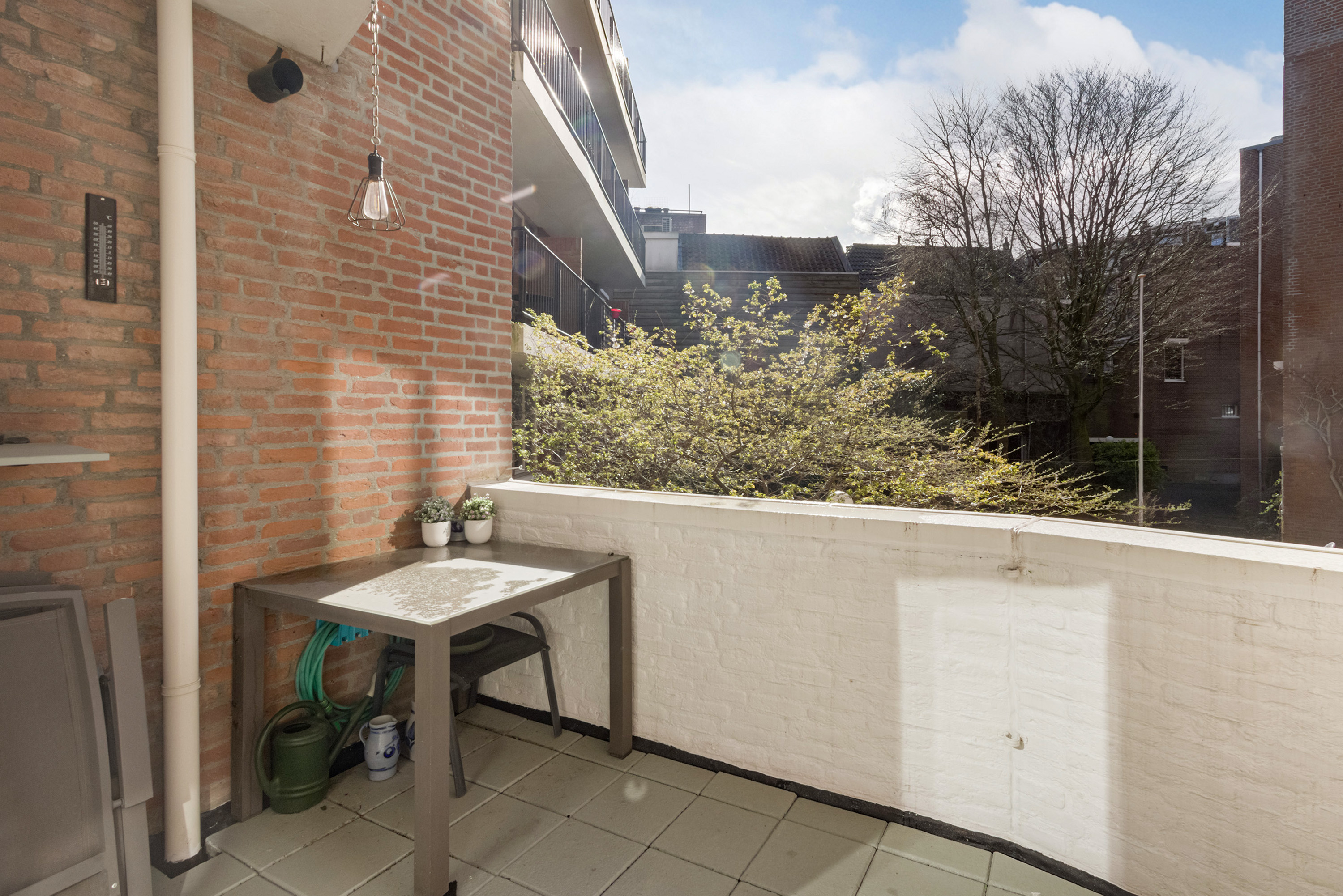 - Balkon, gelegen op het zuidwesten, aan de achterzijde van de woning. Het dakterras is volledig betegeld en er is een lage stenen omheining en uitkijkend op de binnentuin.