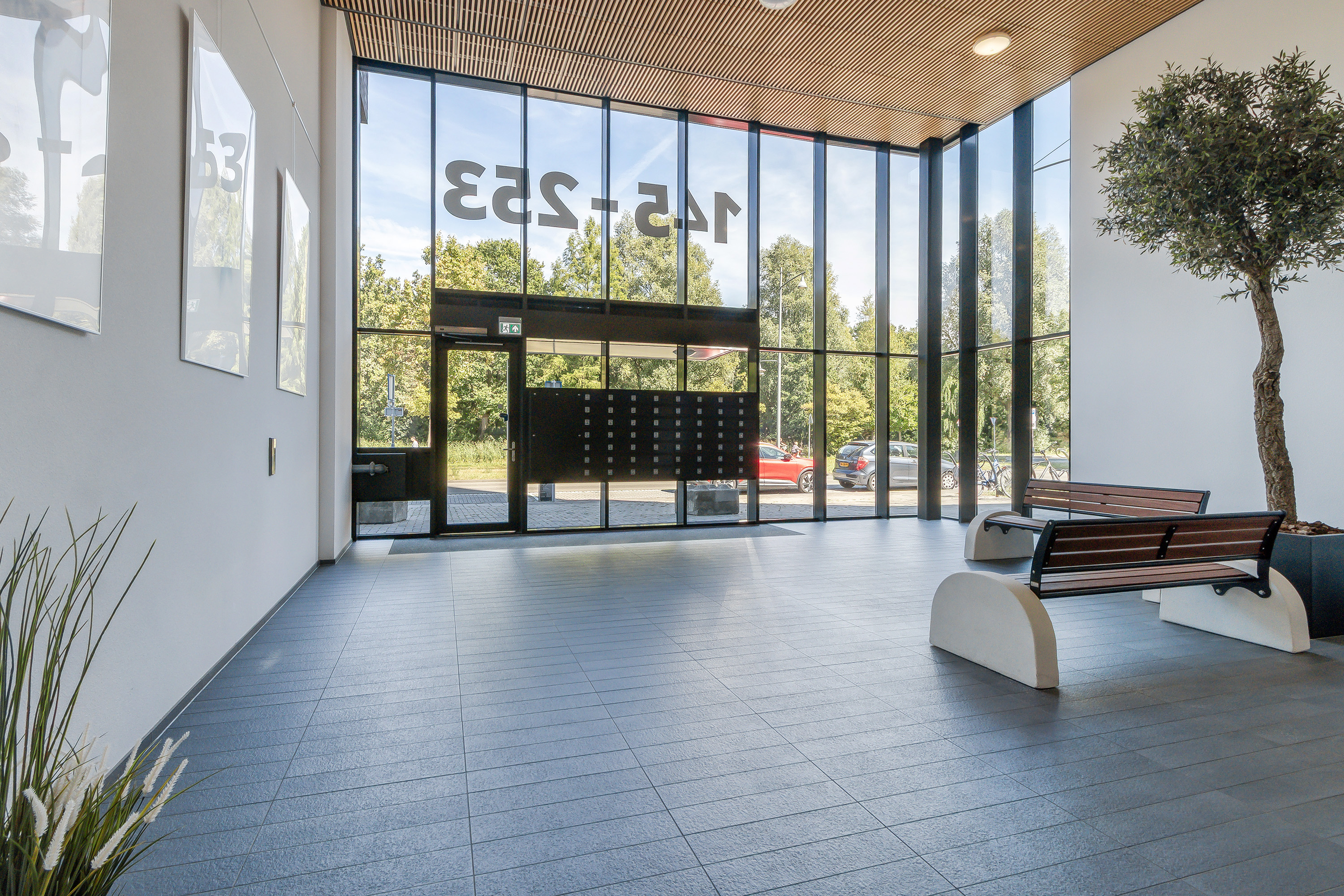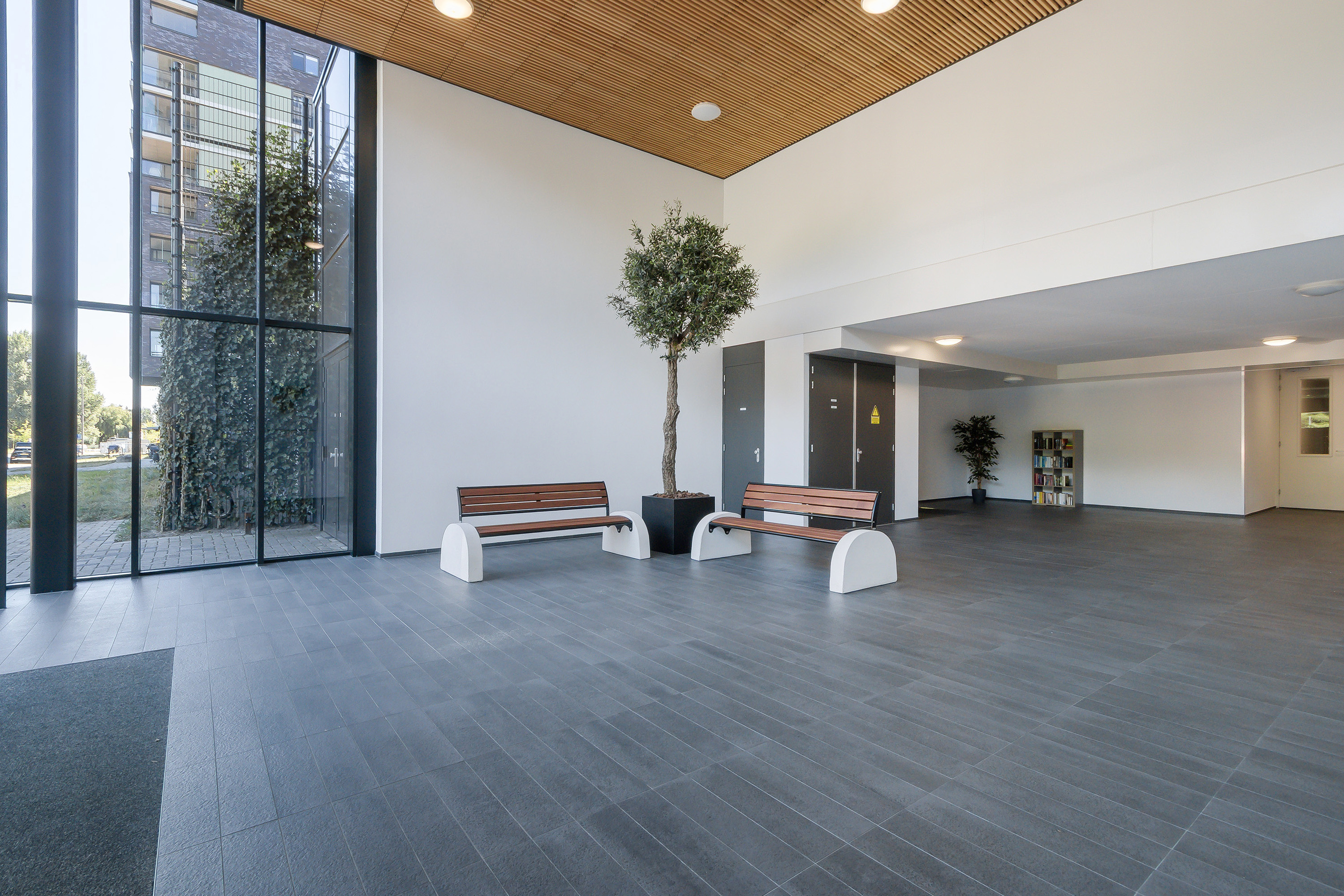 - Entree met bellentableau en brievenbussen, grote representatieve hal met 2 liftinstallaties en toegang tot de overdekte parkeerplaatsen, de containerruimte en de bergingen.