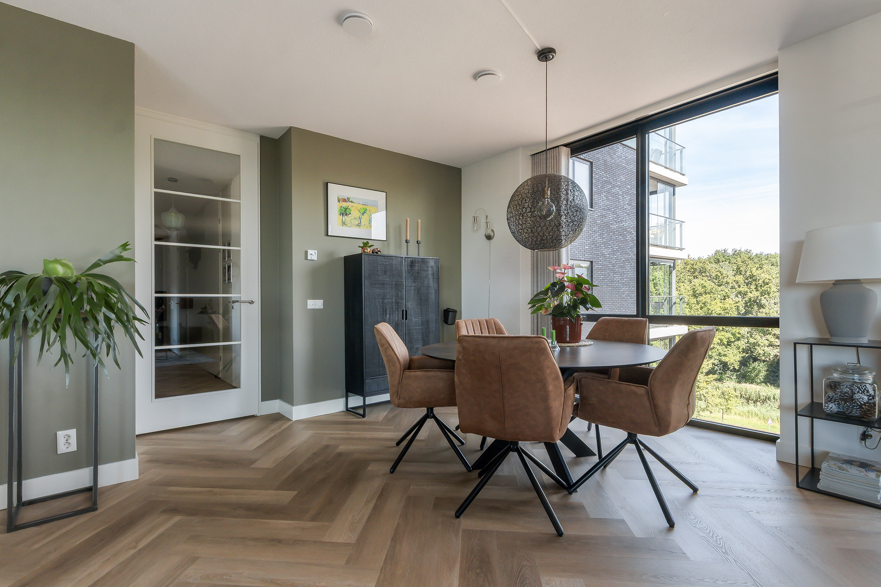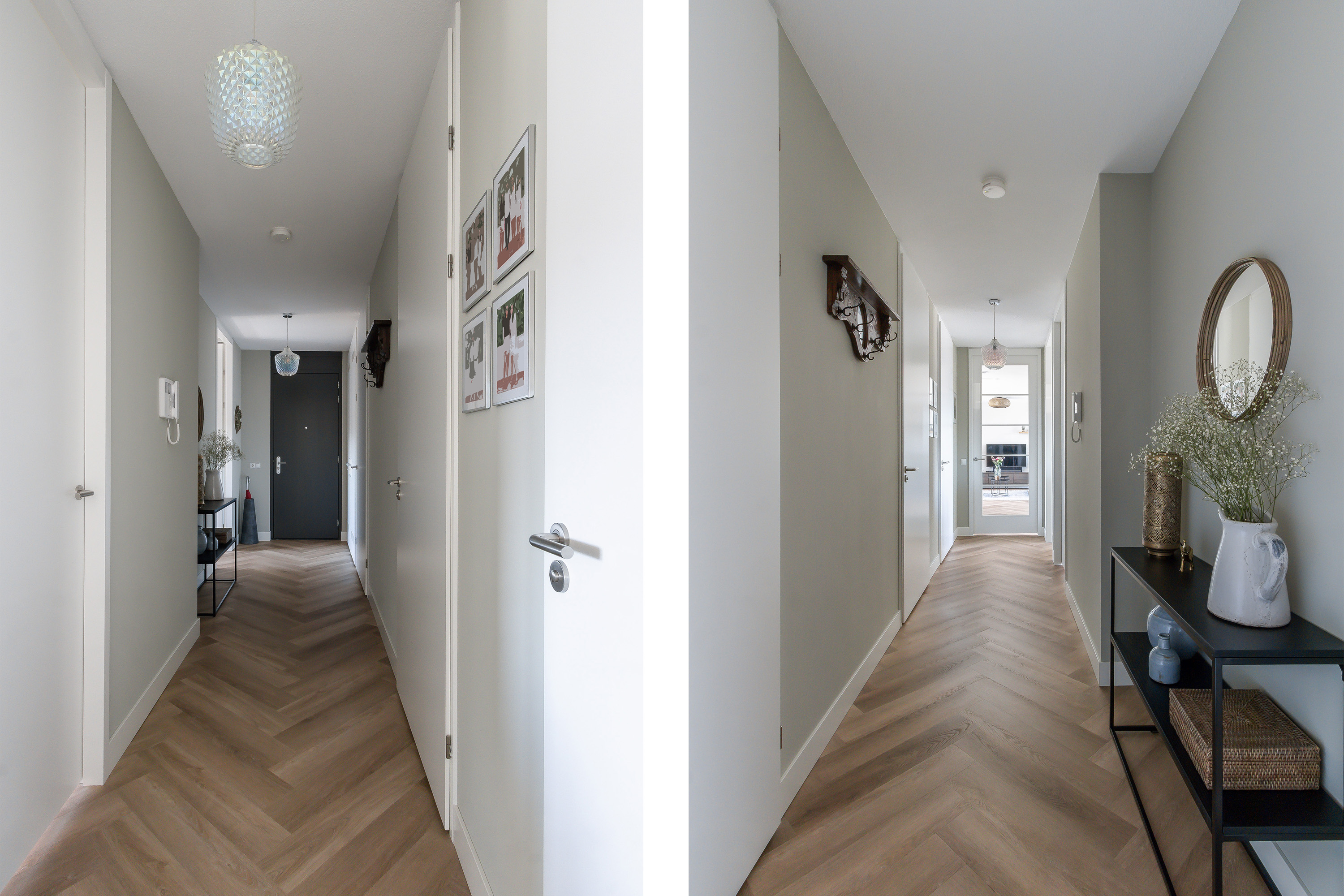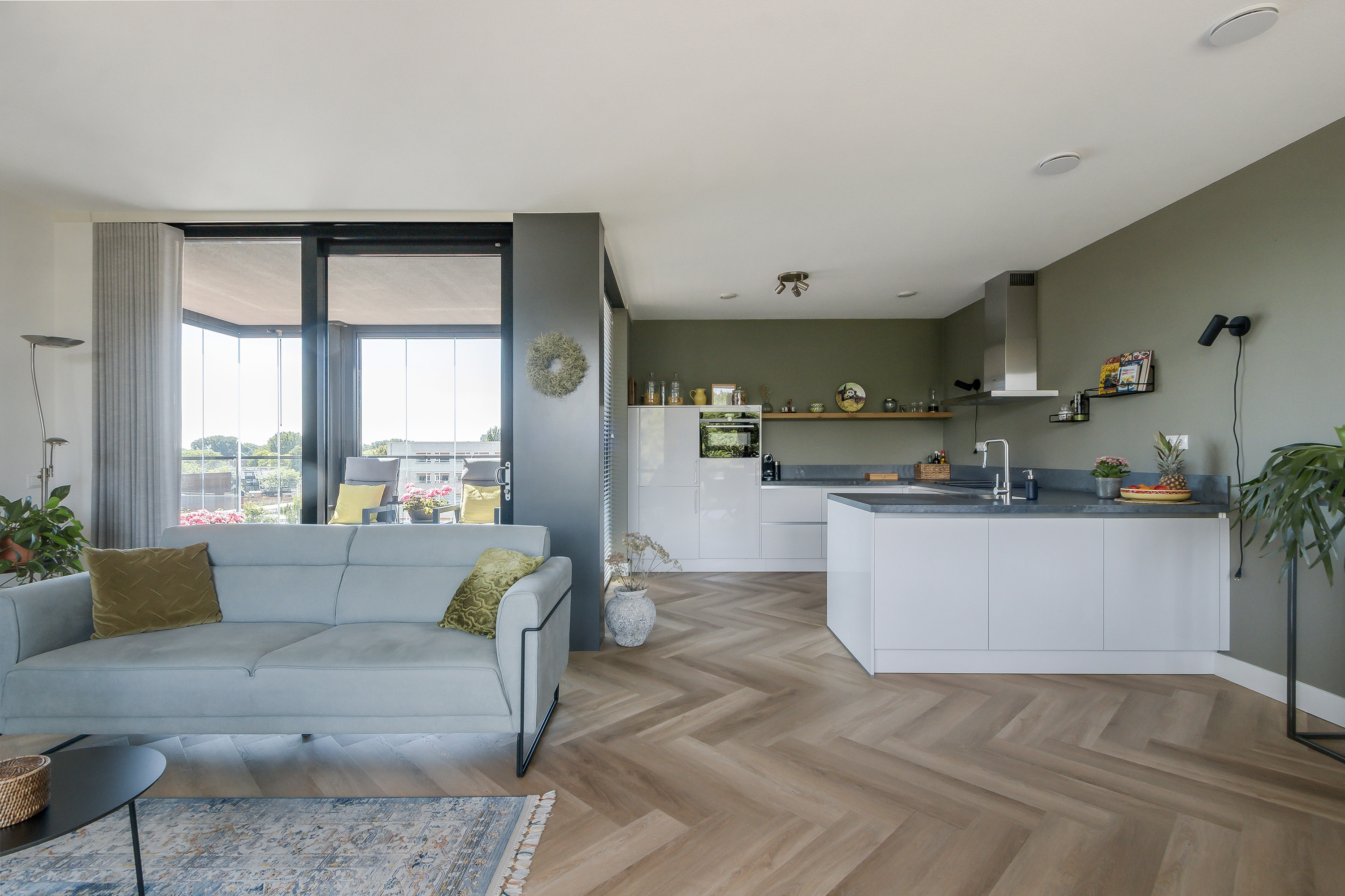 In de praktische technische ruimte is plek voor wasmachine, droger en extra bergruimte, wat bijdraagt aan het opgeruimde en verzorgde gevoel in huis. De visgraat PVC-vloer die door het gehele appartement is gelegd, zorgt voor een luxe en warme uitstraling, terwijl de plafondhoogte van ca. 2,62 meter het geheel extra ruimtelijk maakt.