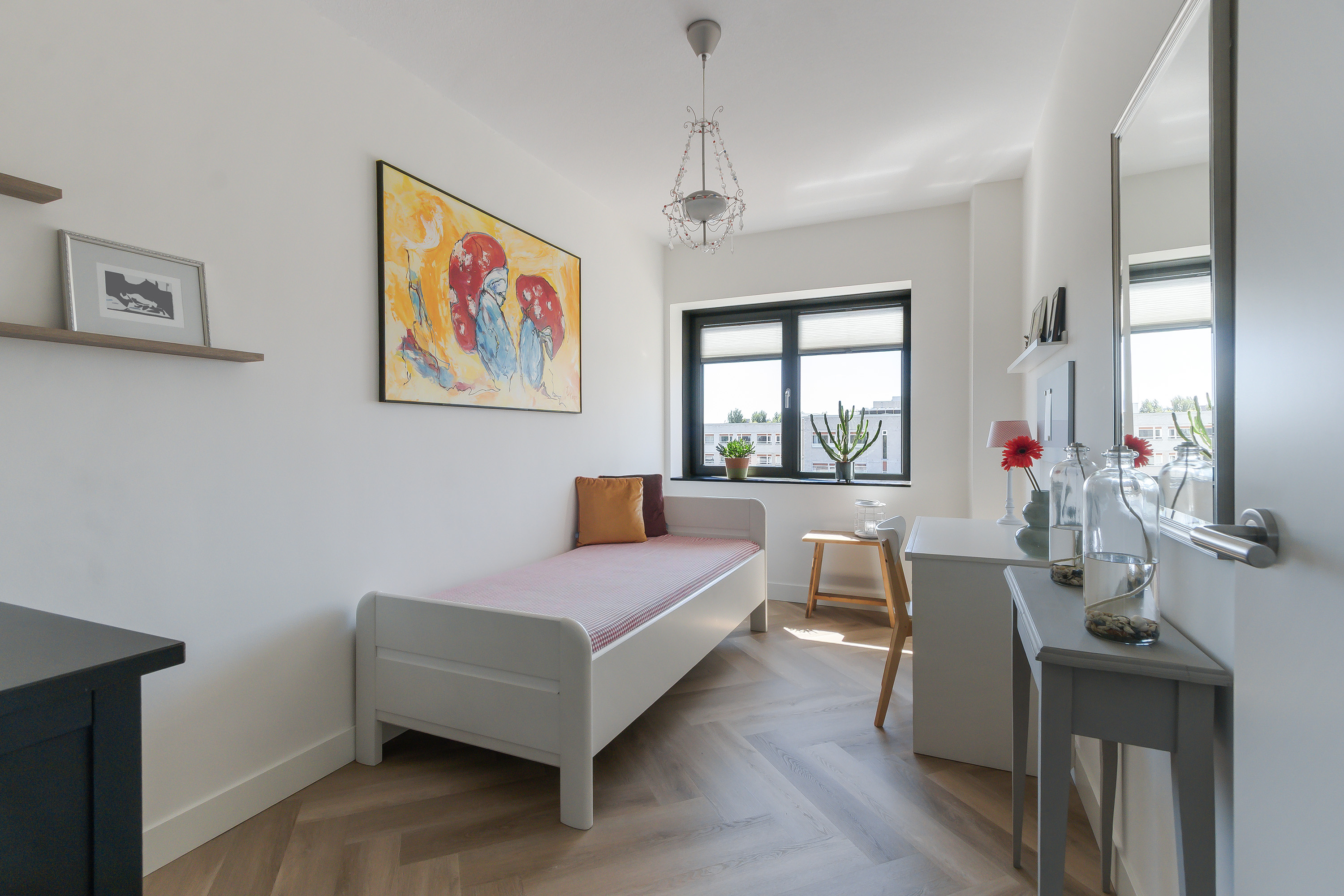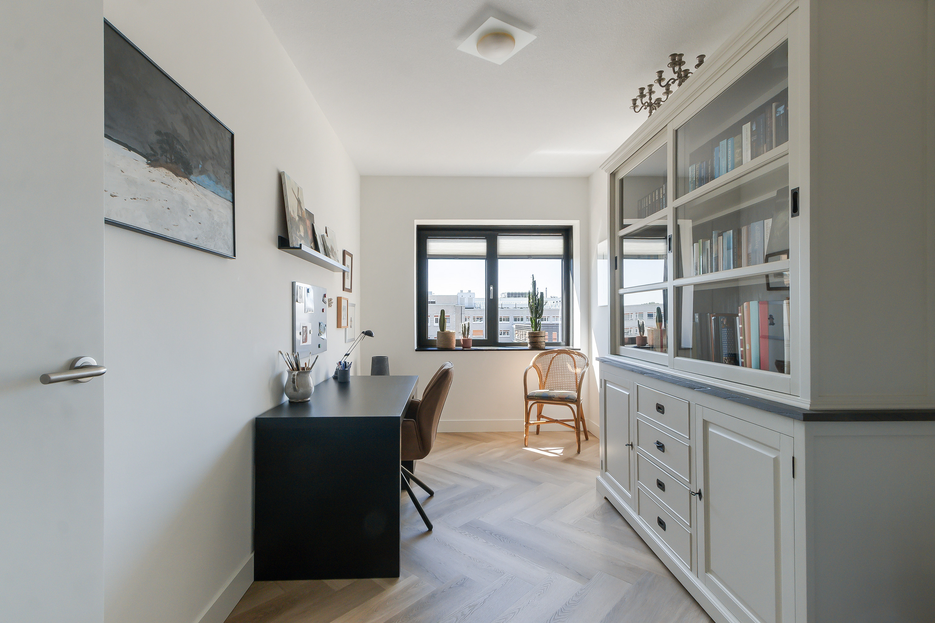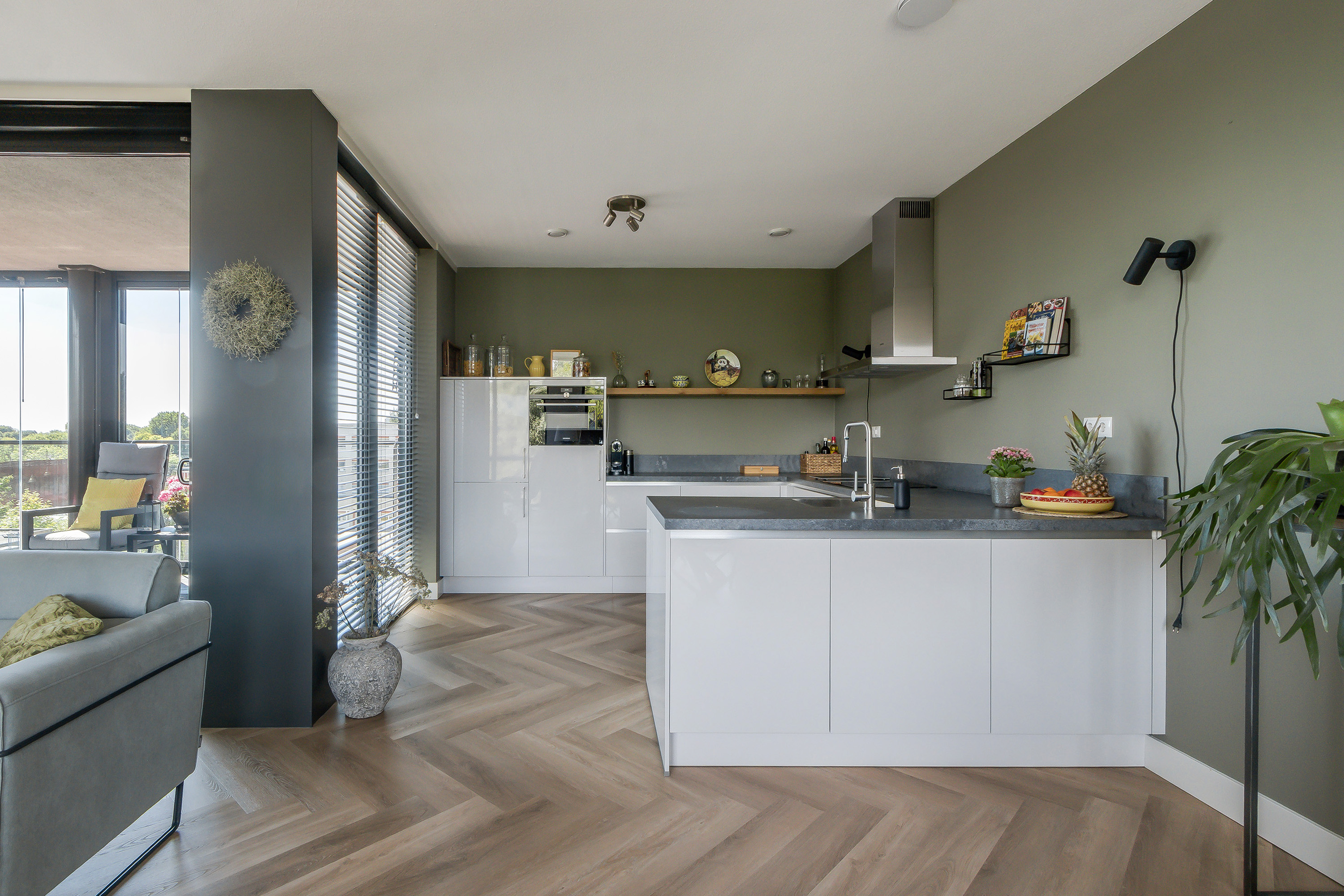 In de praktische technische ruimte is plek voor wasmachine, droger en extra bergruimte, wat bijdraagt aan het opgeruimde en verzorgde gevoel in huis. De visgraat PVC-vloer die door het gehele appartement is gelegd, zorgt voor een luxe en warme uitstraling, terwijl de plafondhoogte van ca. 2,62 meter het geheel extra ruimtelijk maakt.