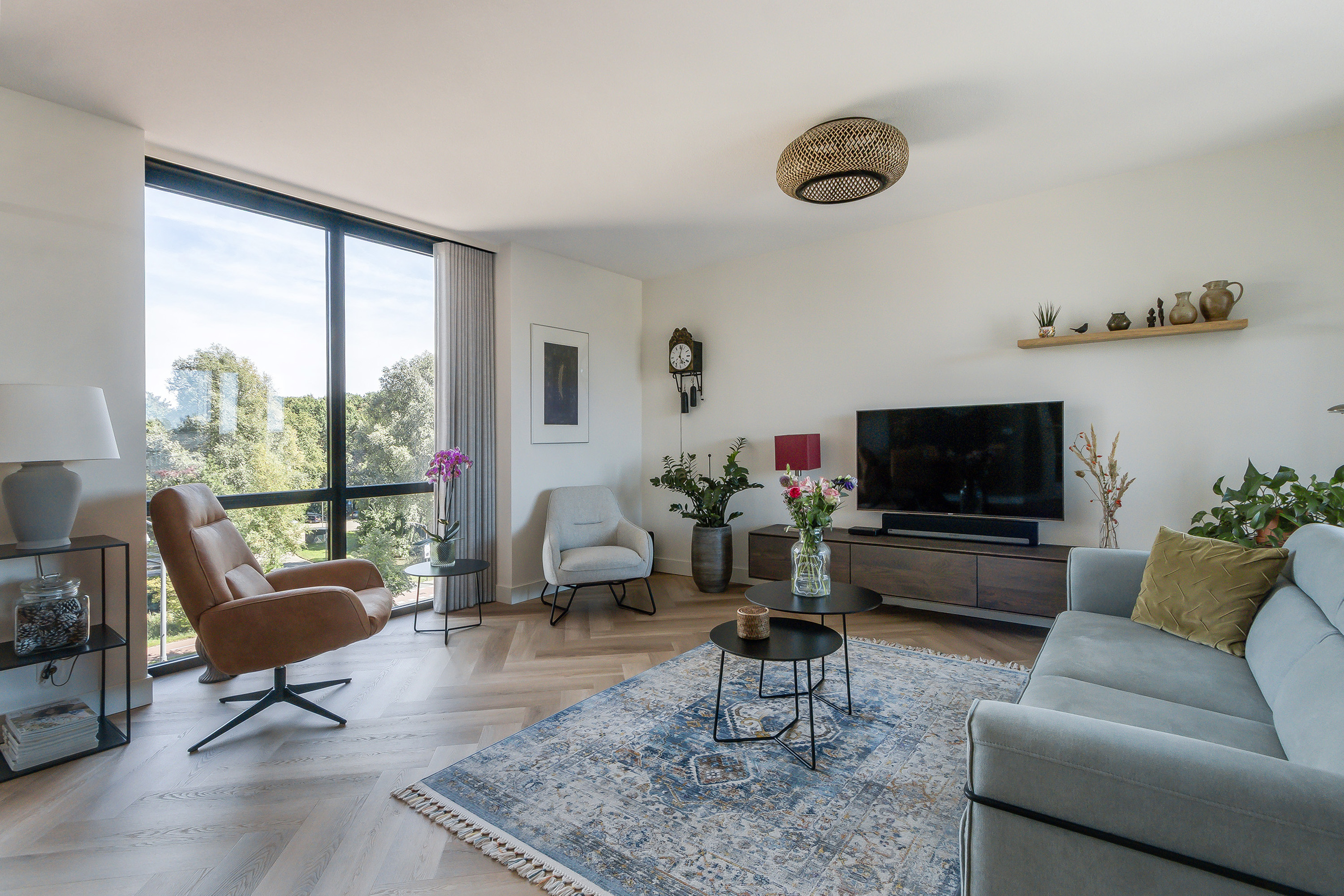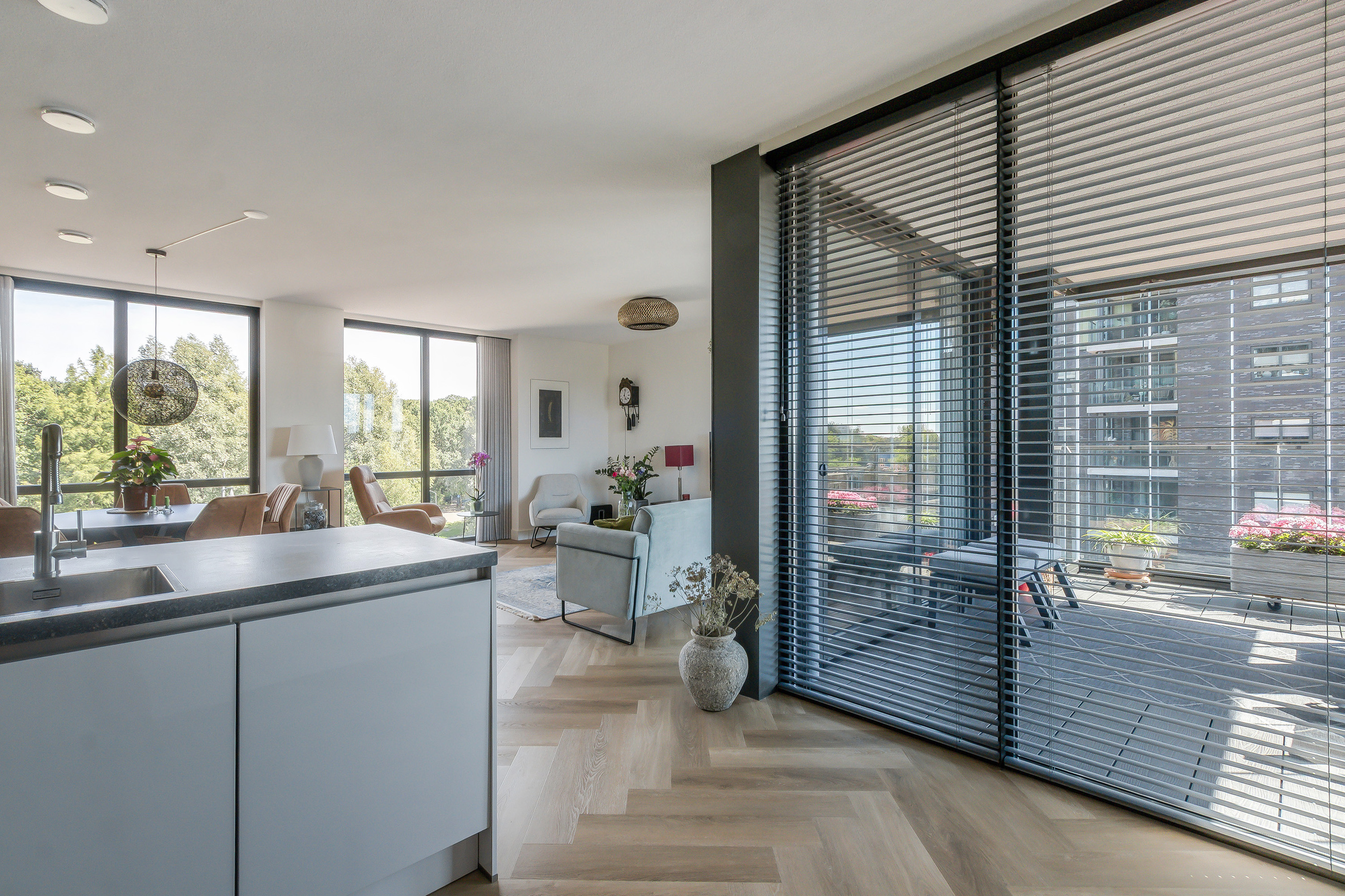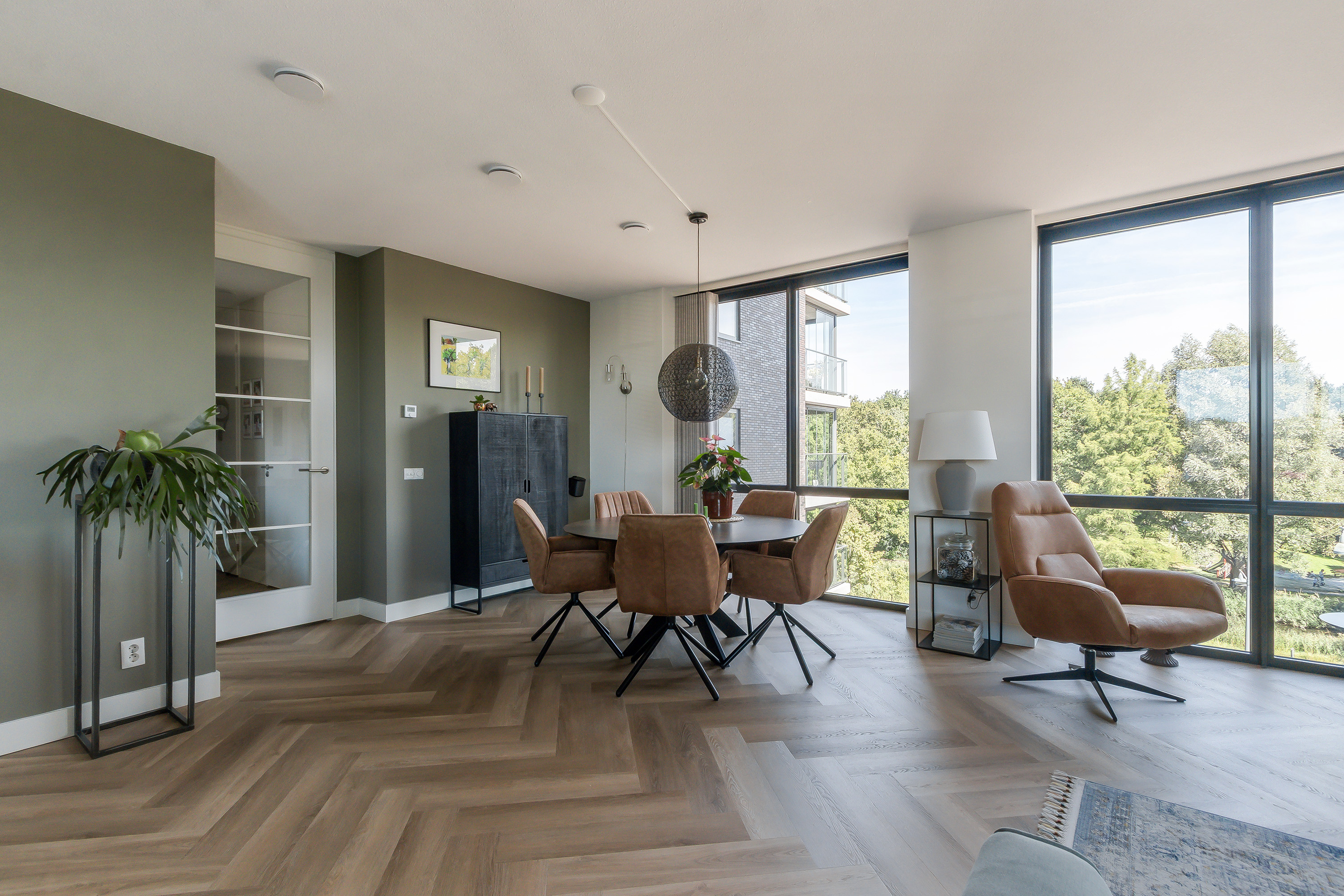 - Sfeervolle en strakke woonkamer met een mooie pvc-vloer en veel daglicht toetreding, met aan de voorzijde zicht op het Overkamppark en aan de achterzijde toegang tot de loggia;