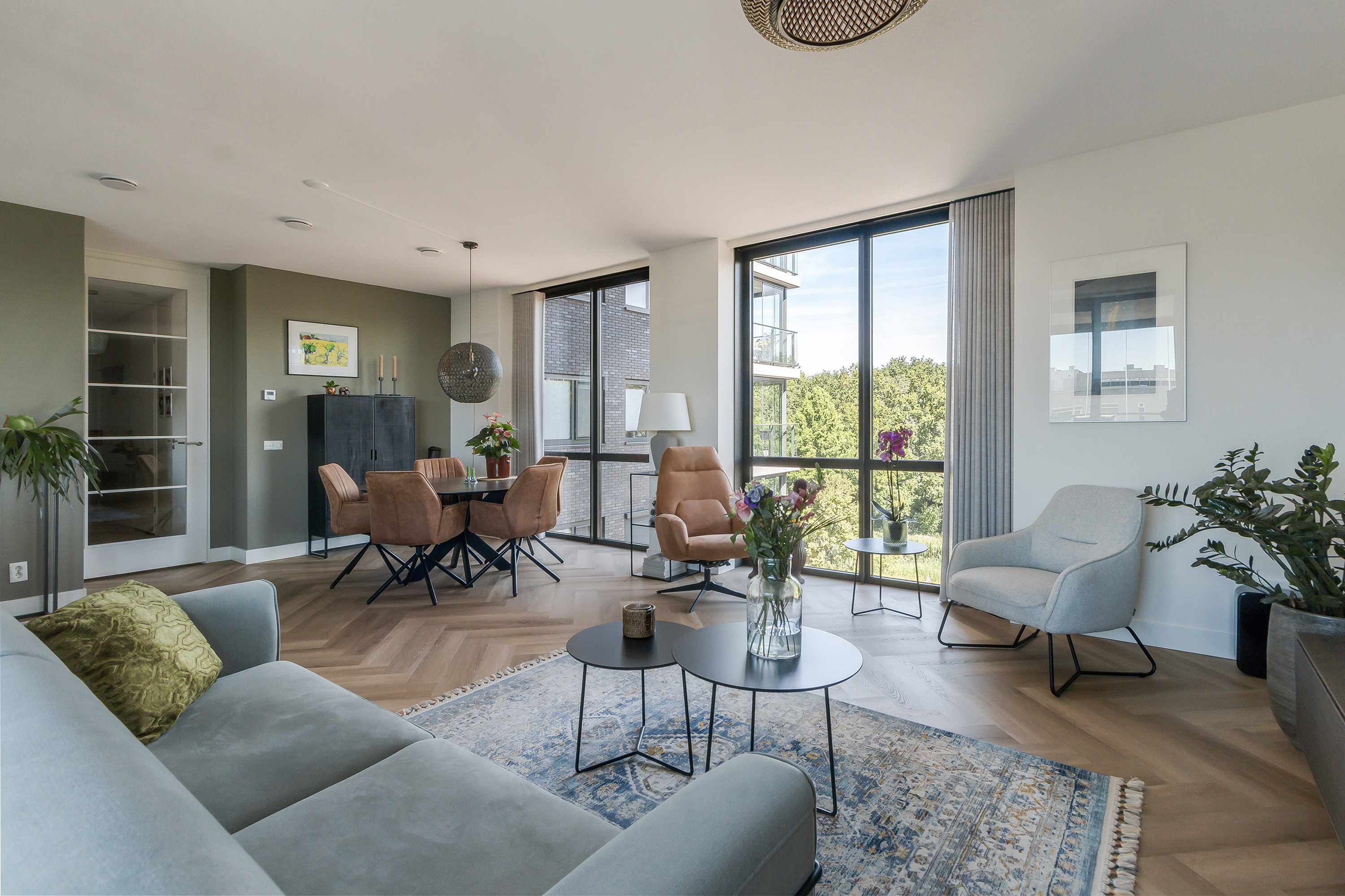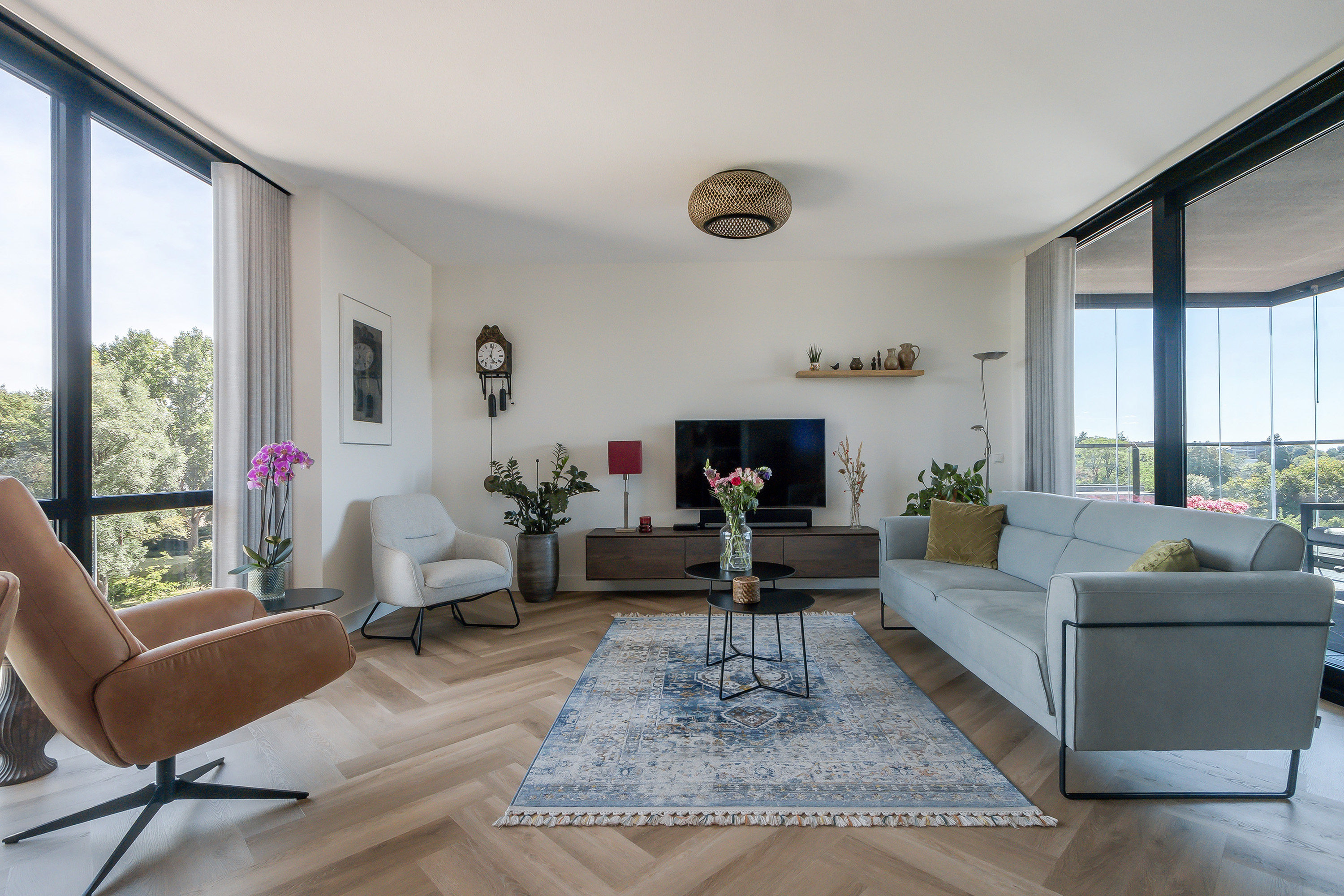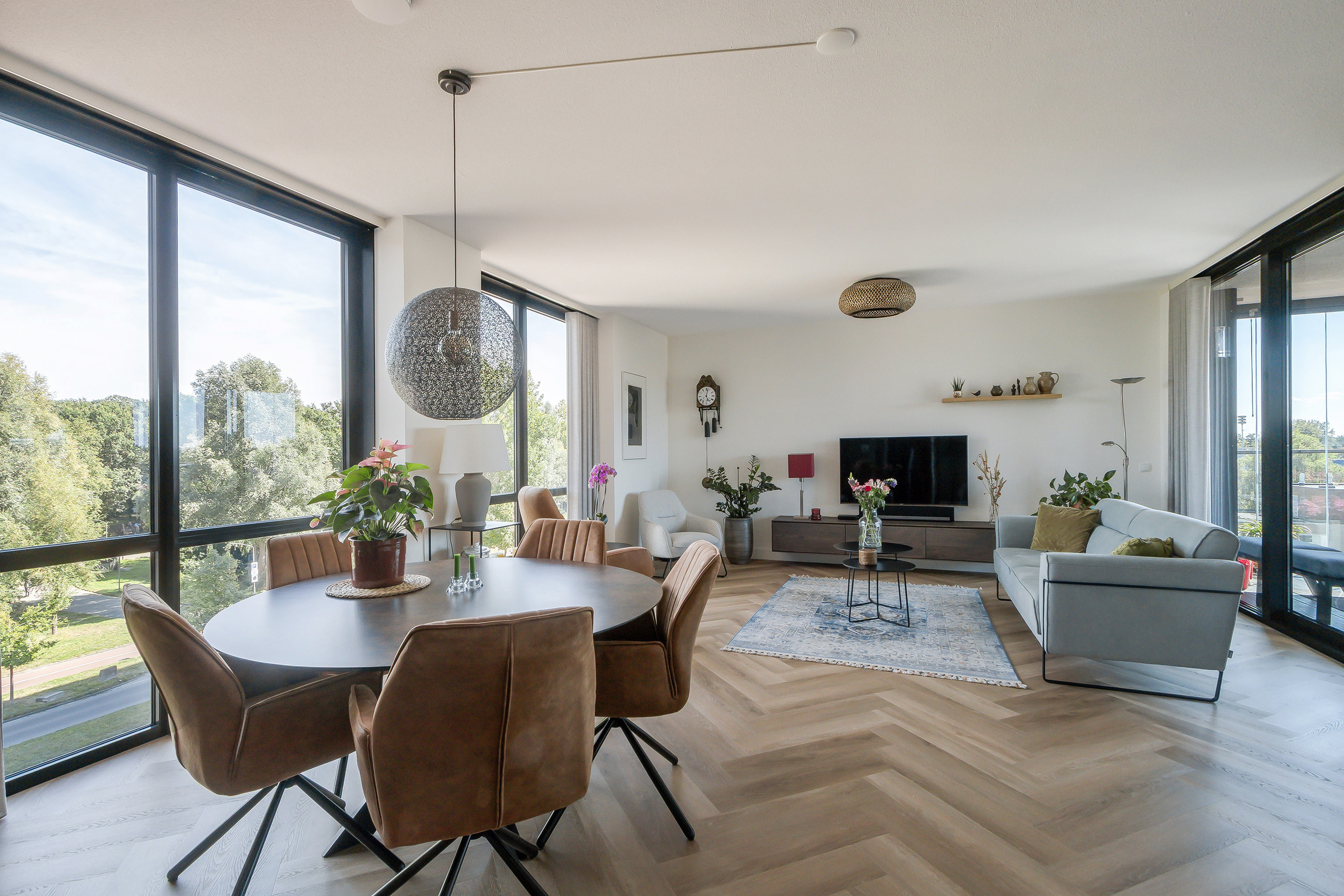 - Sfeervolle en strakke woonkamer met een mooie pvc-vloer en veel daglicht toetreding, met aan de voorzijde zicht op het Overkamppark en aan de achterzijde toegang tot de loggia;