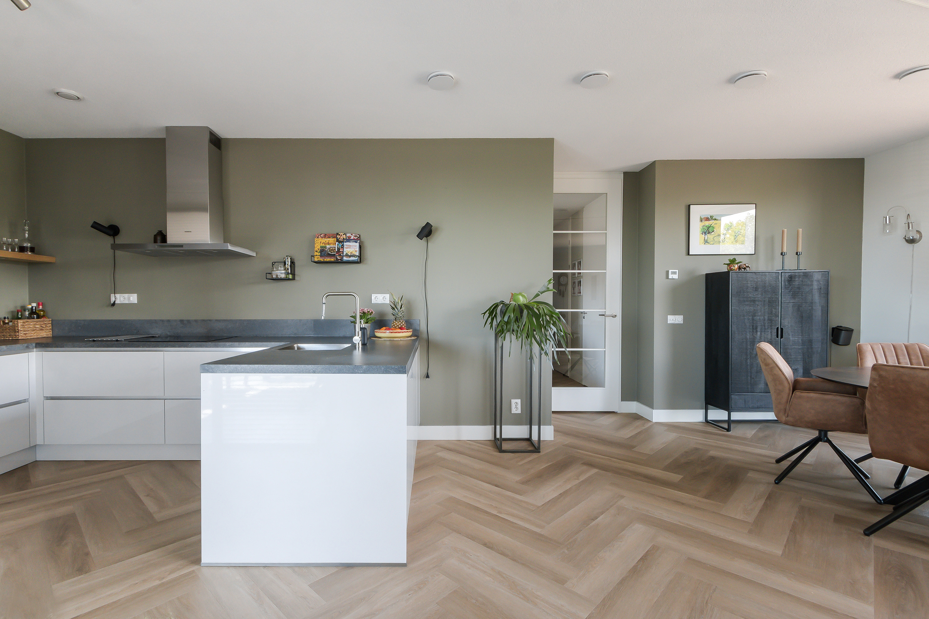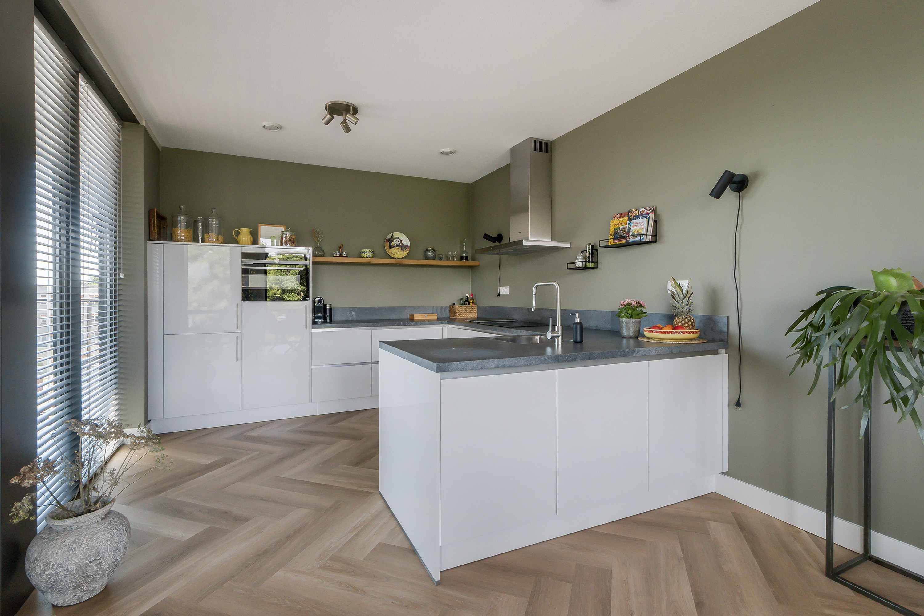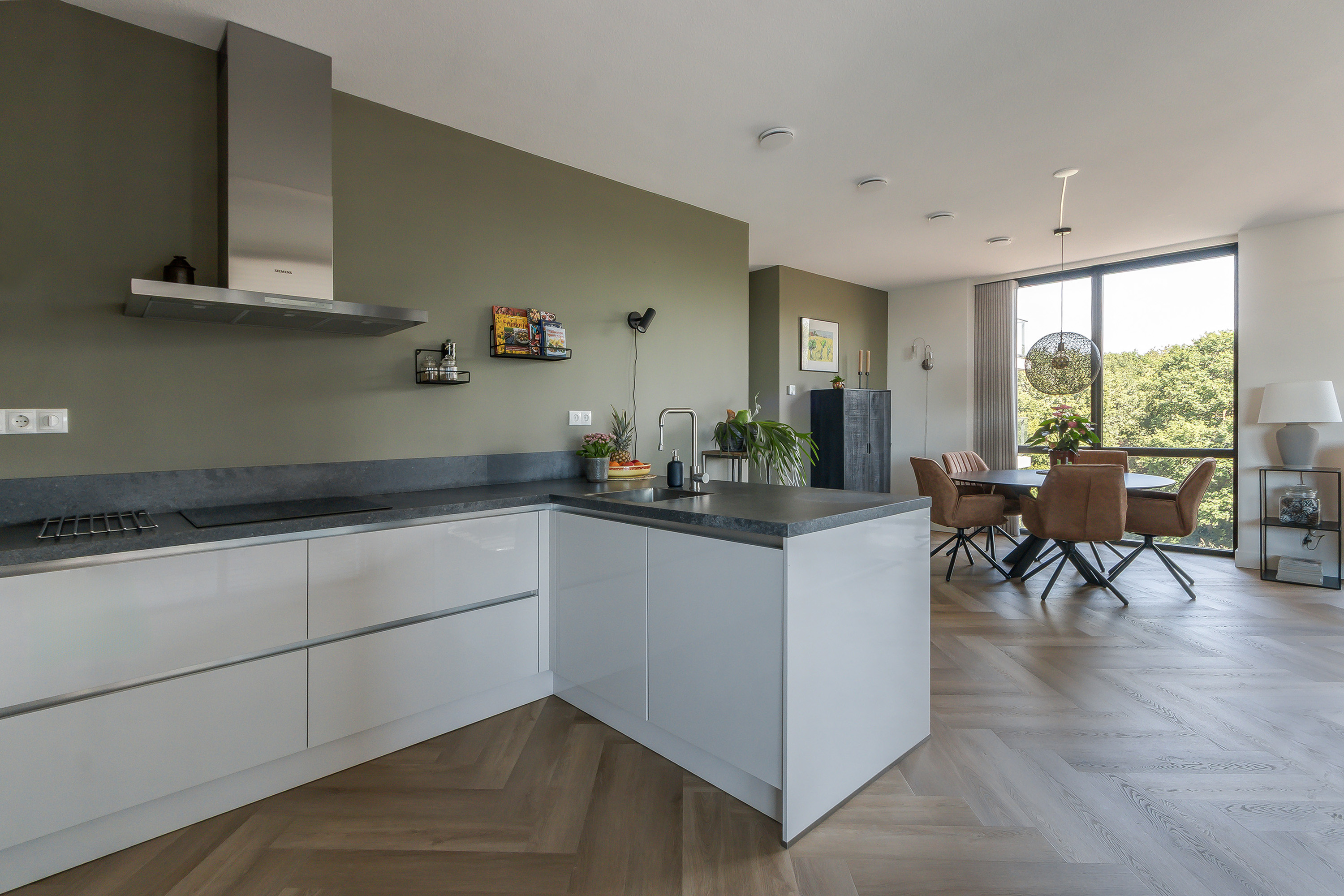- Open keuken, uitgevoerd in een zeer royale hoekopstelling met o.a. hoogglans witte fronten, een composiet aanrechtblad, een enkele rvs spoelbak, diverse onderkasten, laden, app.: een koelkast, vriezer, combimagnetron, een vaatwasser een 4-pits inductie kookplaat en een rvs afzuigkap;