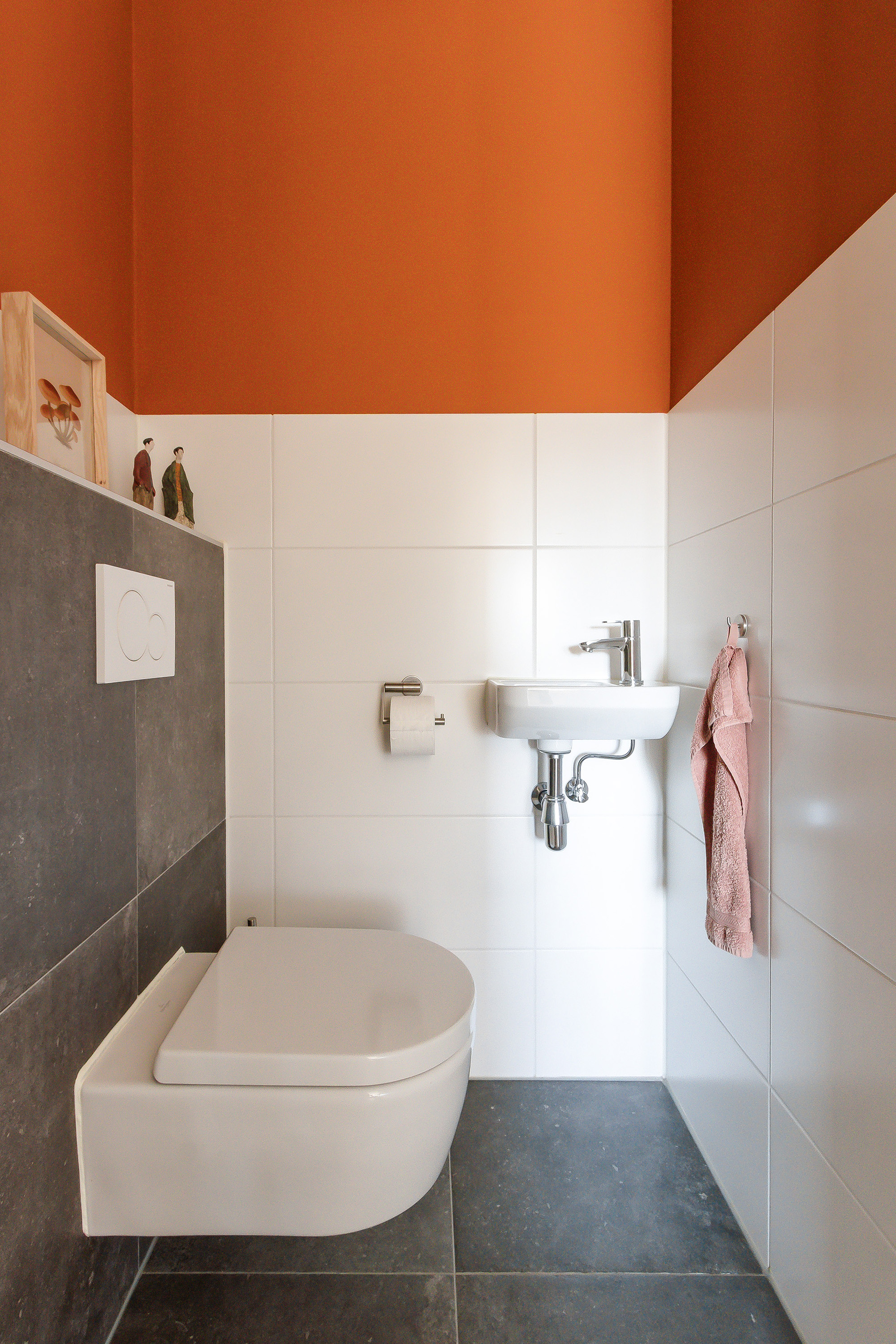 - Modern toilet met gedeeltelijk betegelde wanden, een plavuizen vloer, wit sanitair, een hangcloset en een fontein;