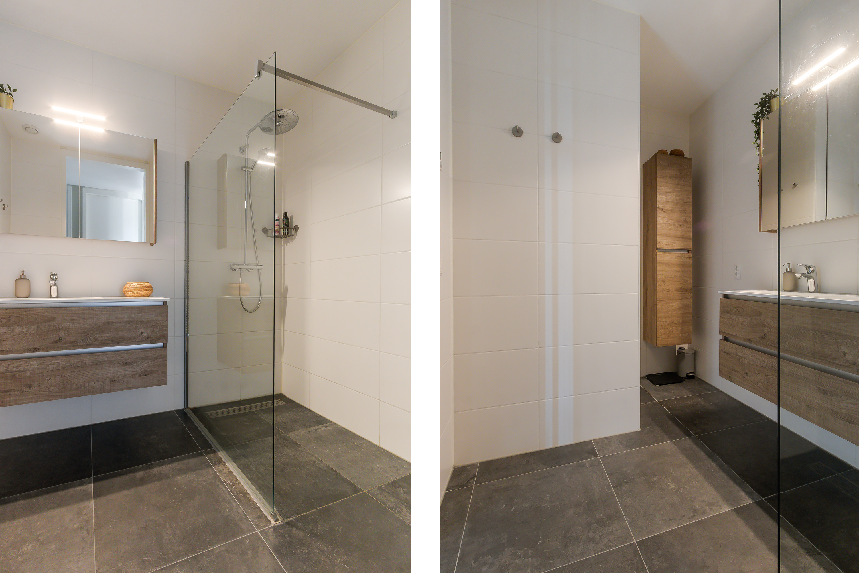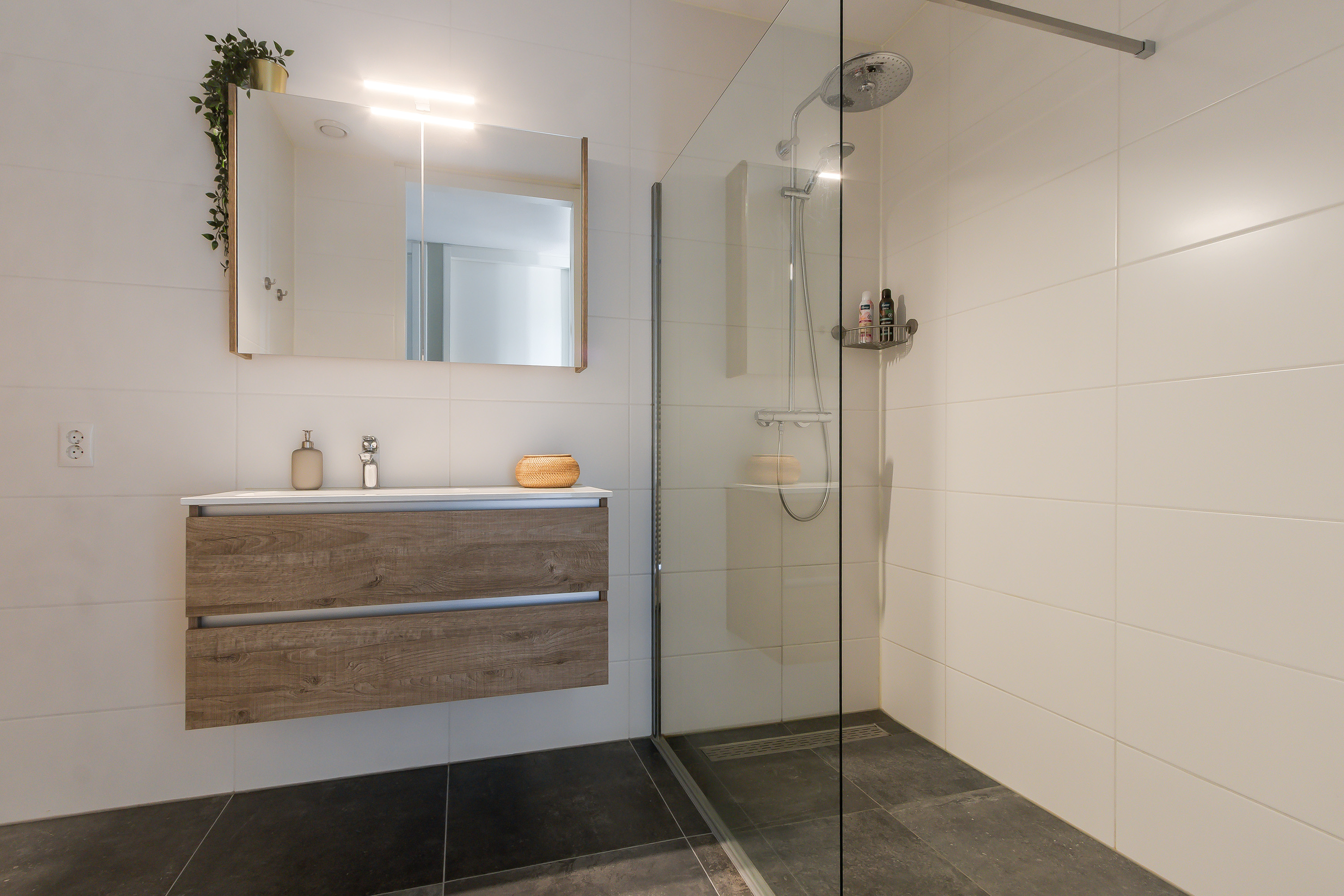 - Badkamer in het midden van de verdieping met geheel betegelde wanden, een plavuizen vloer, wit sanitair, een wastafelmeubel met spiegelkast, een inloopdouche met thermostaatkraan en een drain afvoer en een praktische opbergkast.