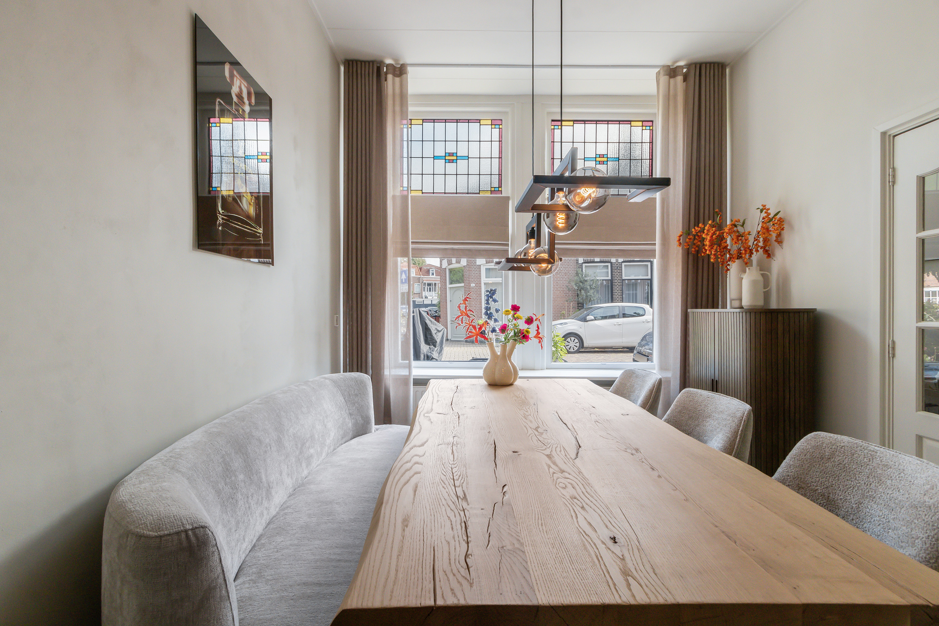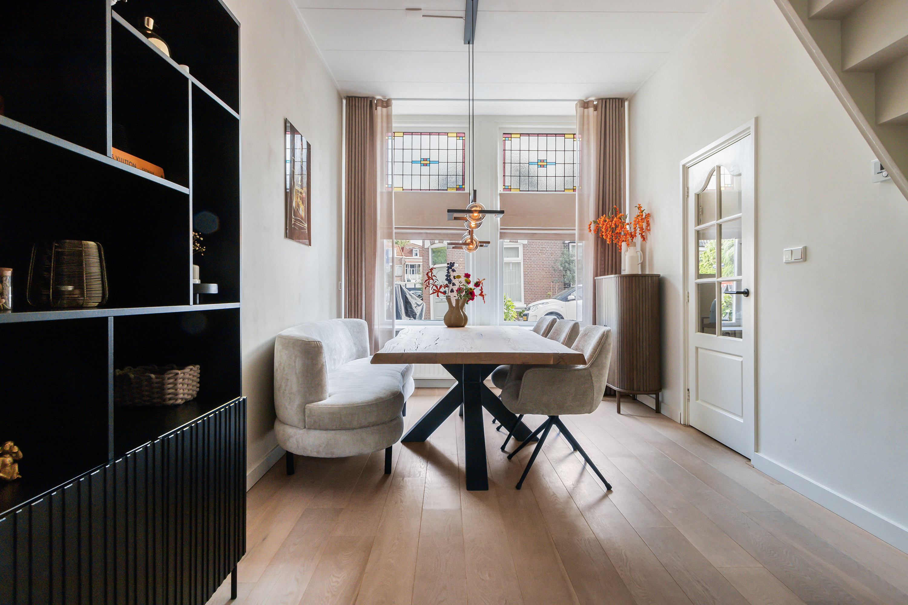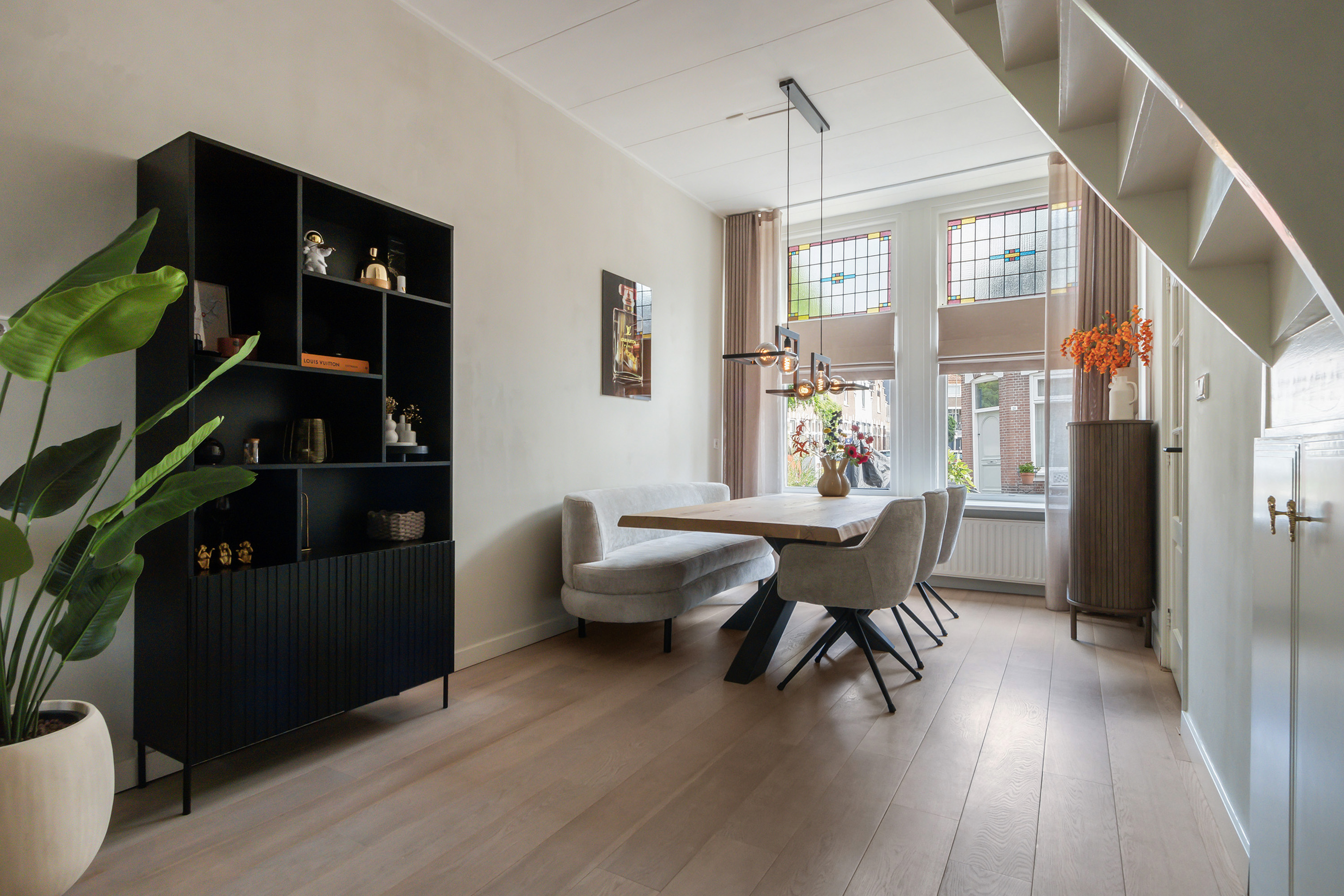 De begane grond verrast met een royale en lichte woonkamer, waar de hoge plafonds van circa 3 meter en de authentieke glas-in-loodramen aan de voorzijde direct in het oog springen. Deze ruimte ademt sfeer en voelt extra ruim aan. Vanuit de woonkamer is er toegang tot de netjes afgewerkte keuken, de toiletruimte en de gezellige binnentuin.