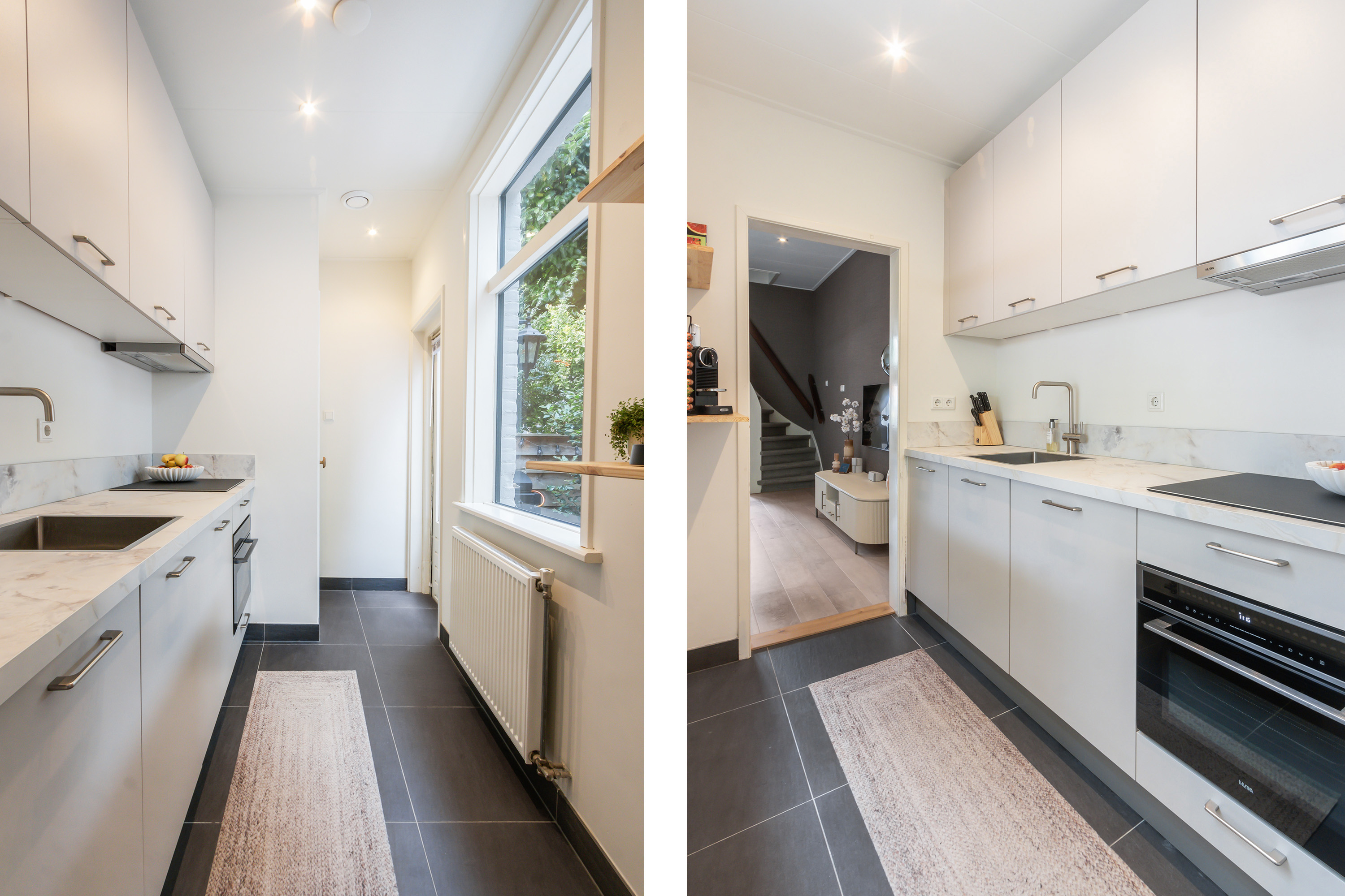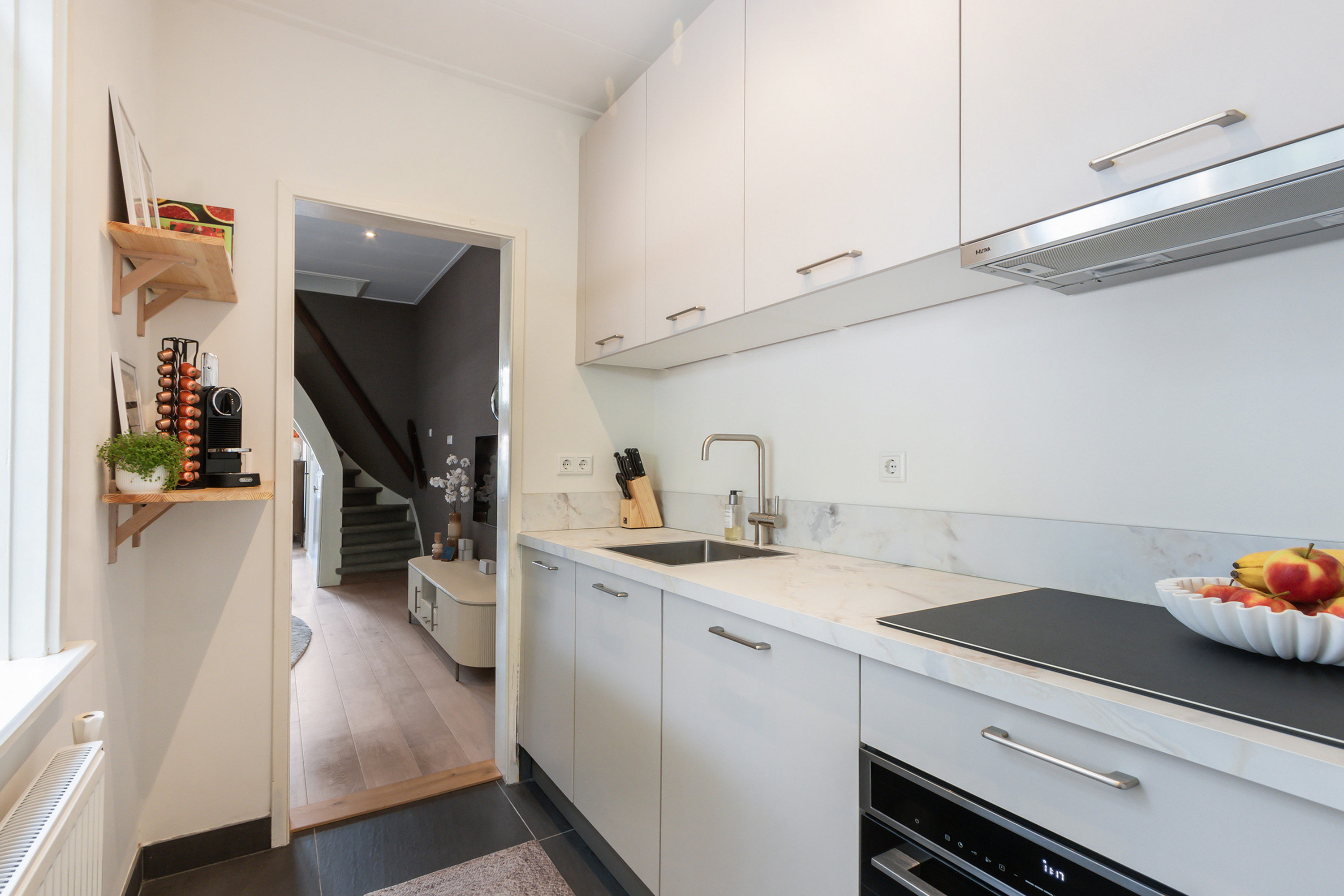 - Halfopen moderne keuken in rechte opstelling, voorzien van diverse onder- en bovenkasten. Marmerlook aanrechtblad met RVS spoelbak en uitgerust met 4-zones inductiekookplaat, vlakscherm afzuigkap, combimagnetron, vaatwasser en koelkast met vriesvak. Vanuit de keuken is er een achterdeur naar de tuin;
