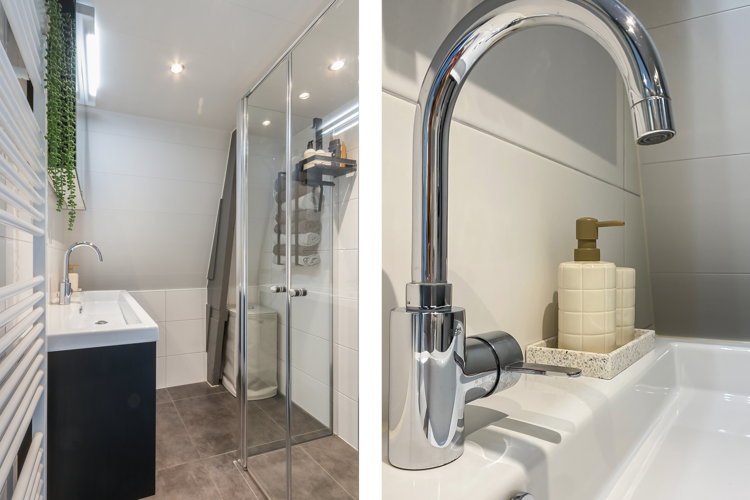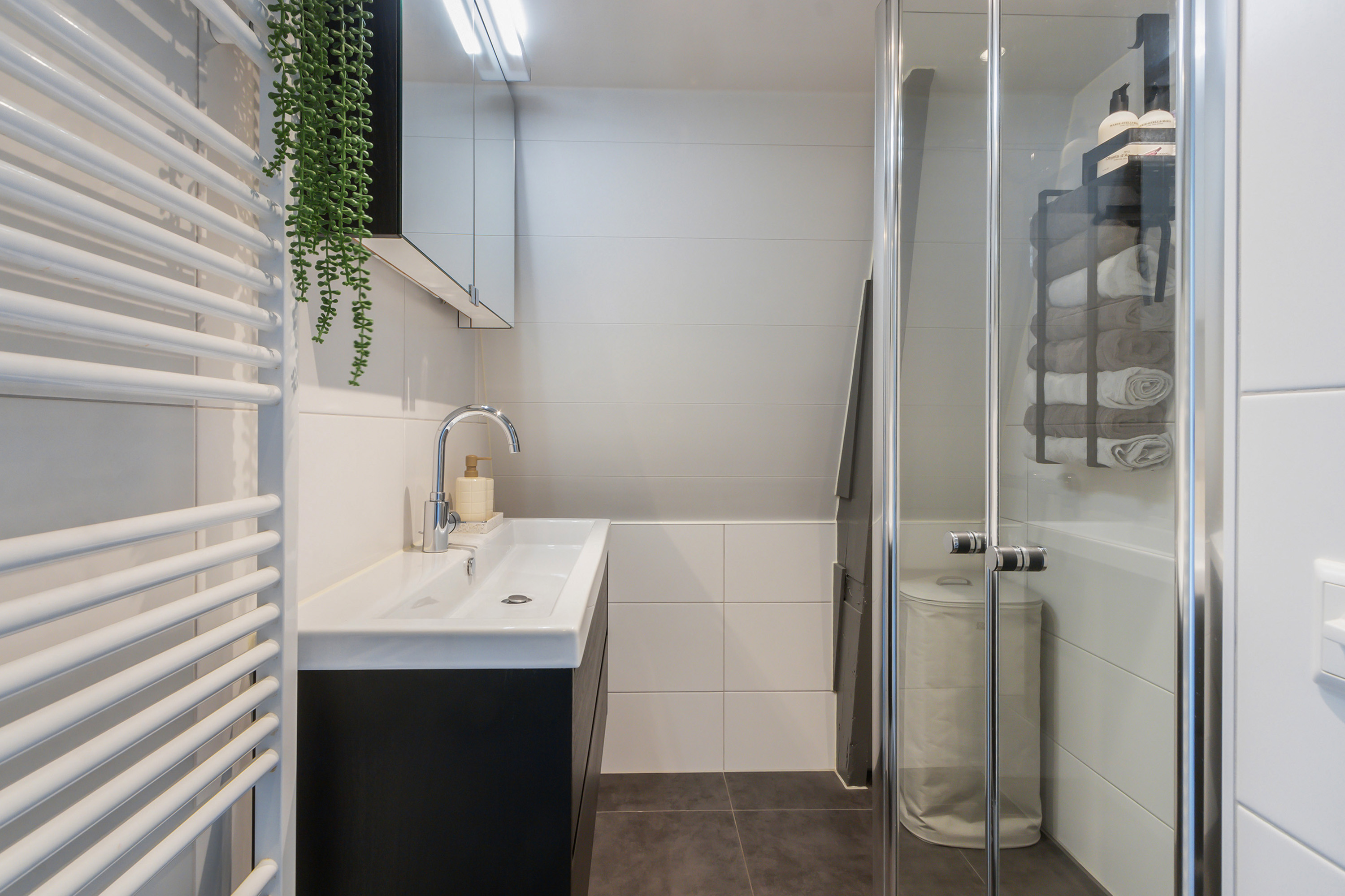 - Inpandige moderne badkamer met grotendeels betegelde wanden en een plavuizen vloer, voorzien van een doucheruimte met glazen deuren en -wand, wastafelmeubel, spiegelkast met verlichting, designradiator, spotverlichting in het plafond en mechanische ventilatie.