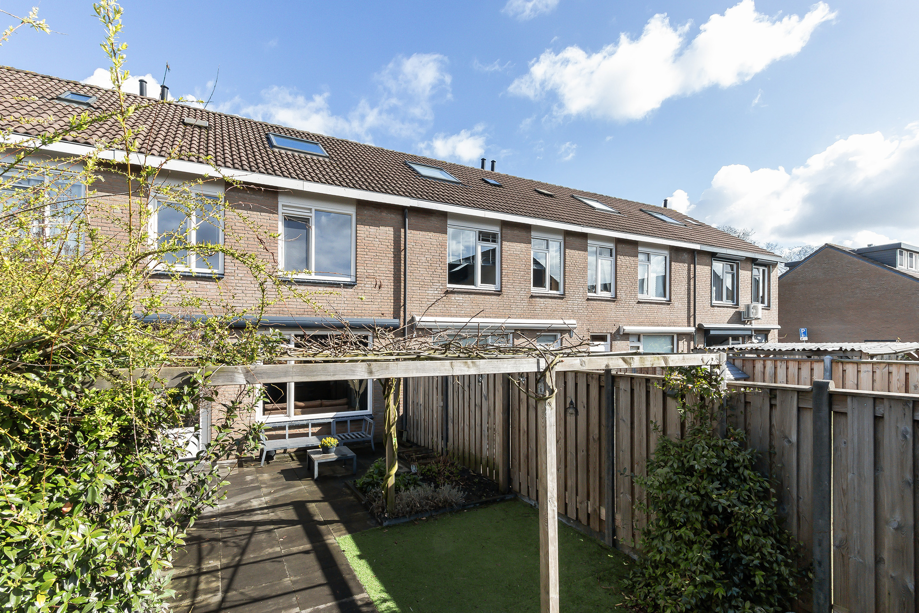 - Achtertuin: ca. 11.60 m x 5.60 m, gelegen op het zuiden en in 2020 volledig opnieuw aangelegd. Voorzien van bestrating, schuttingen (2019) en een zonnescherm (2019);