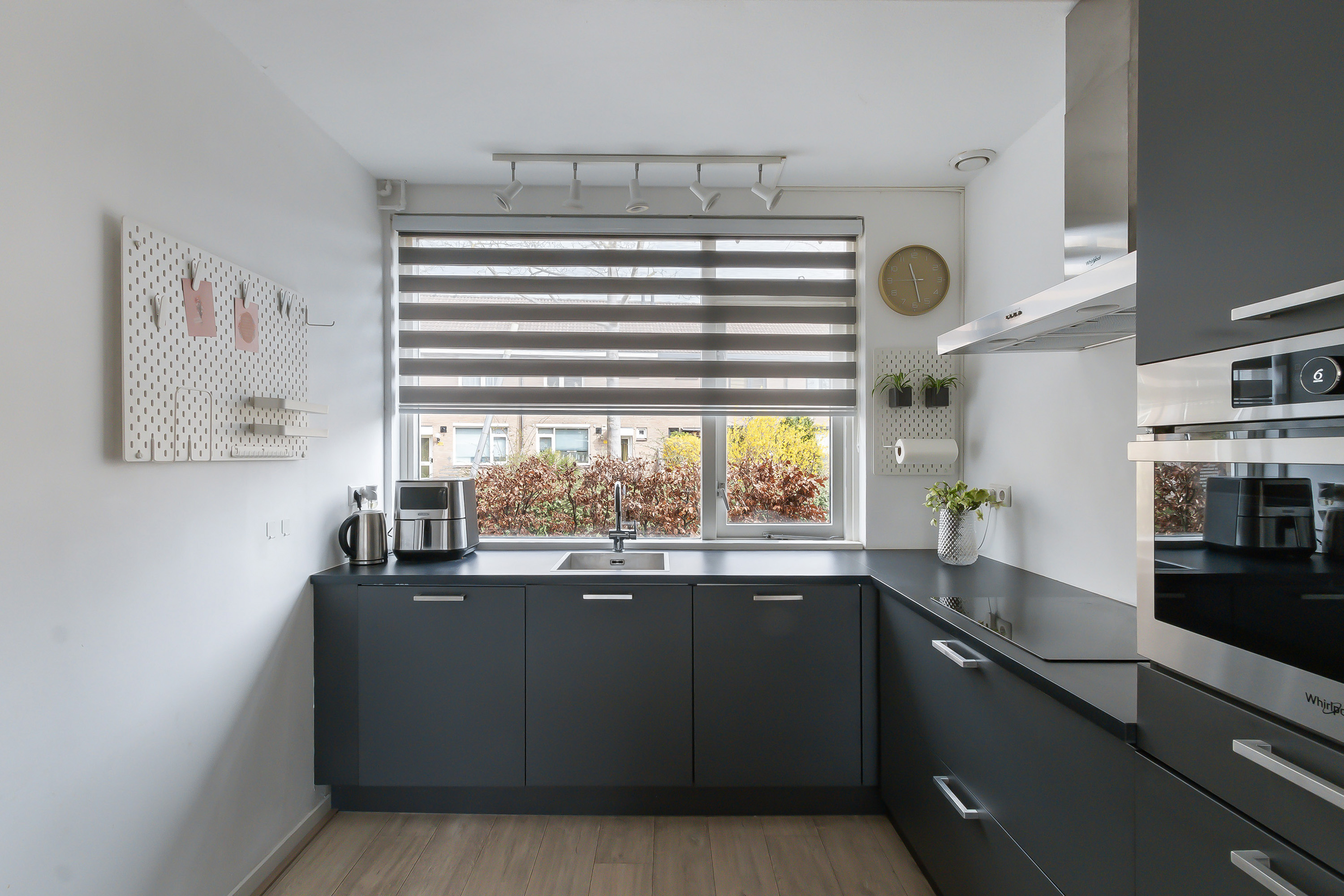 - Open keuken, vernieuwd in 2019 en uitgevoerd in hoekopstelling met een rvs spoelbak, diverse onder- en bovenkasten en laden. Apparatuur: Whirlpool 4-pits inductiekookplaat, afzuigkap, combimagnetron, vaatwasser en een koel-vriescombinatie.