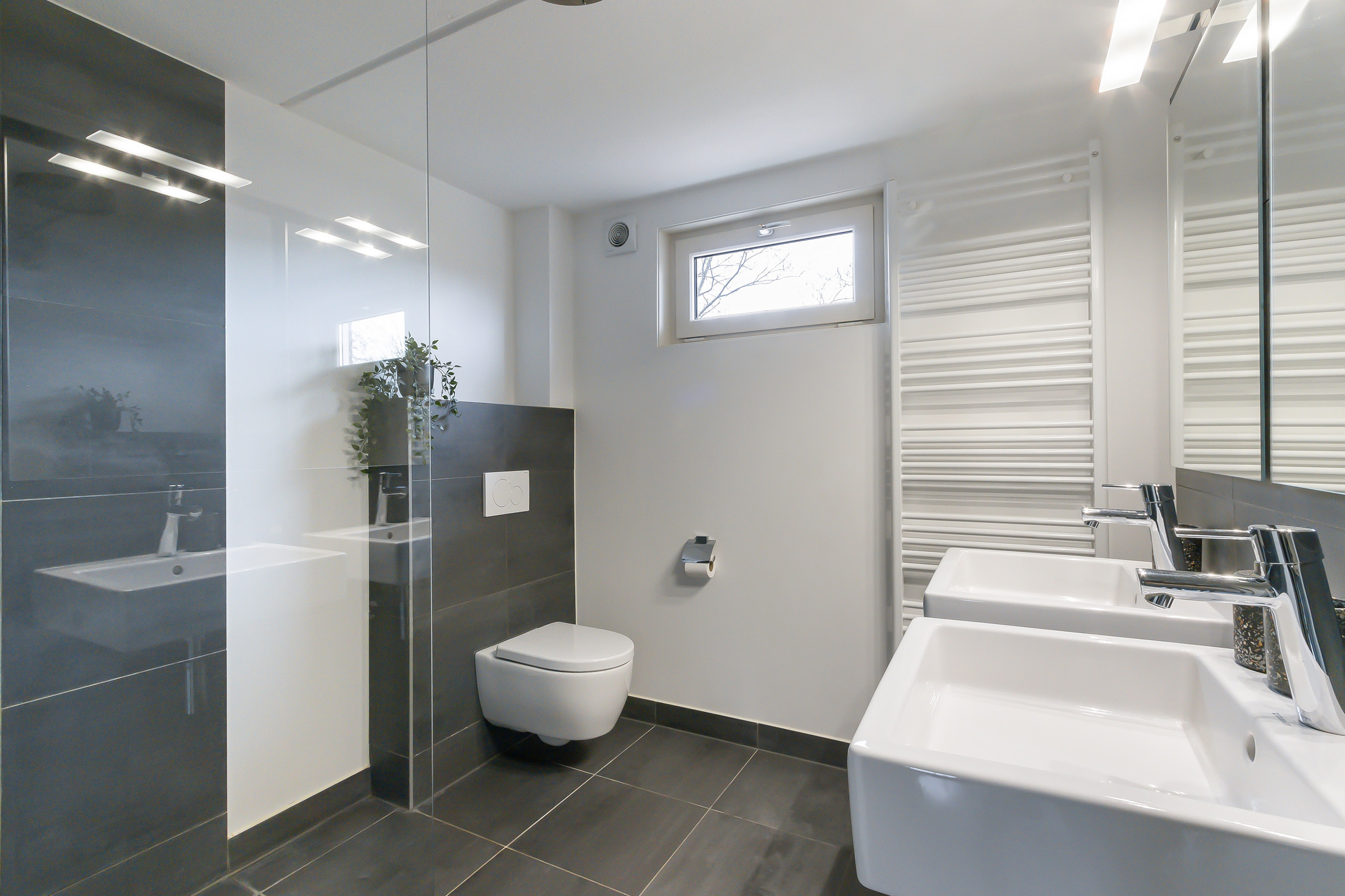 - Badkamer, vernieuwd in 2019, volledig betegeld en voorzien van een inloopdouche, dubbele wastafel, wandcloset, designradiator, mechanische ventilatie en een kunststof raam met HR++ glas.