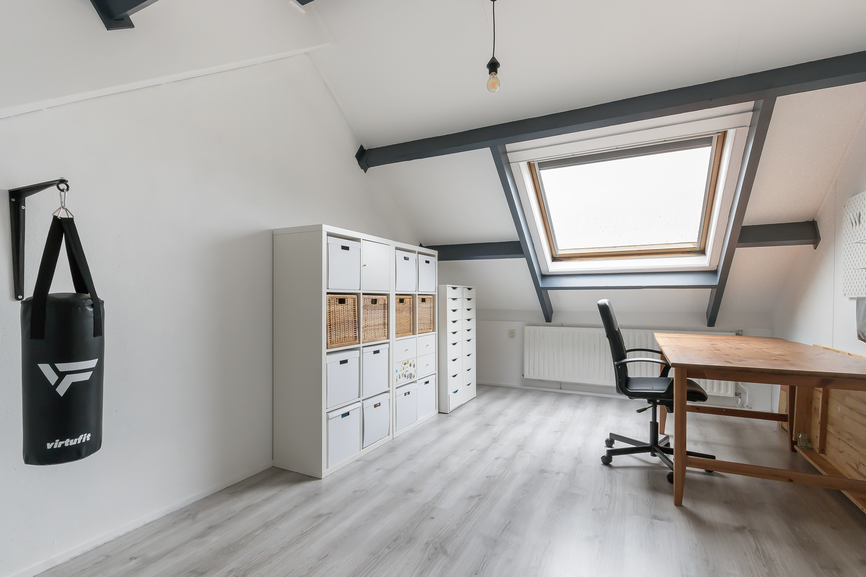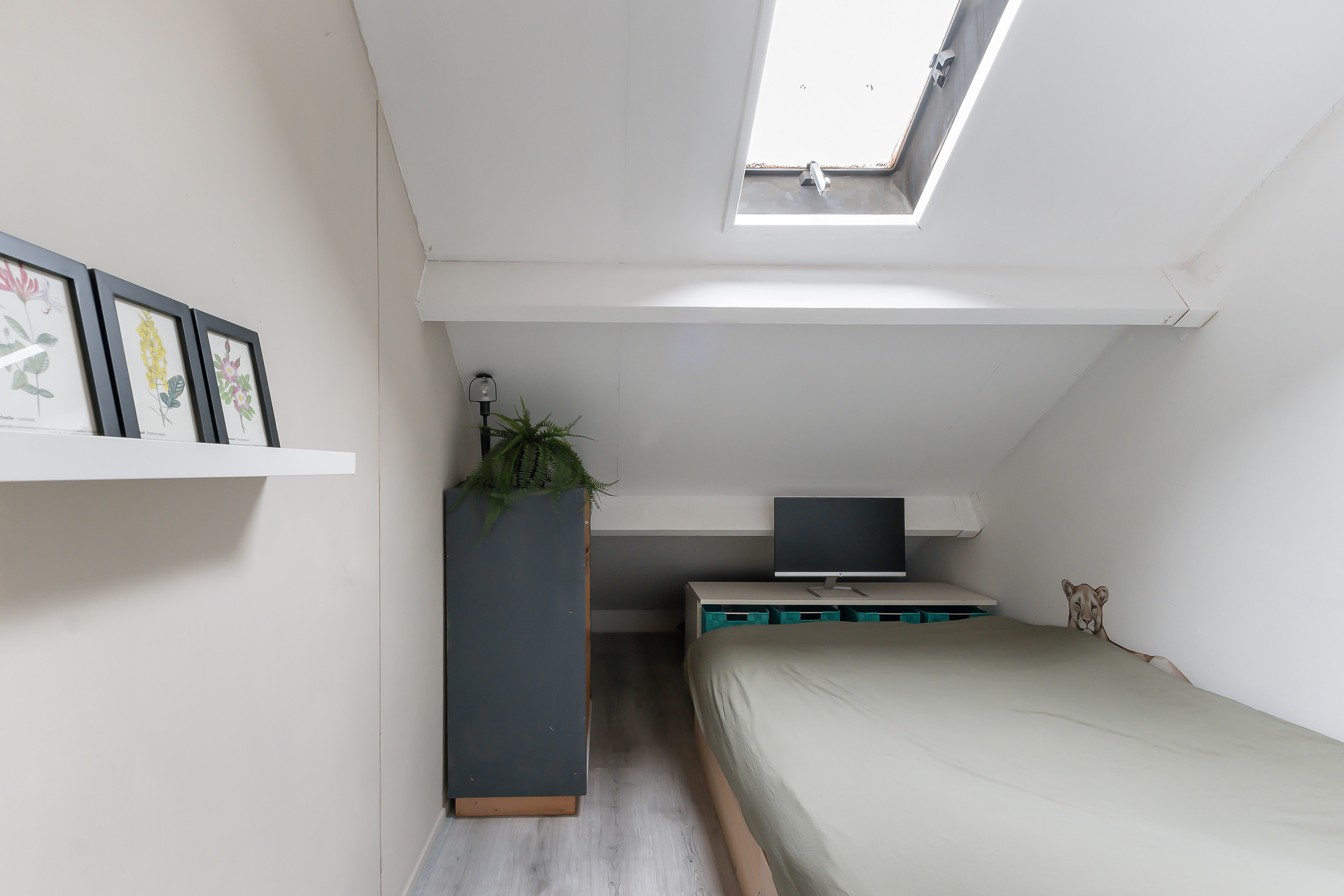 - Slaapkamer 4, voorzien van een groot Velux dakraam (dubbelglas), wastafel en knieschotten.
