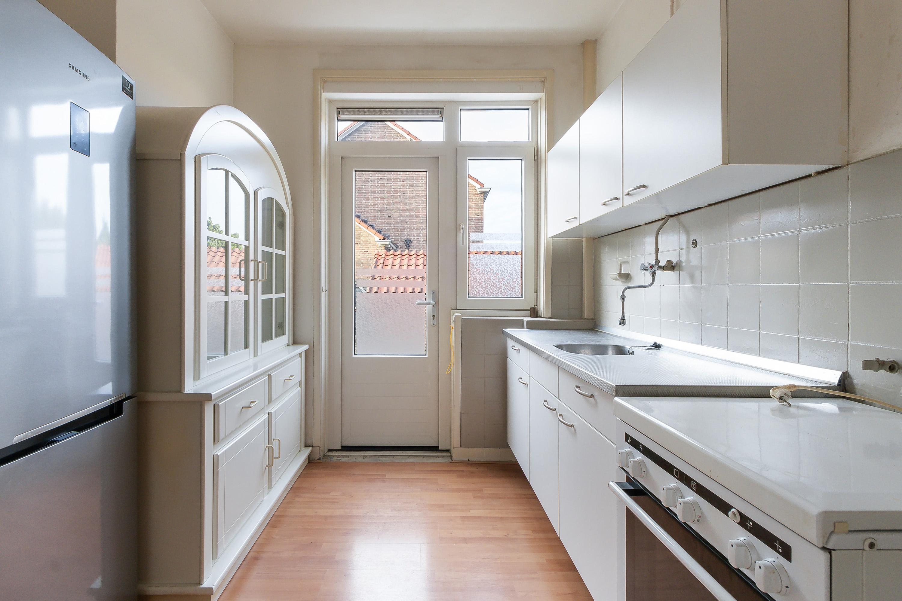 - Keuken in rechte opstelling met rvs keukenblad, enkele spoelbak, betegelde achterwand, diverse onder- en bovenkasten, gasaansluiting, oven en 4-pits gasfornuis, losse koel- vriescombinatie. Een wateraansluiting en extra afvoer zijn aanwezig, bijvoorbeeld voor het aansluiten van een vaatwasser. Vanuit de keuken is de tuin te bereiken via de achterdeur.