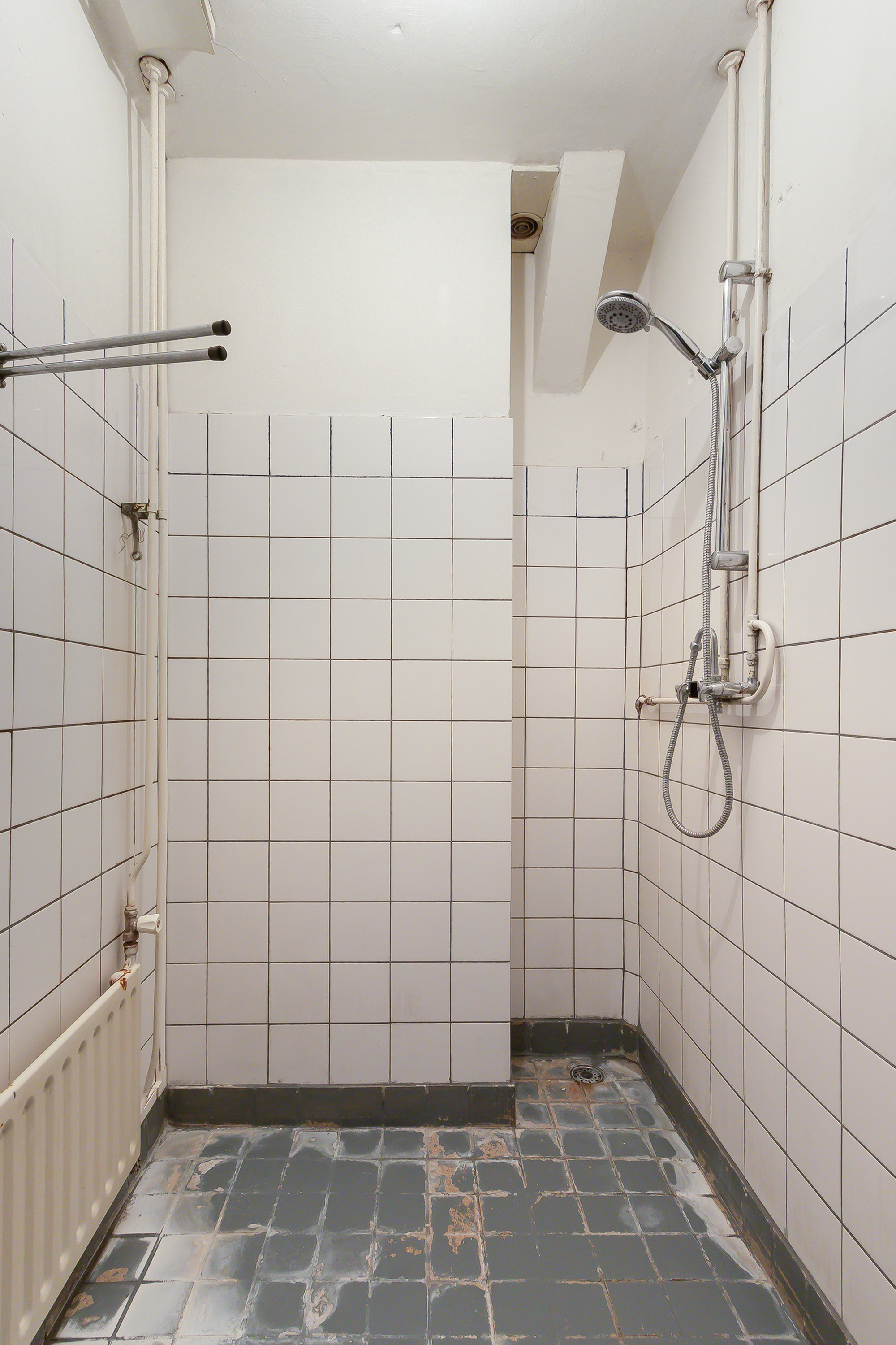 - Badkamer met gedeeltelijk betegelde wanden, open doucheruimte met rvs thermostaatkraan met douchekop en radiator.